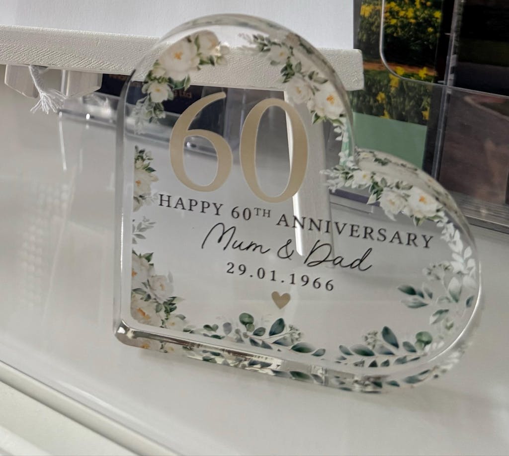 Beautiful acrylic crystal heart block personalised for that special anniversary milestone.