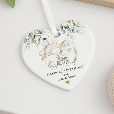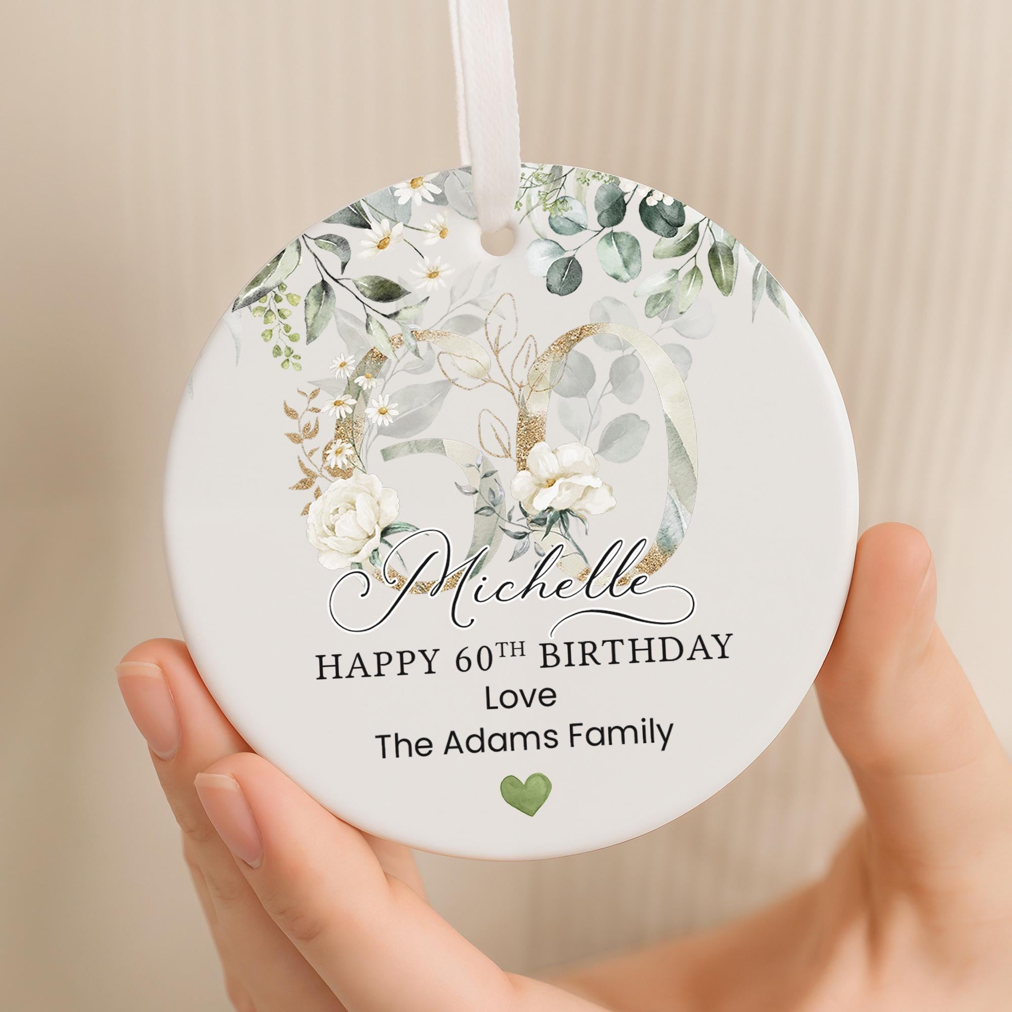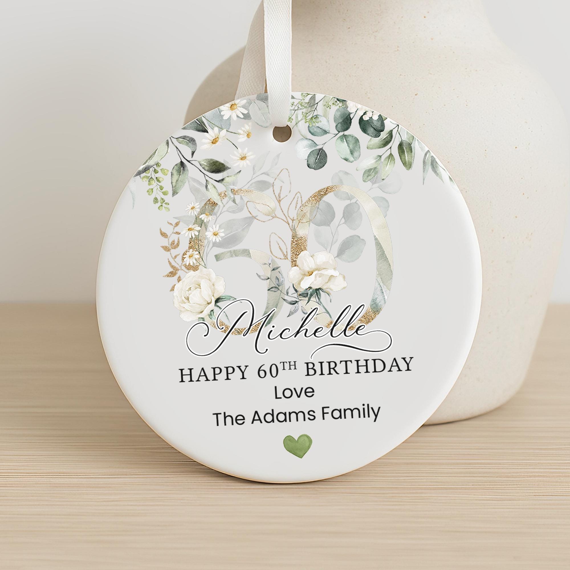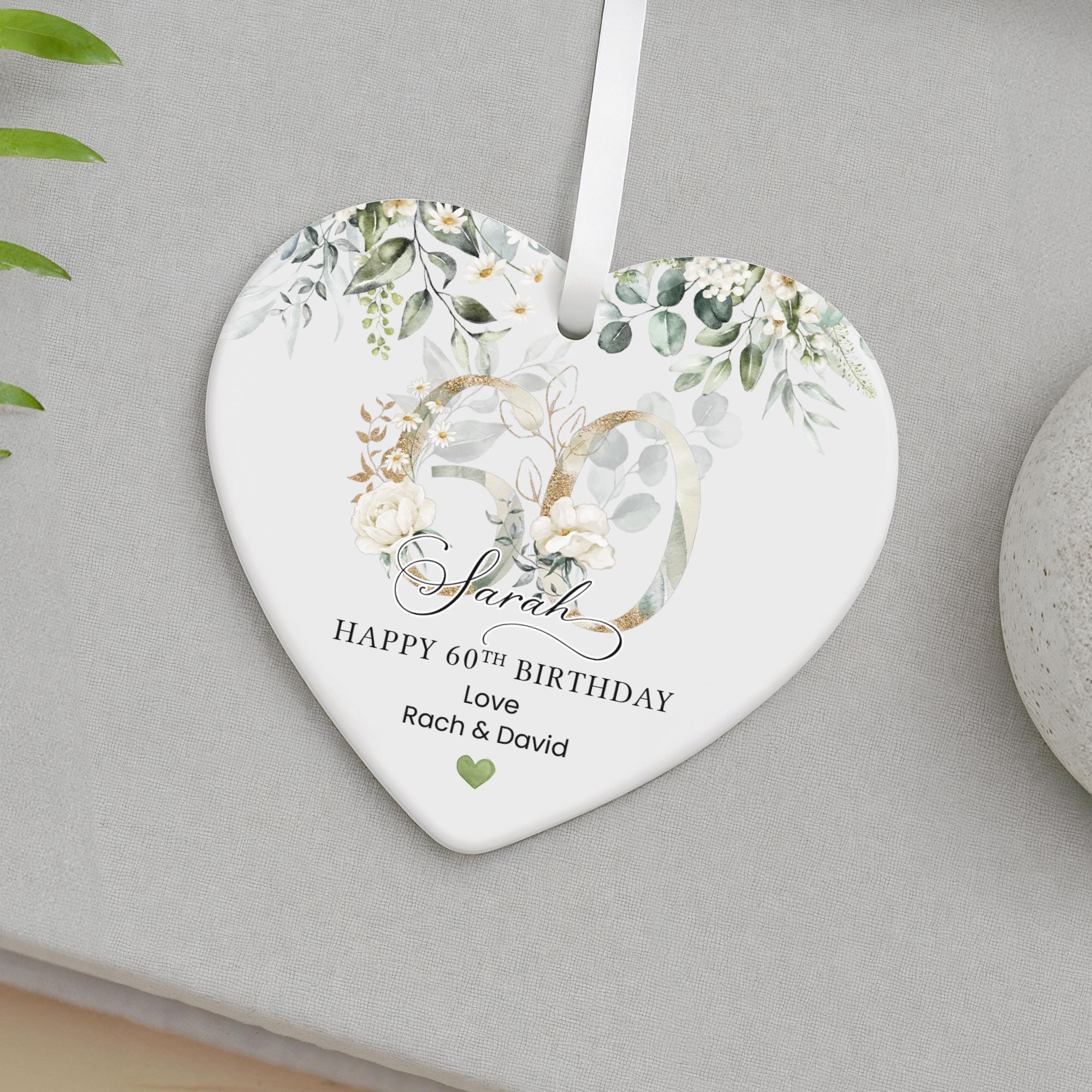 Personalised Happy 60th Birthday Ceramic Gift Plaque Green Eucalyptus Floral