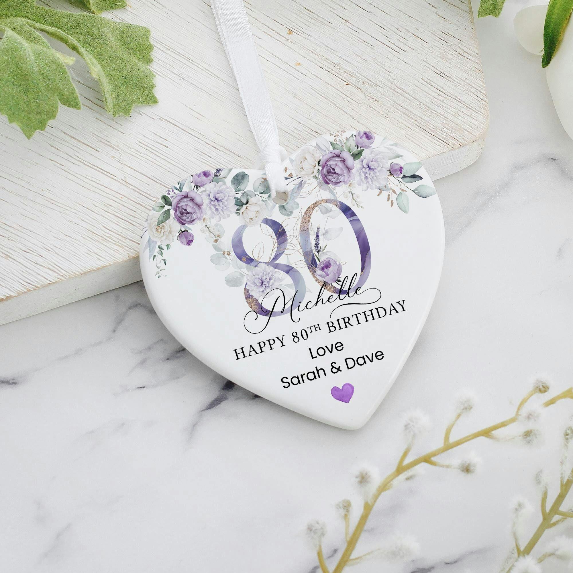 Personalised Purple Floral Happy 80th Birthday Heart Ceramic Keepsake