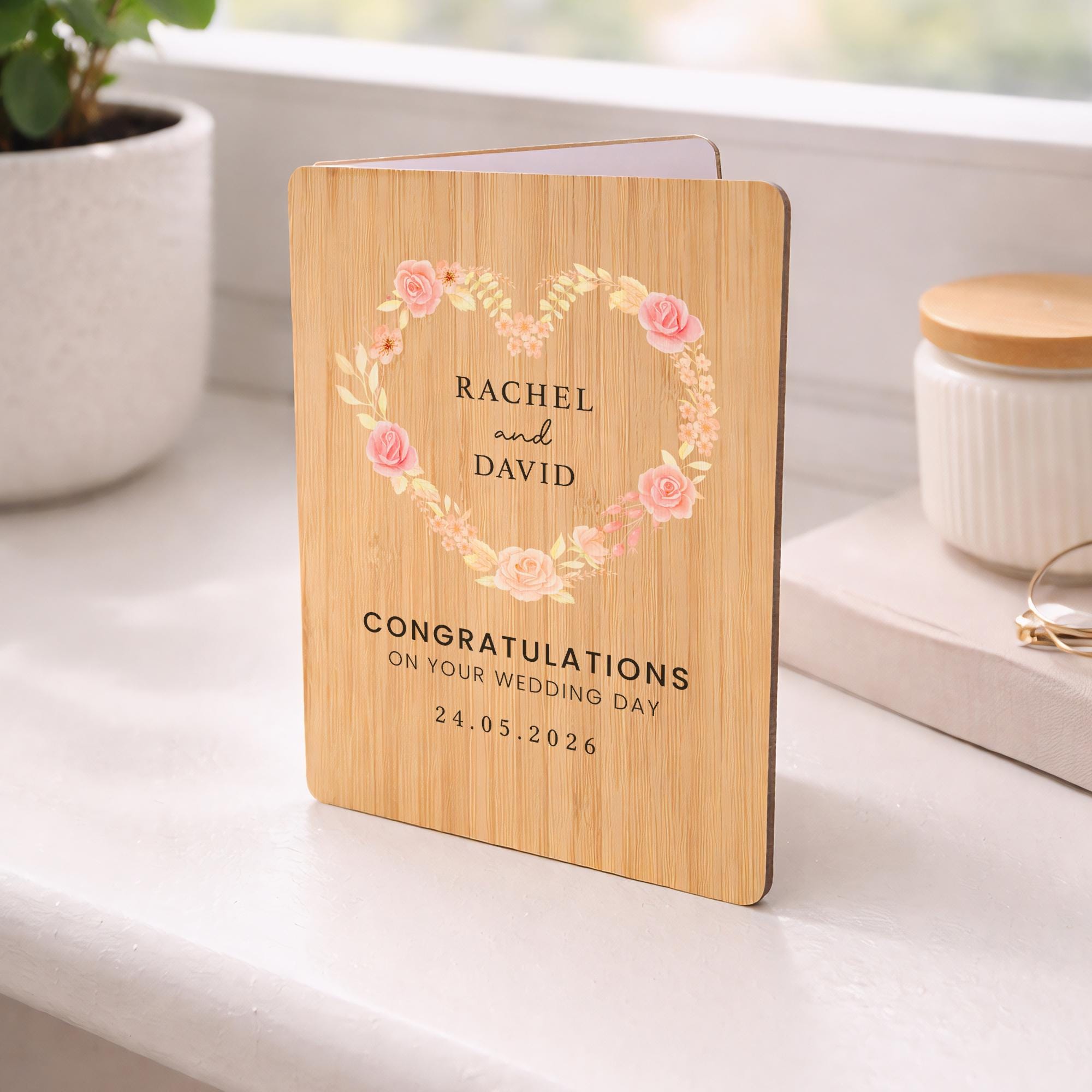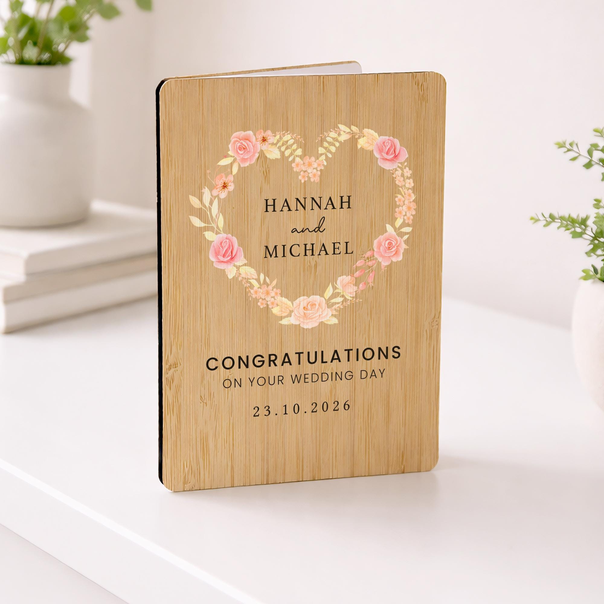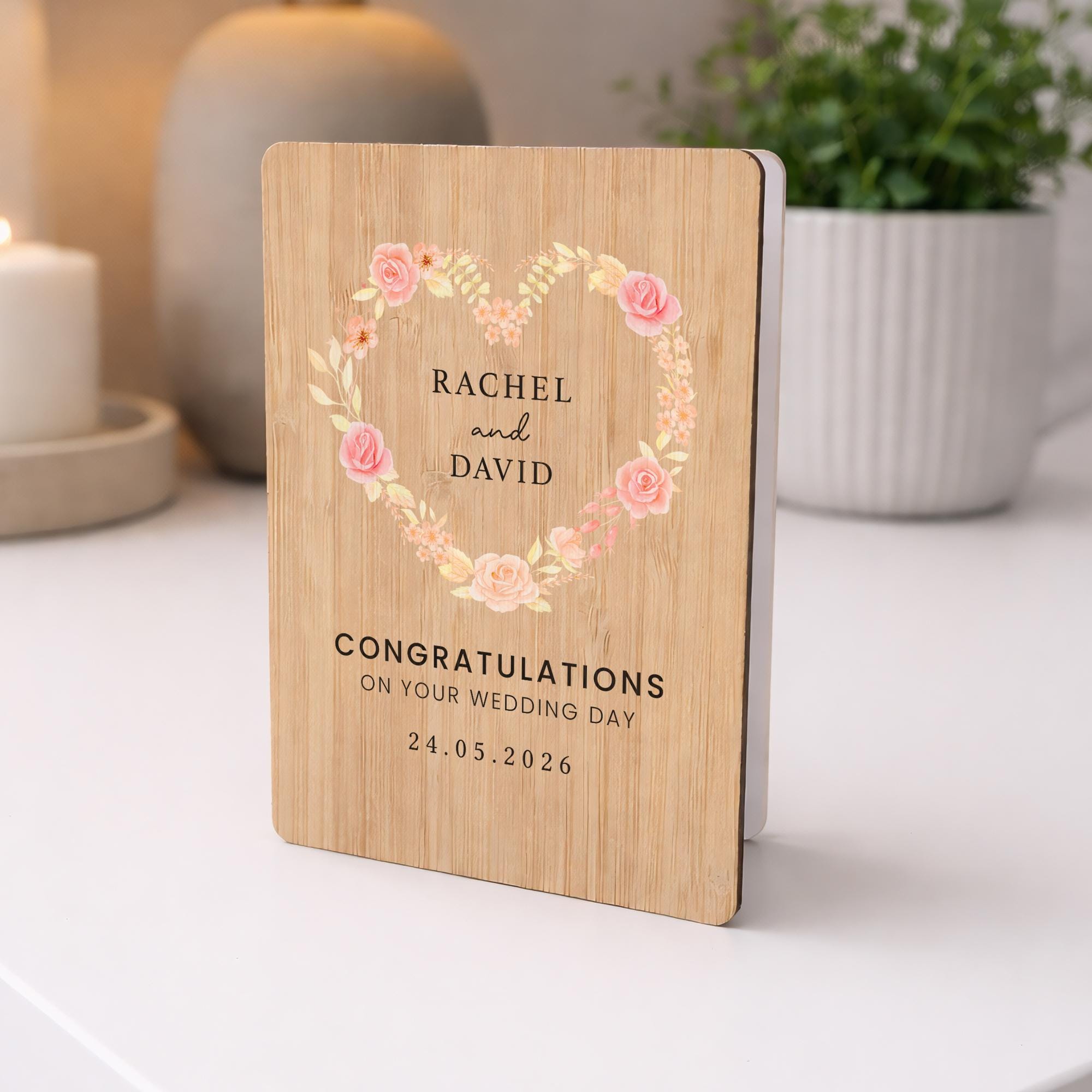 Personalised Flower Heart Mr & Mrs Wedding Day Card Bamboo Wood Keepsake