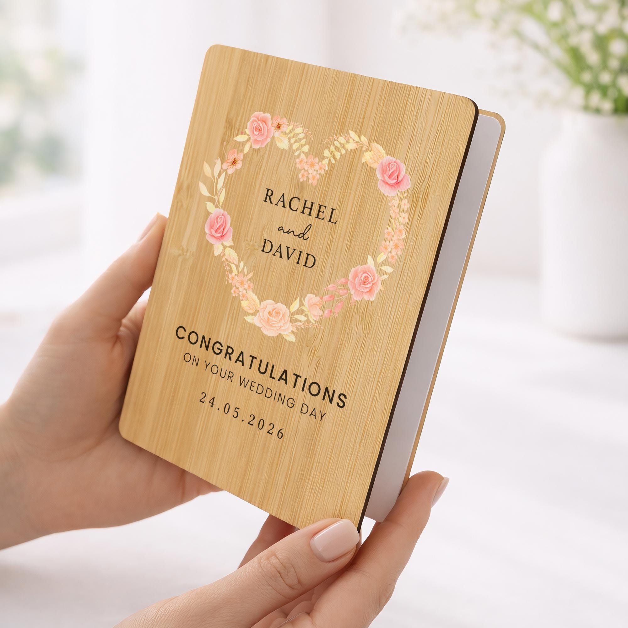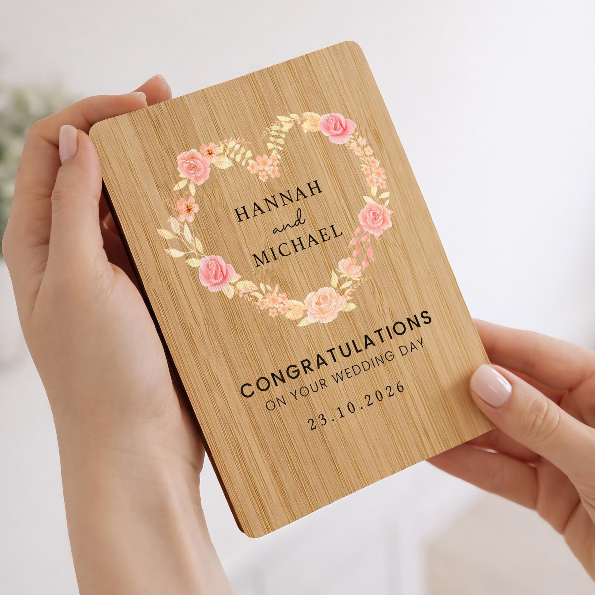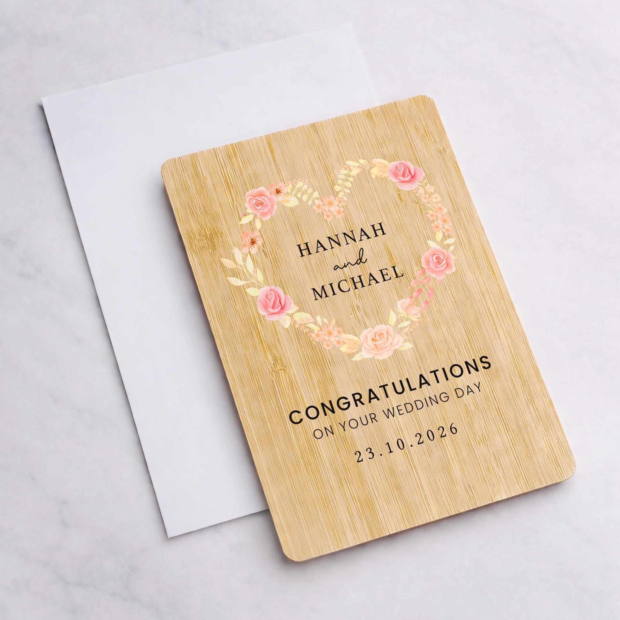 Personalised Flower Heart Mr & Mrs Wedding Day Card Bamboo Wood Keepsake
