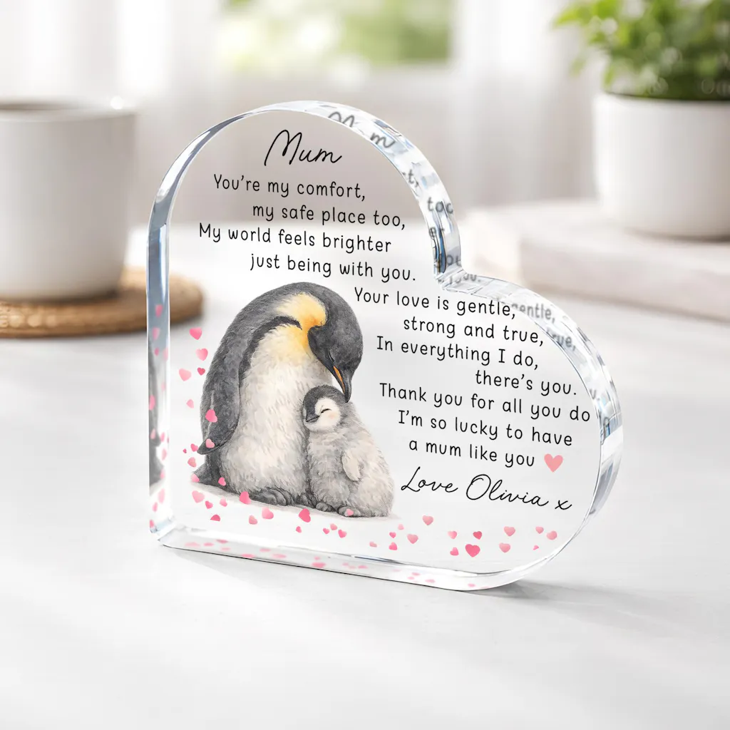 Personalised Poem Keepsake Heart Plaque for Mum - Penguin & Baby