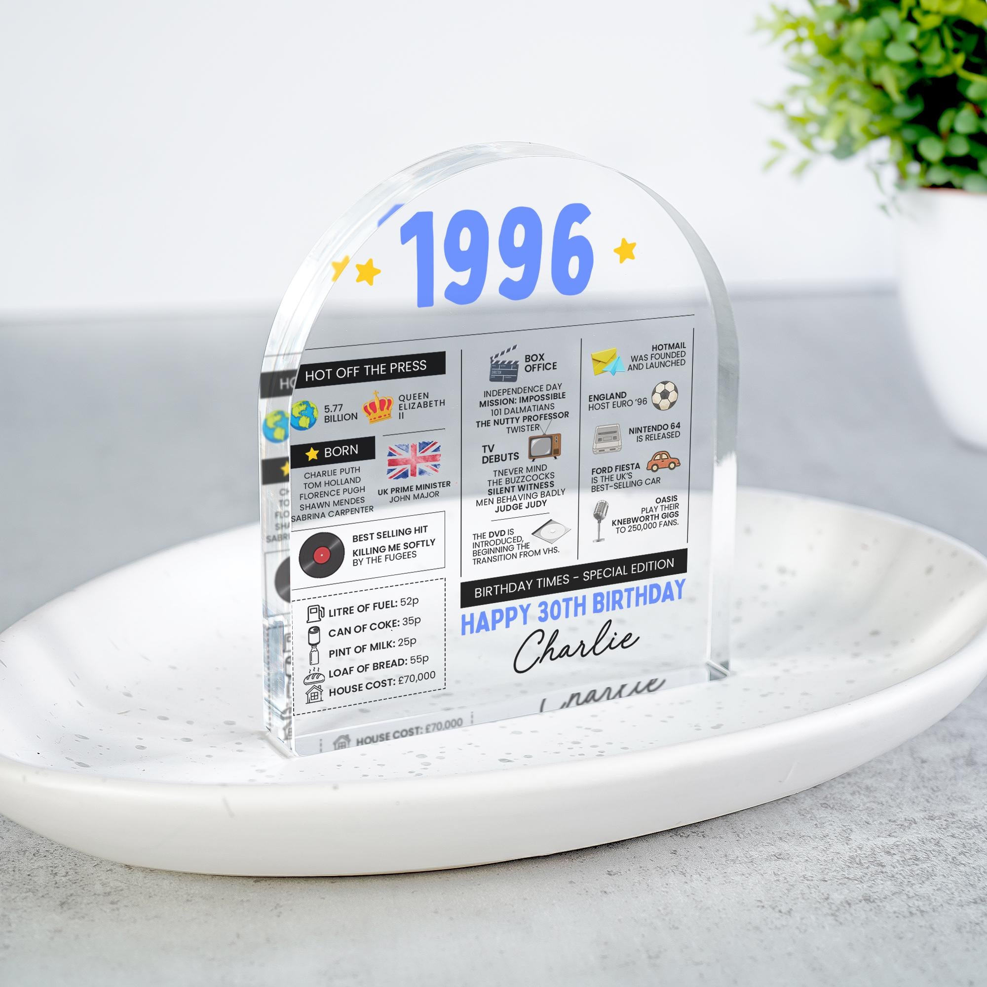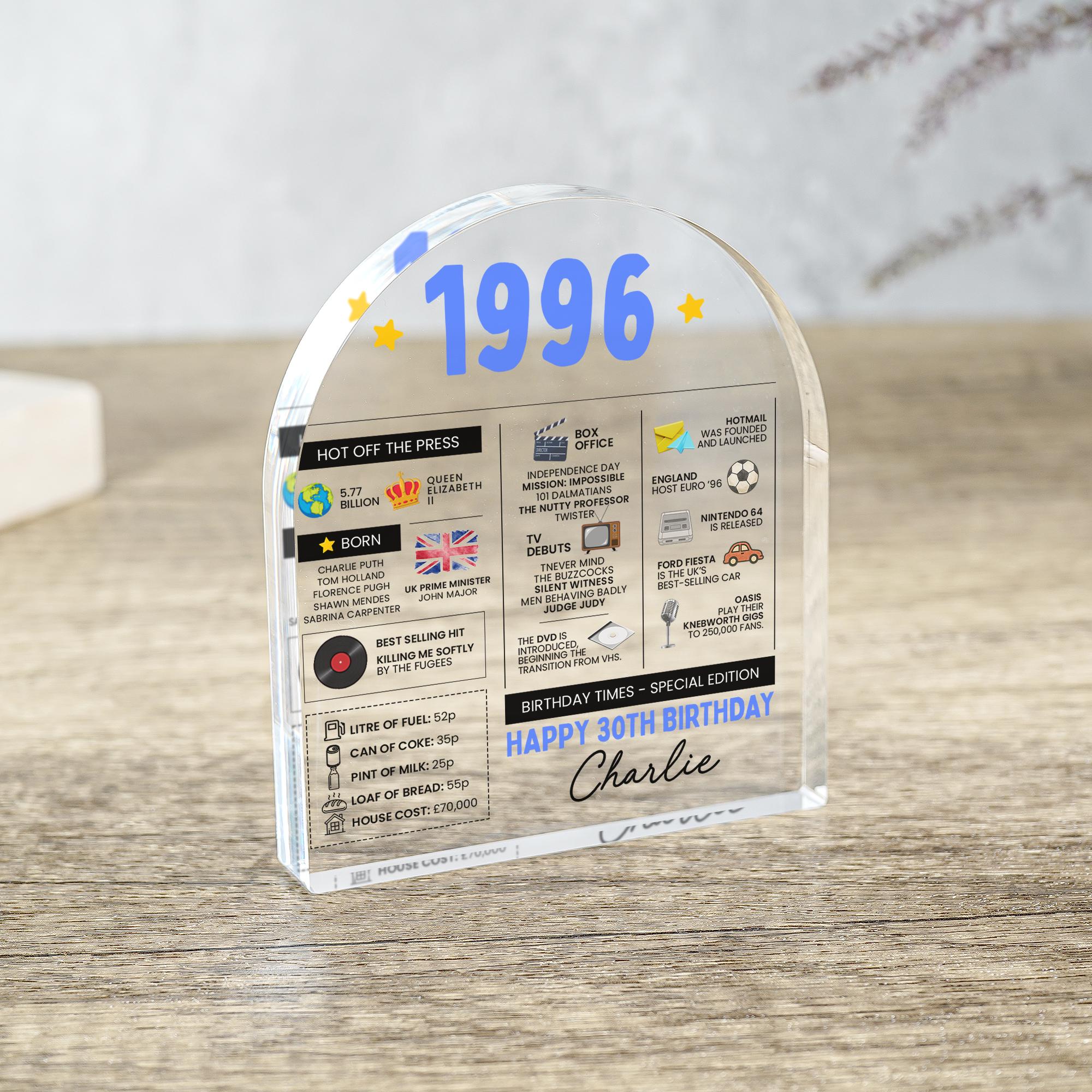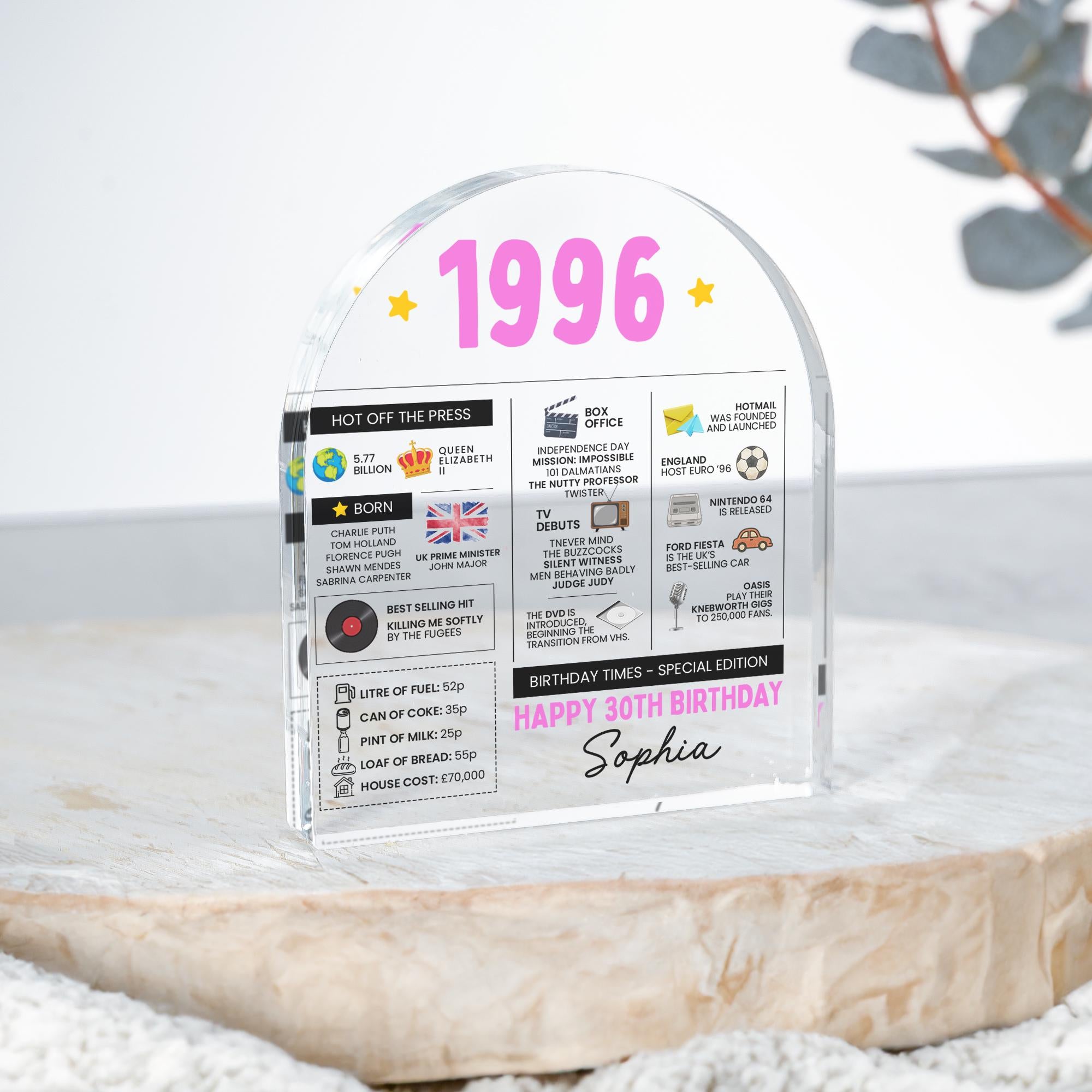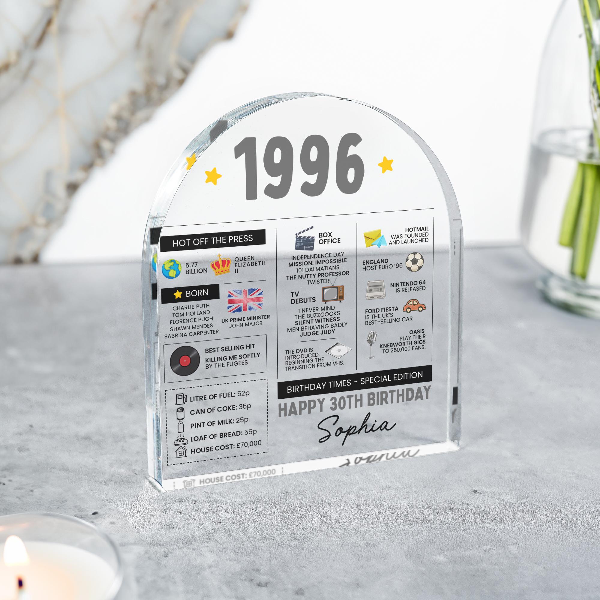 Personalized Happy 30th Birthday Keepsake Plaque Born in 1996 Fun Facts Gift for Her/Him