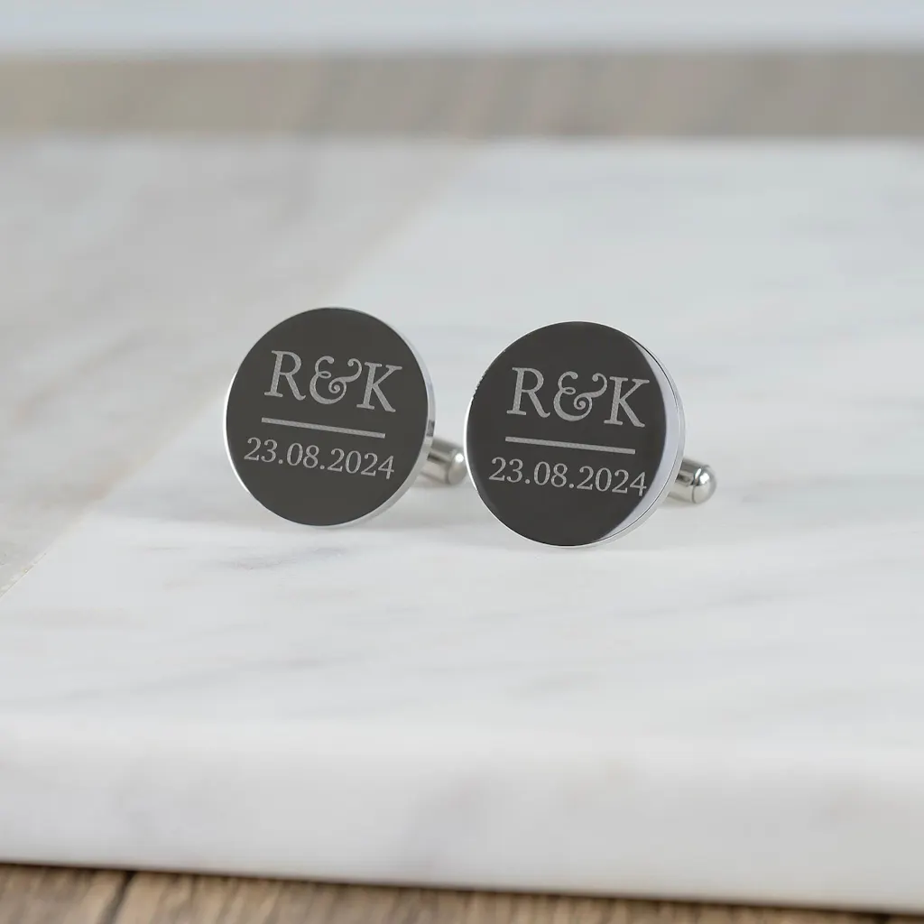 Beautiful round stainless steel cufflinks made to order. Engrave with your initials and wedding date.