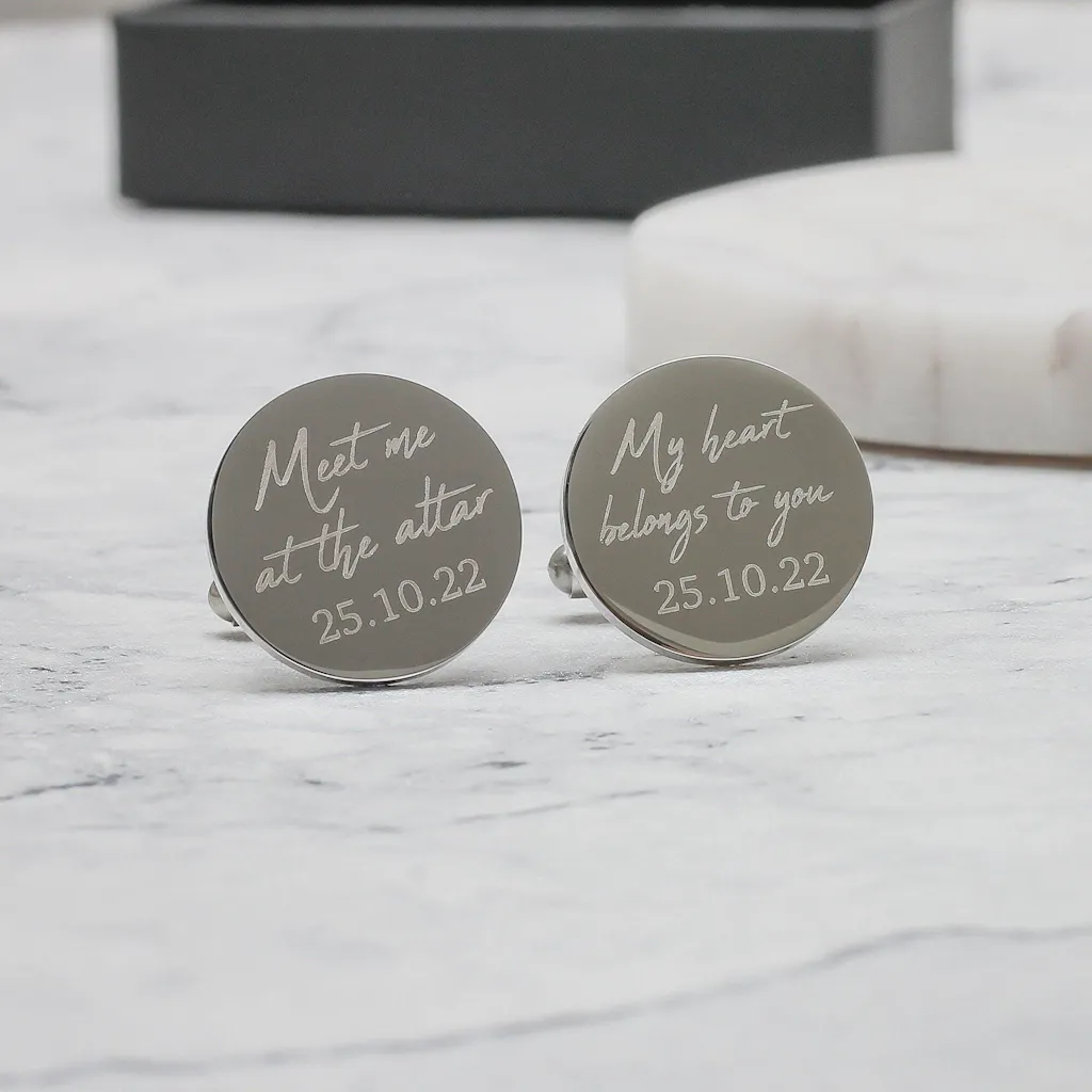Beautiful round stainless steel cufflinks made to order. Engrave with your wedding date to complete the design.