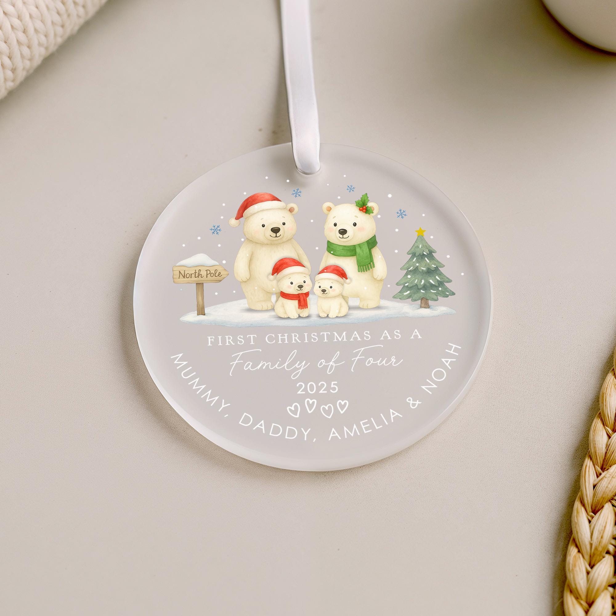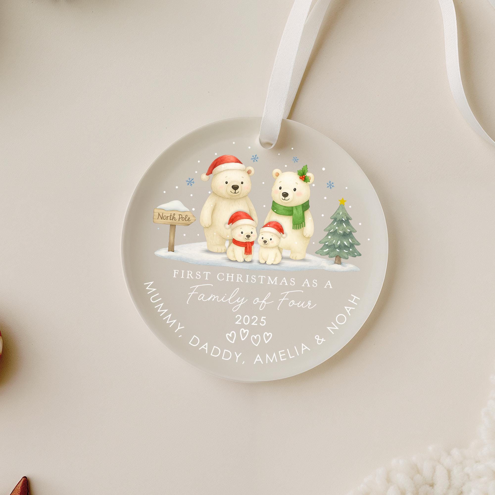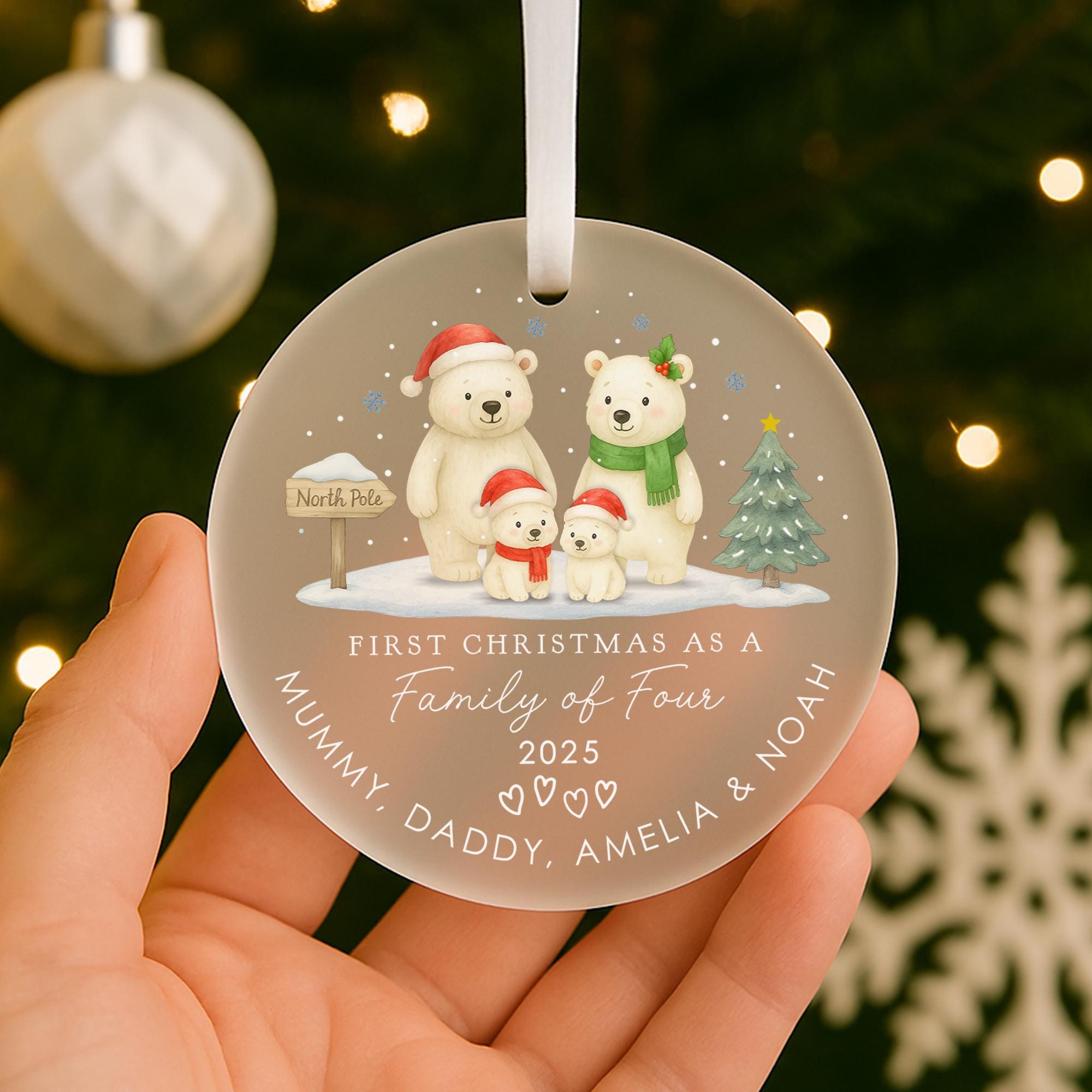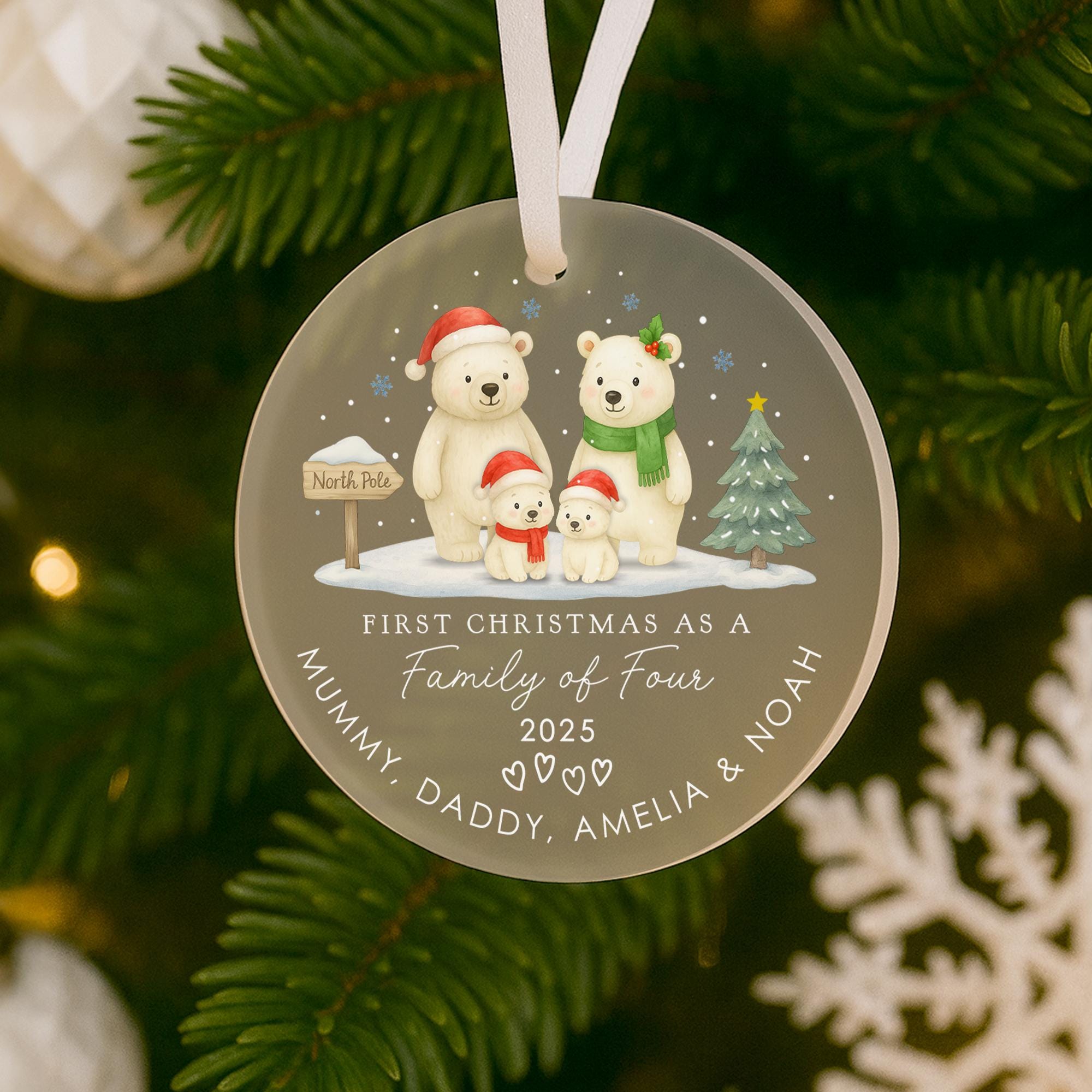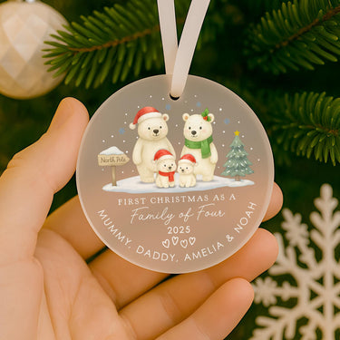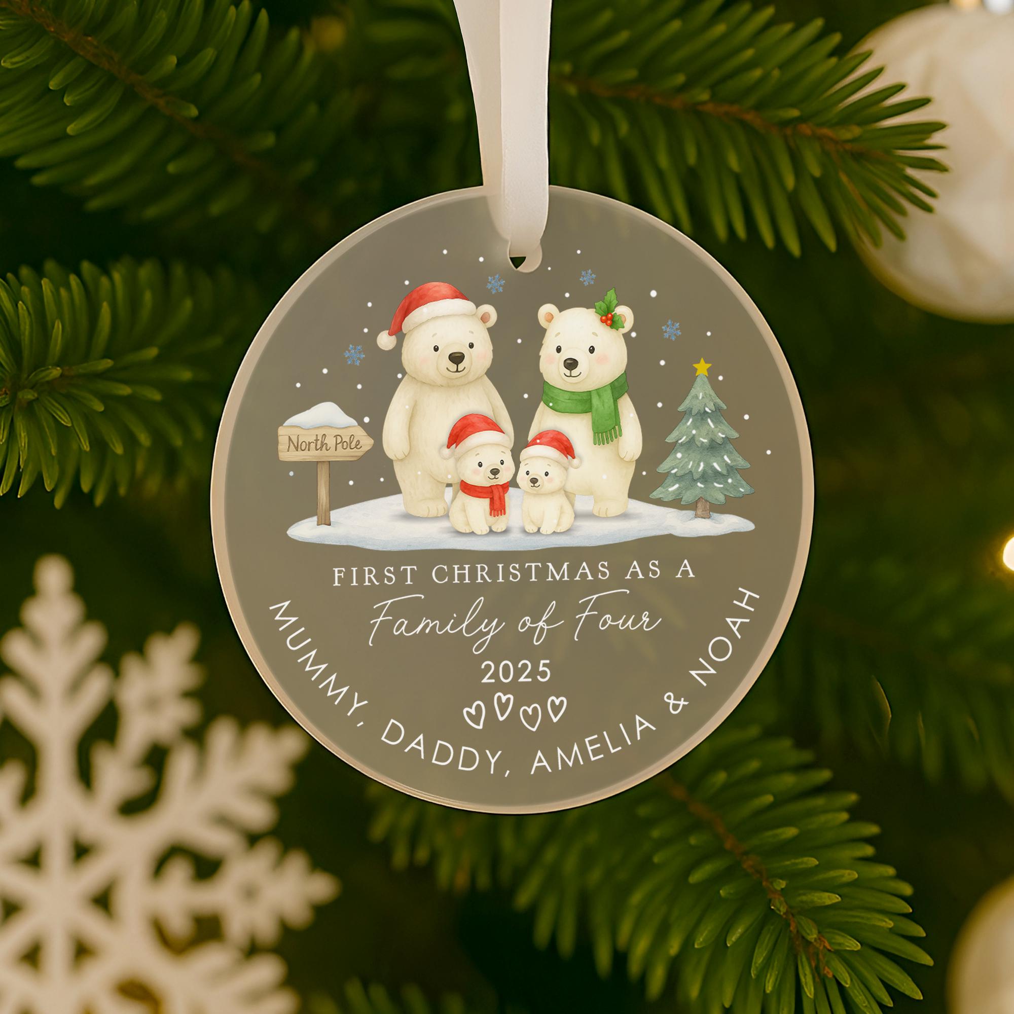 Personalised Baby Polar Bear Family First Christmas as Family of 4 Ornament Tree Decoration Frosted Acrylic
