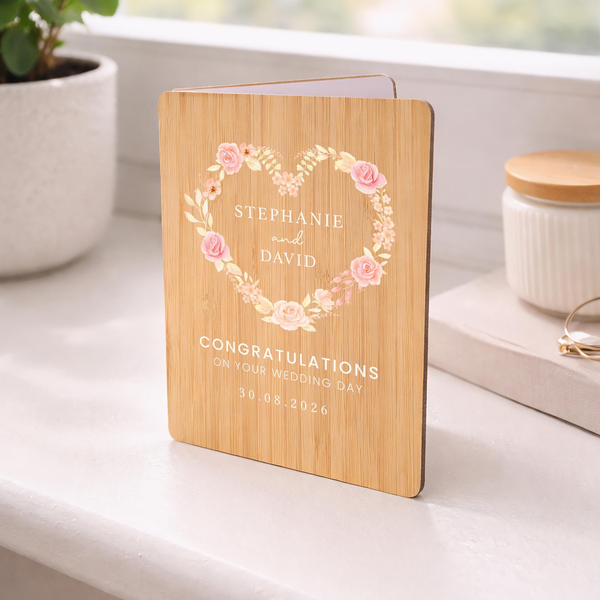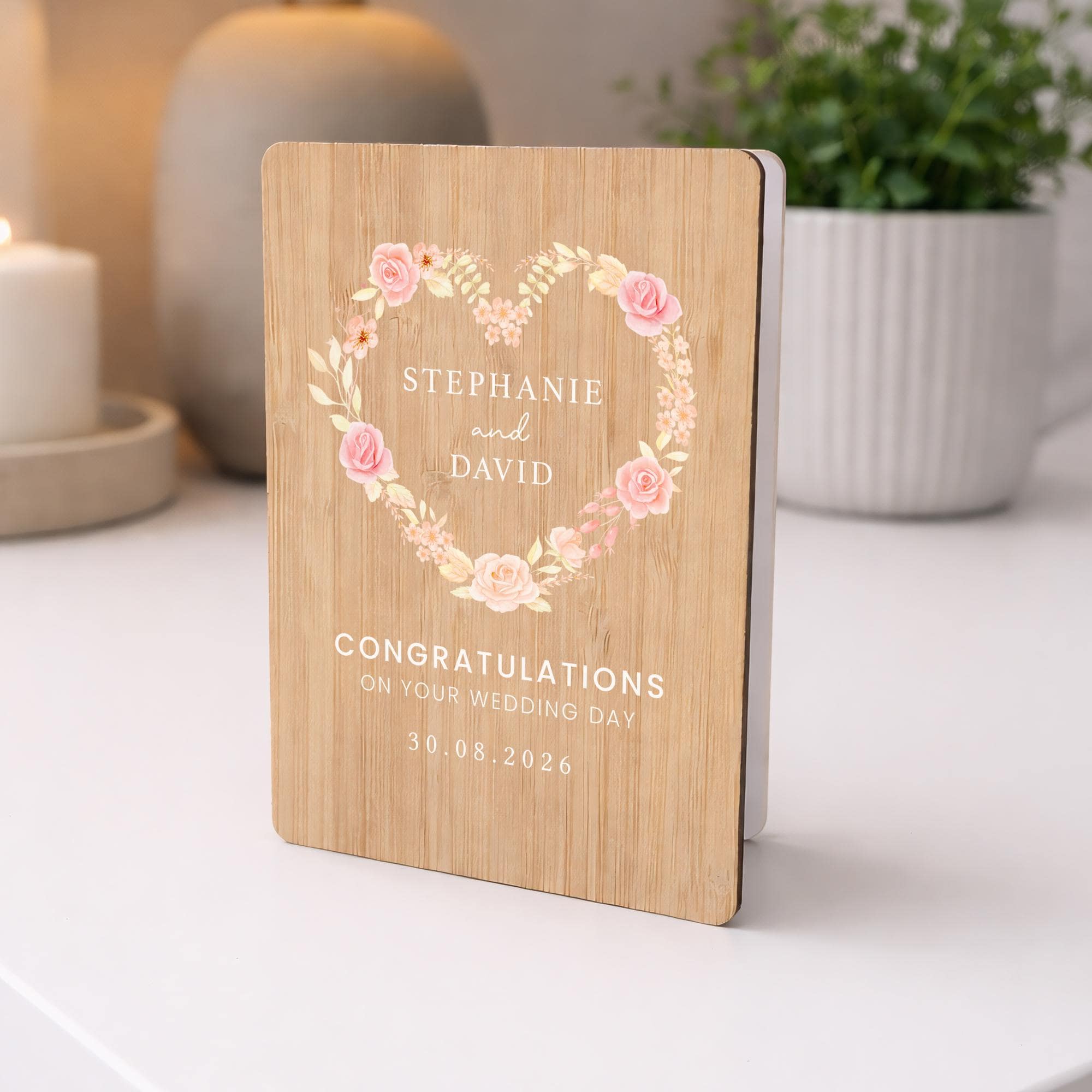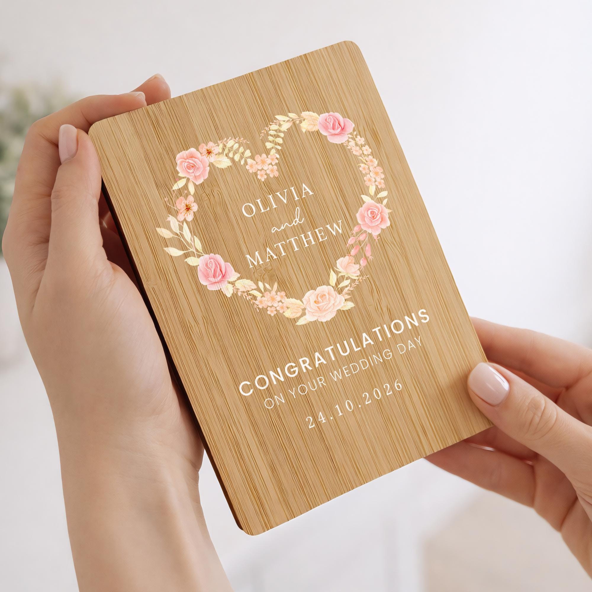Personalised Flower Heart Mr & Mrs Wedding Day Card Bamboo Wood Keepsake