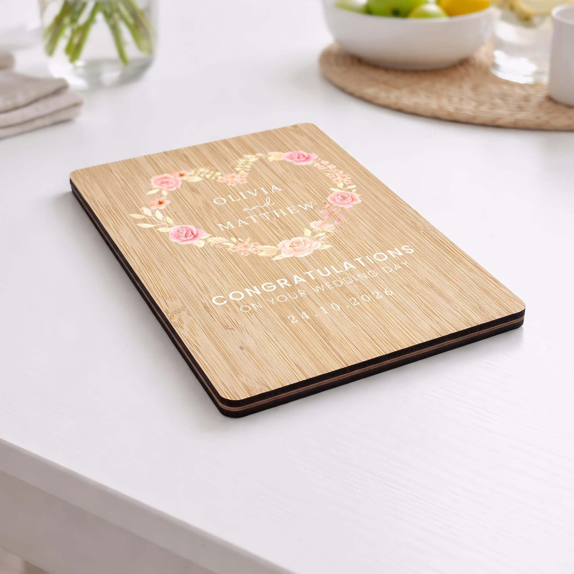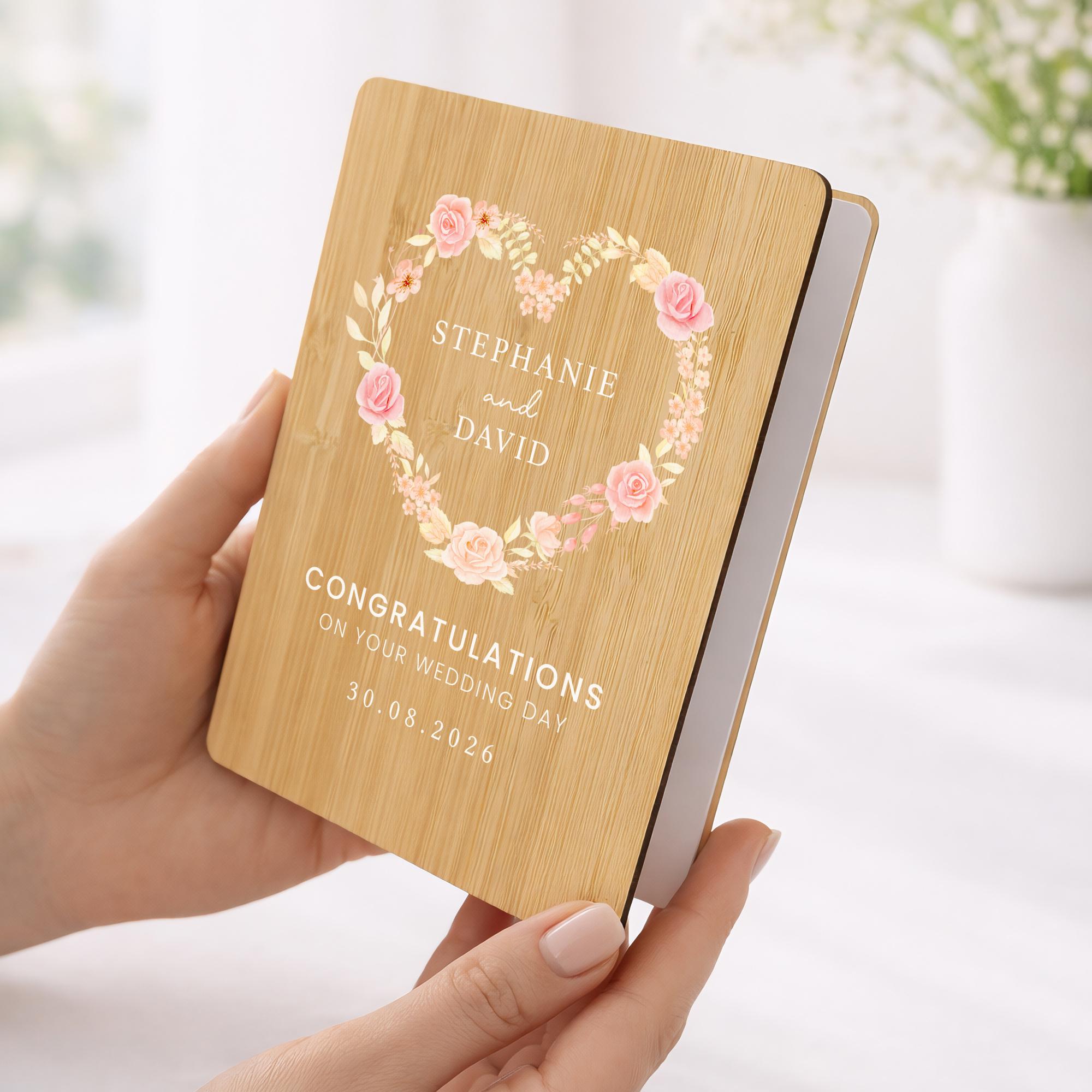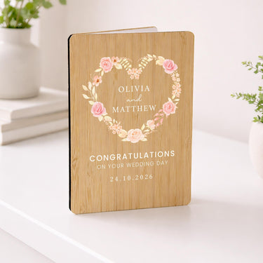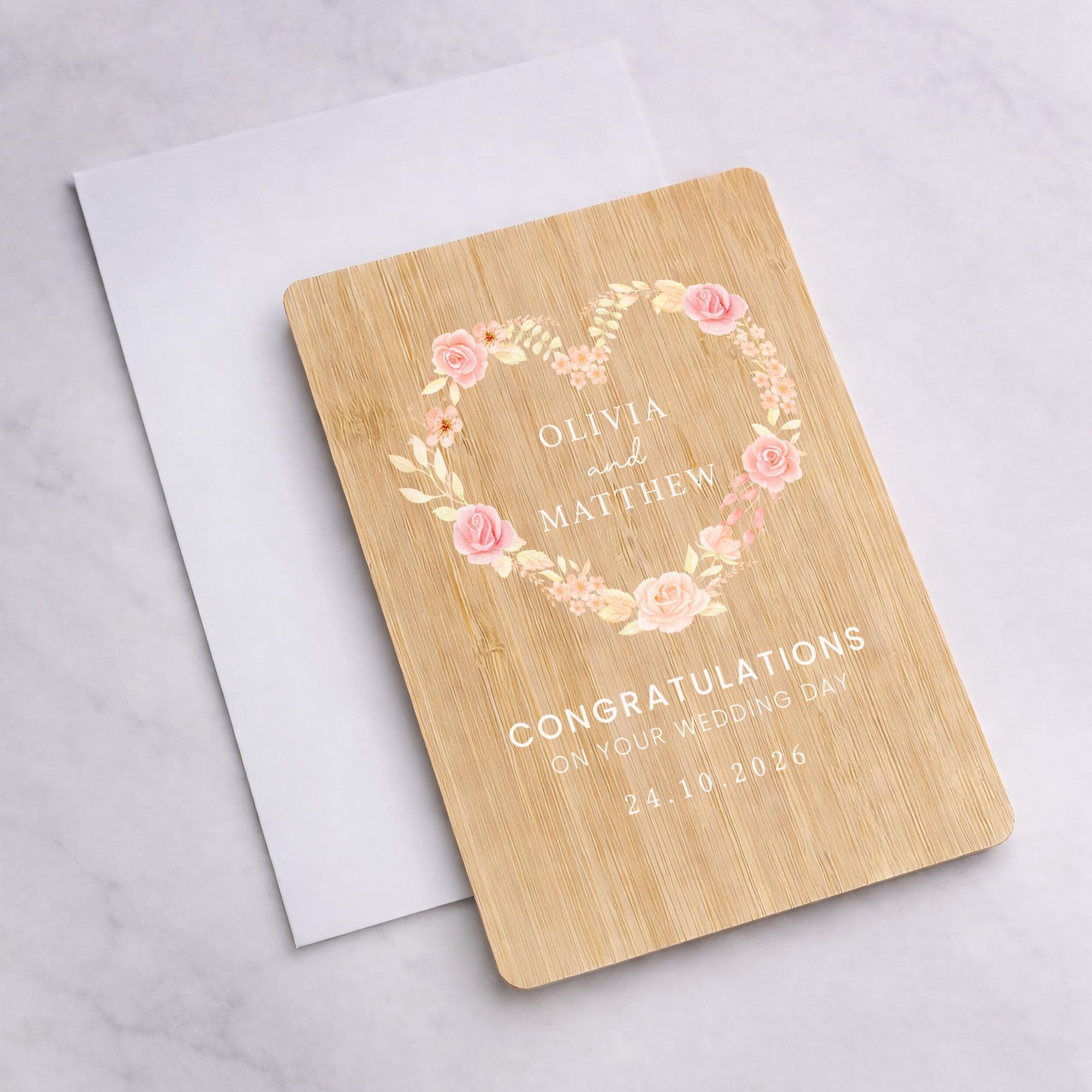 Personalised Flower Heart Mr & Mrs Wedding Day Card Bamboo Wood Keepsake