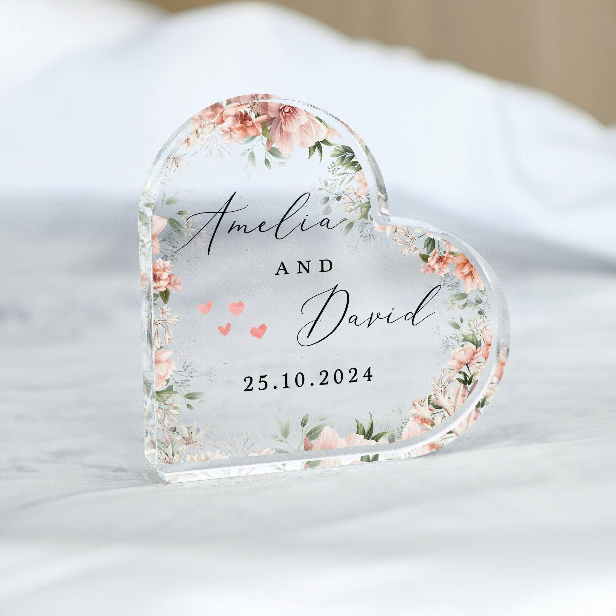 Personalised Pink Floral Wedding Engagement Heart Plaque Gift