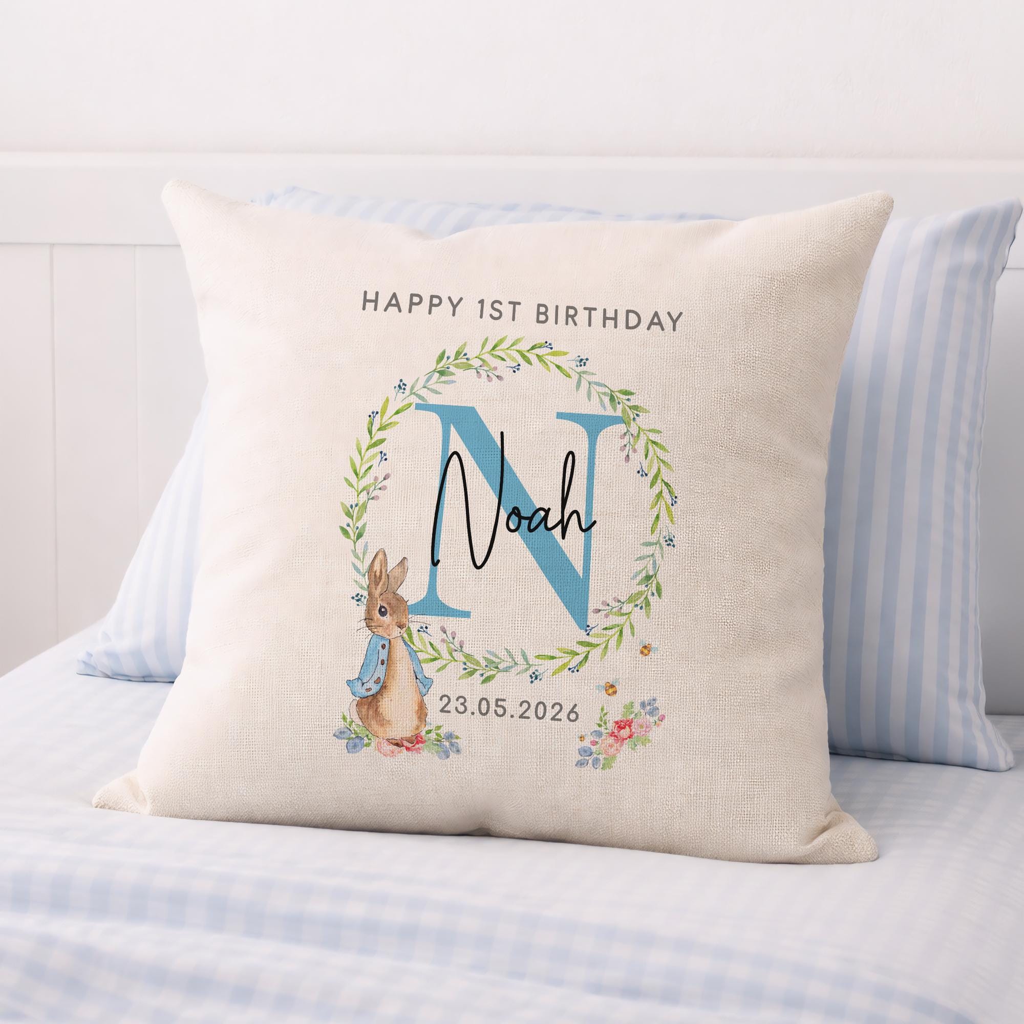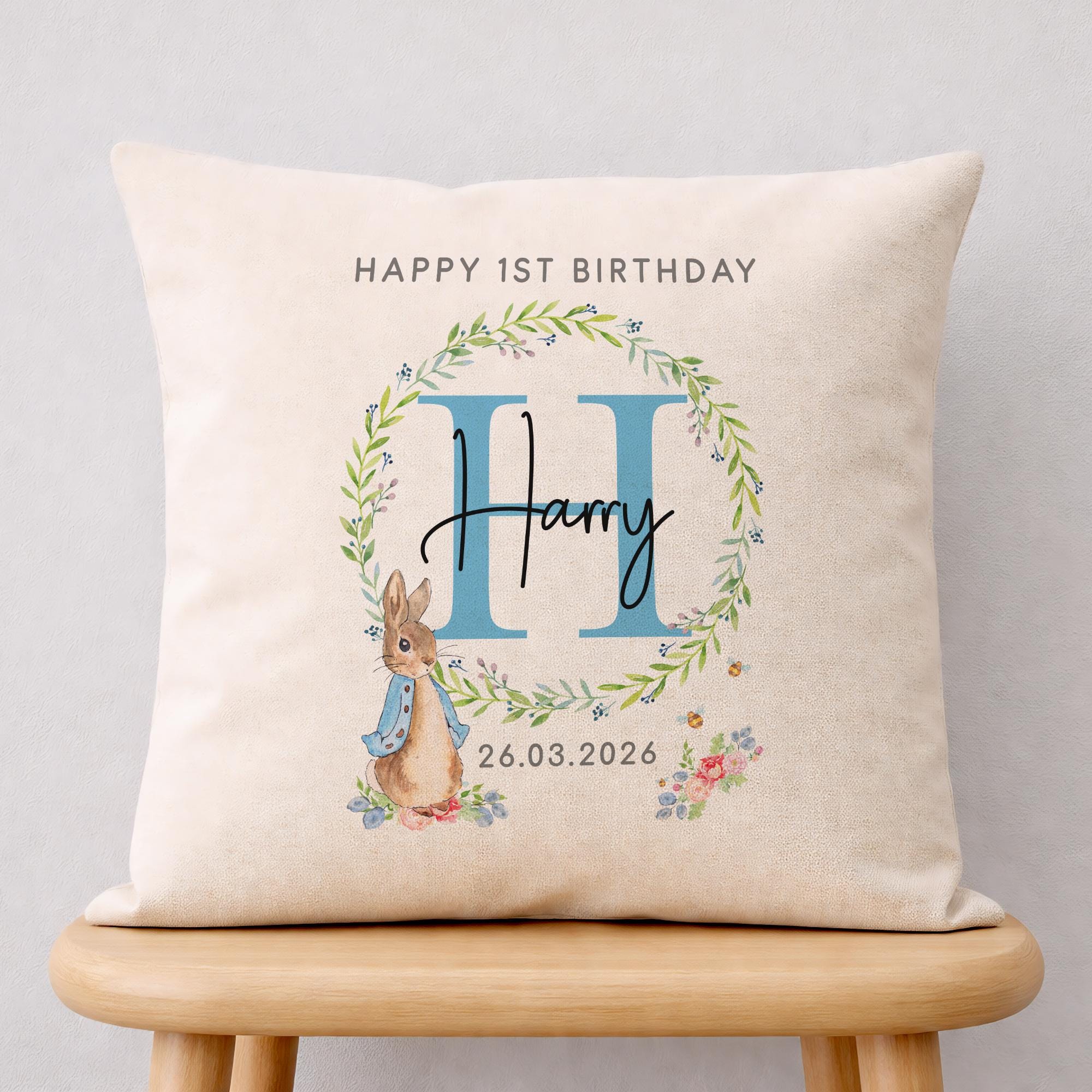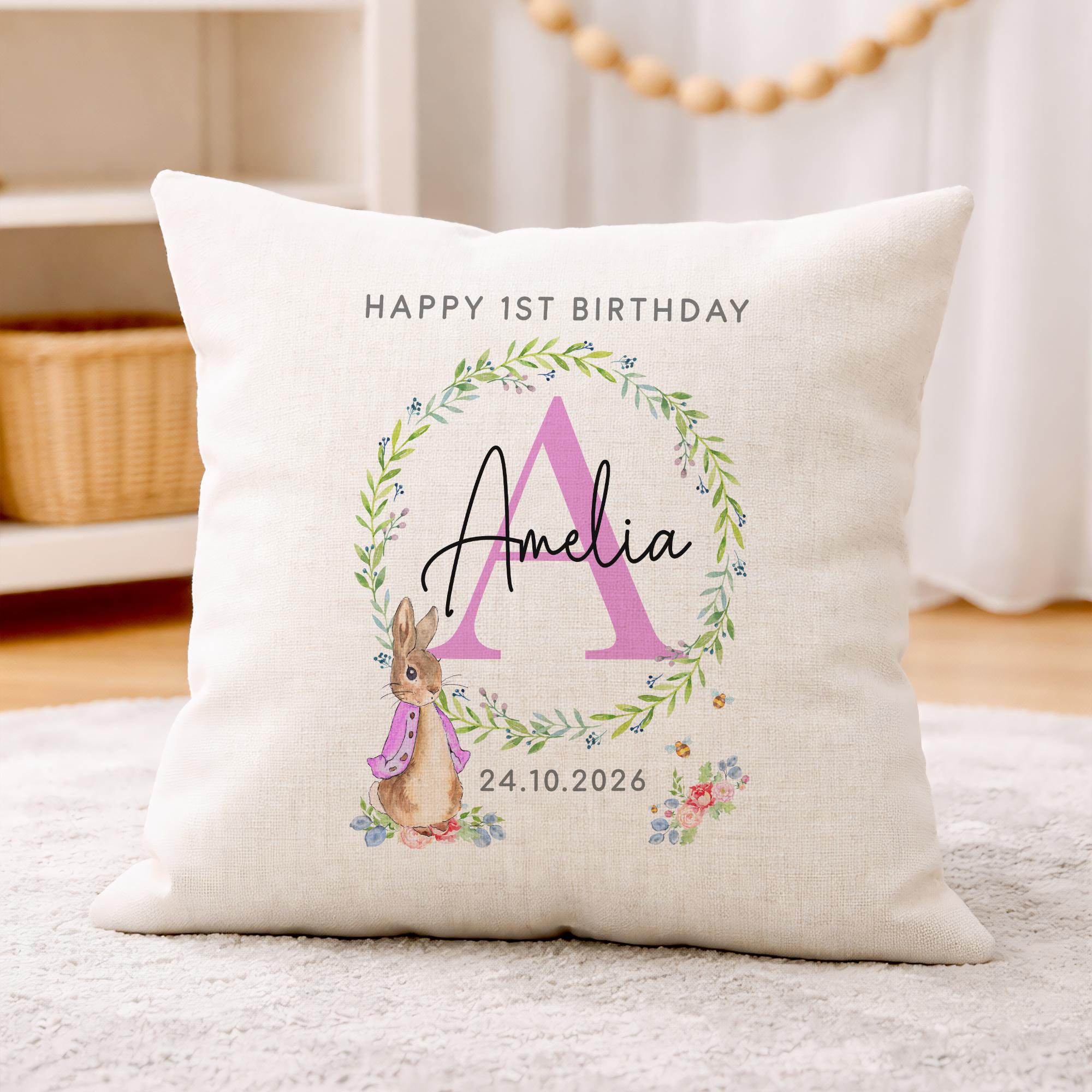 Personalised Happy 1st Birthday Peter Rabbit Cushion