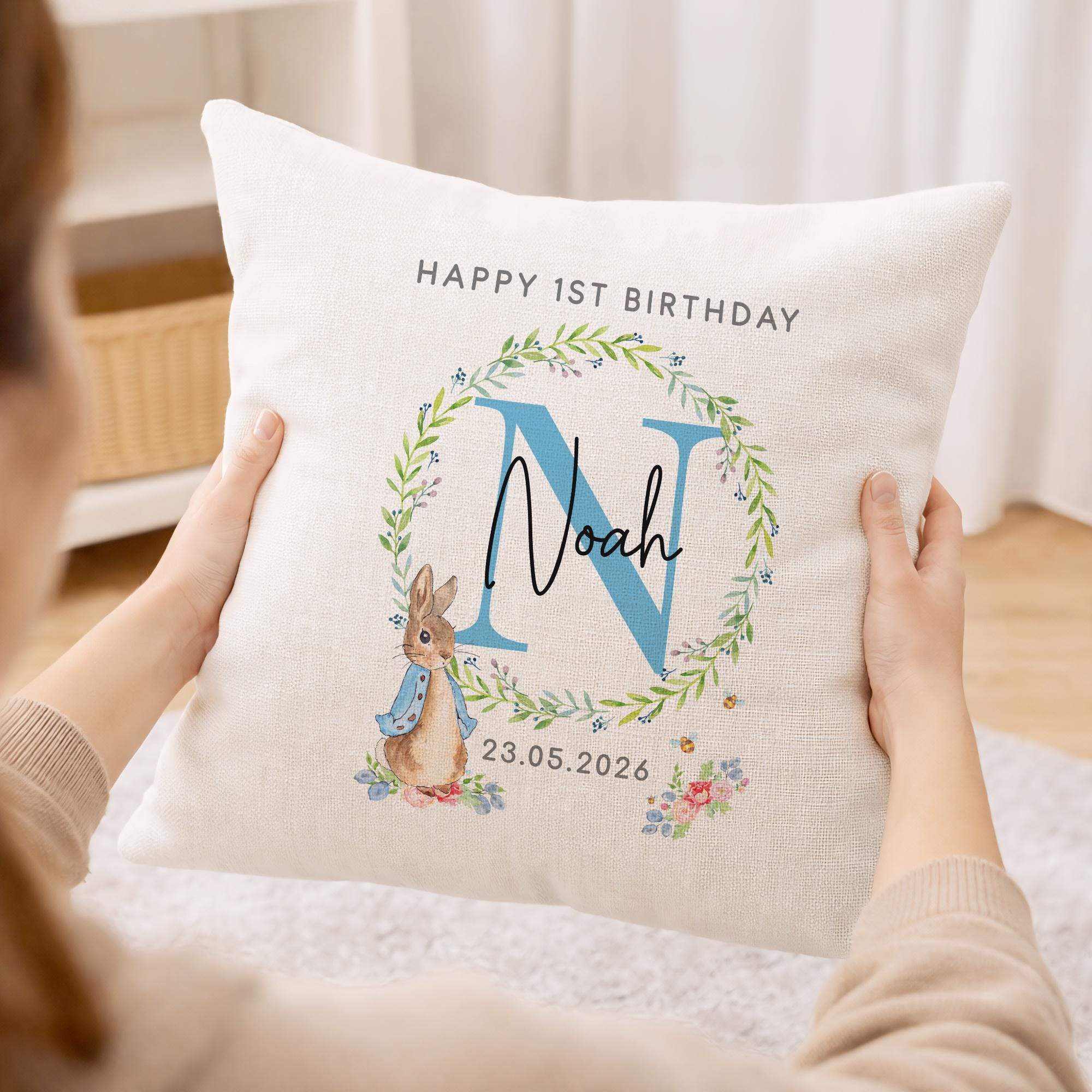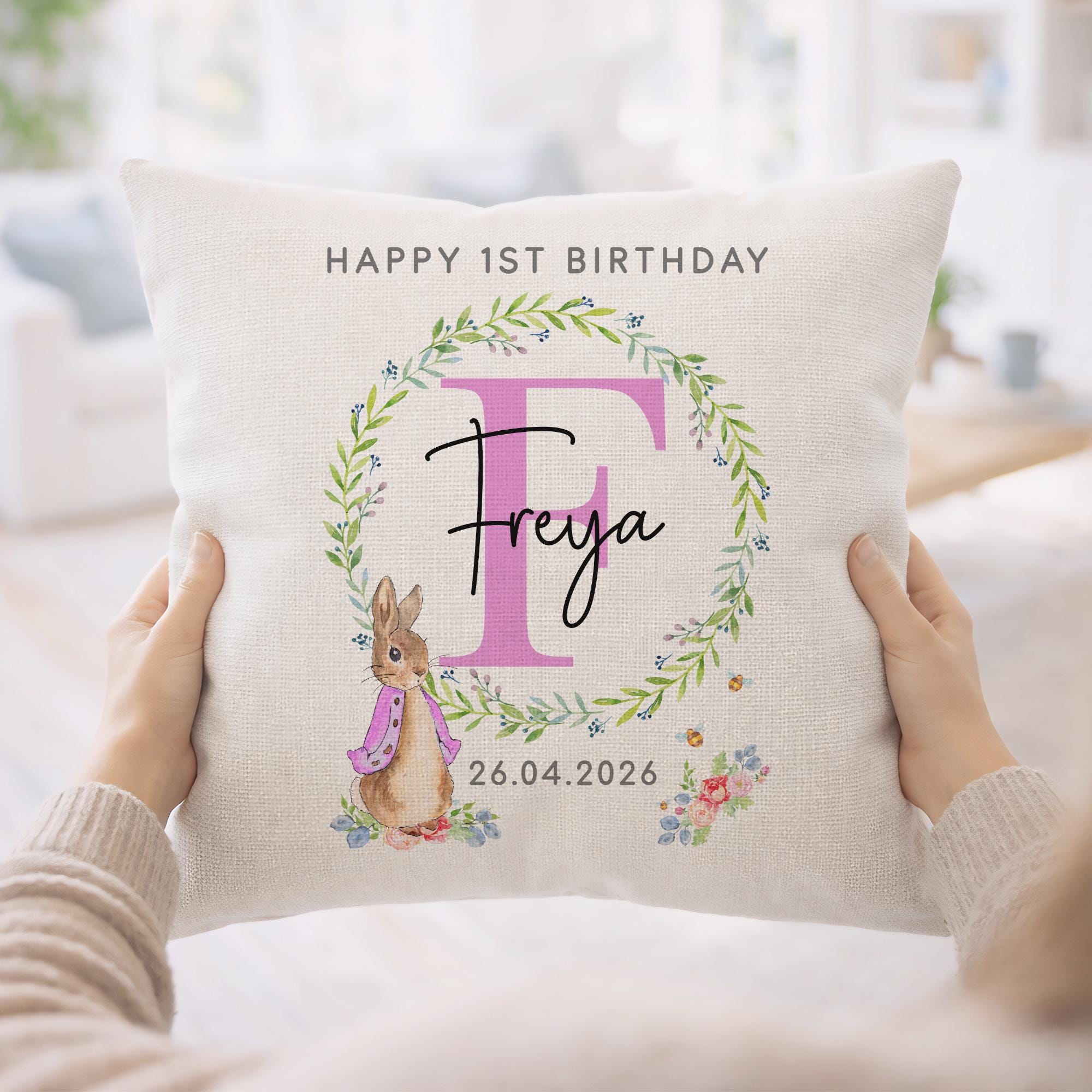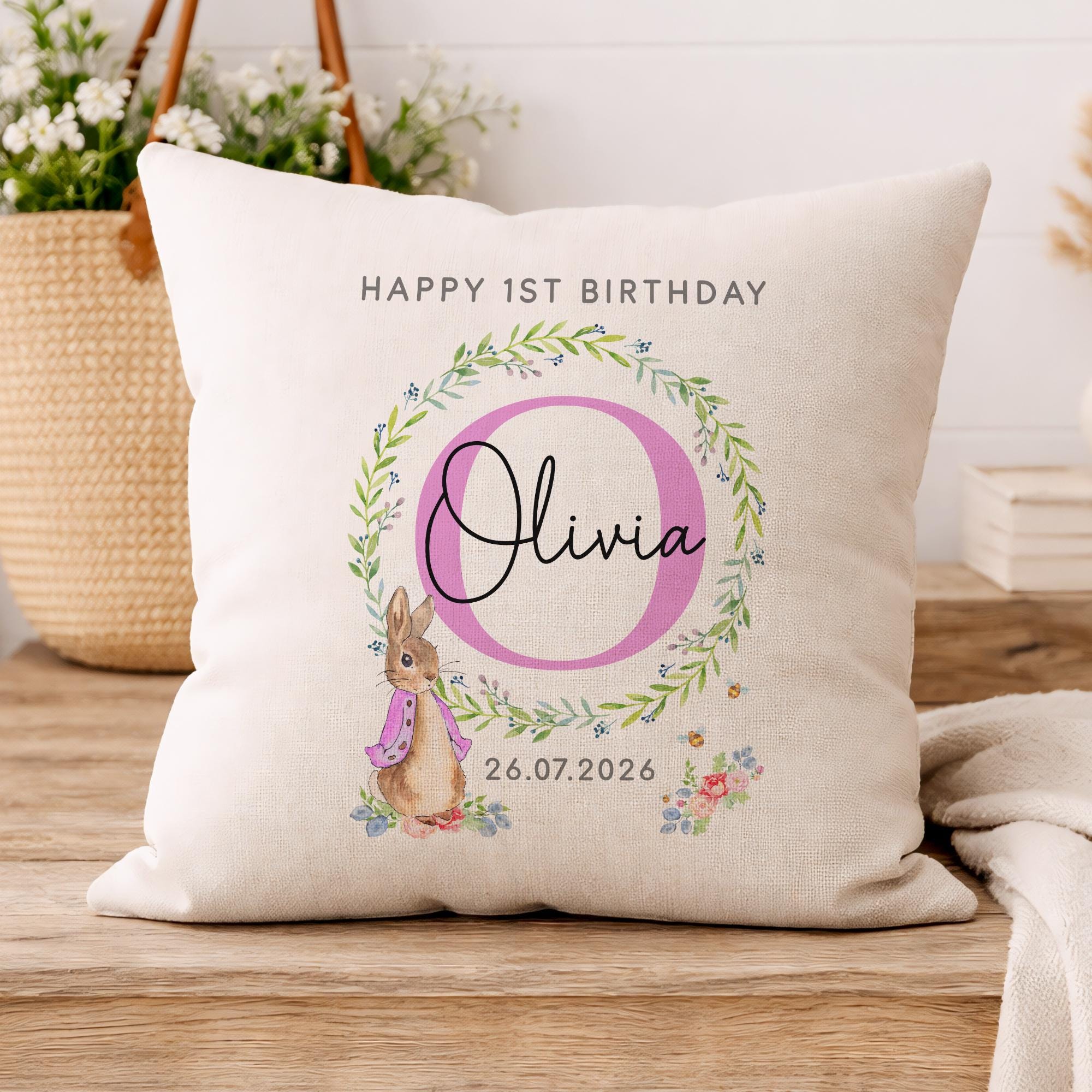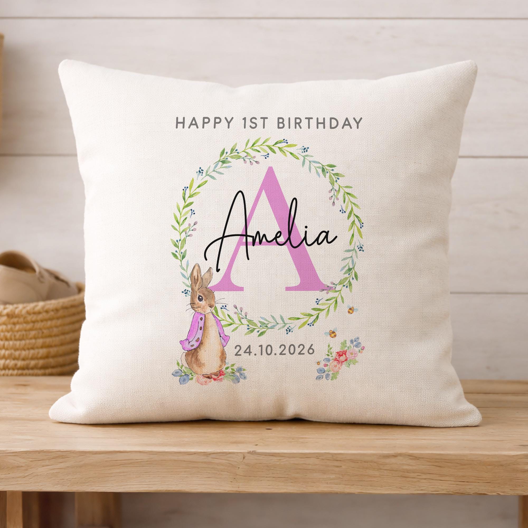 Personalised Happy 1st Birthday Peter Rabbit Cushion
