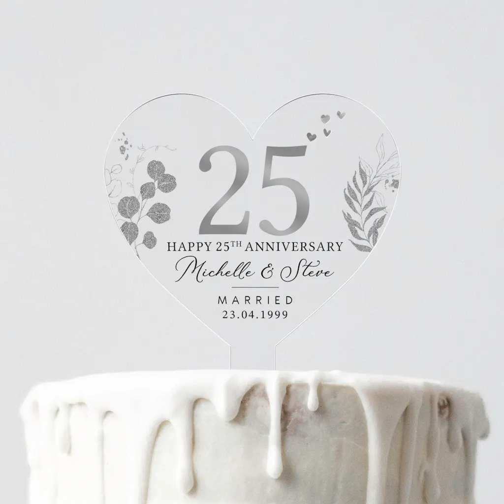 Personalised Silver Floral 25th Anniversary Cake Topper - Silver Anniversary