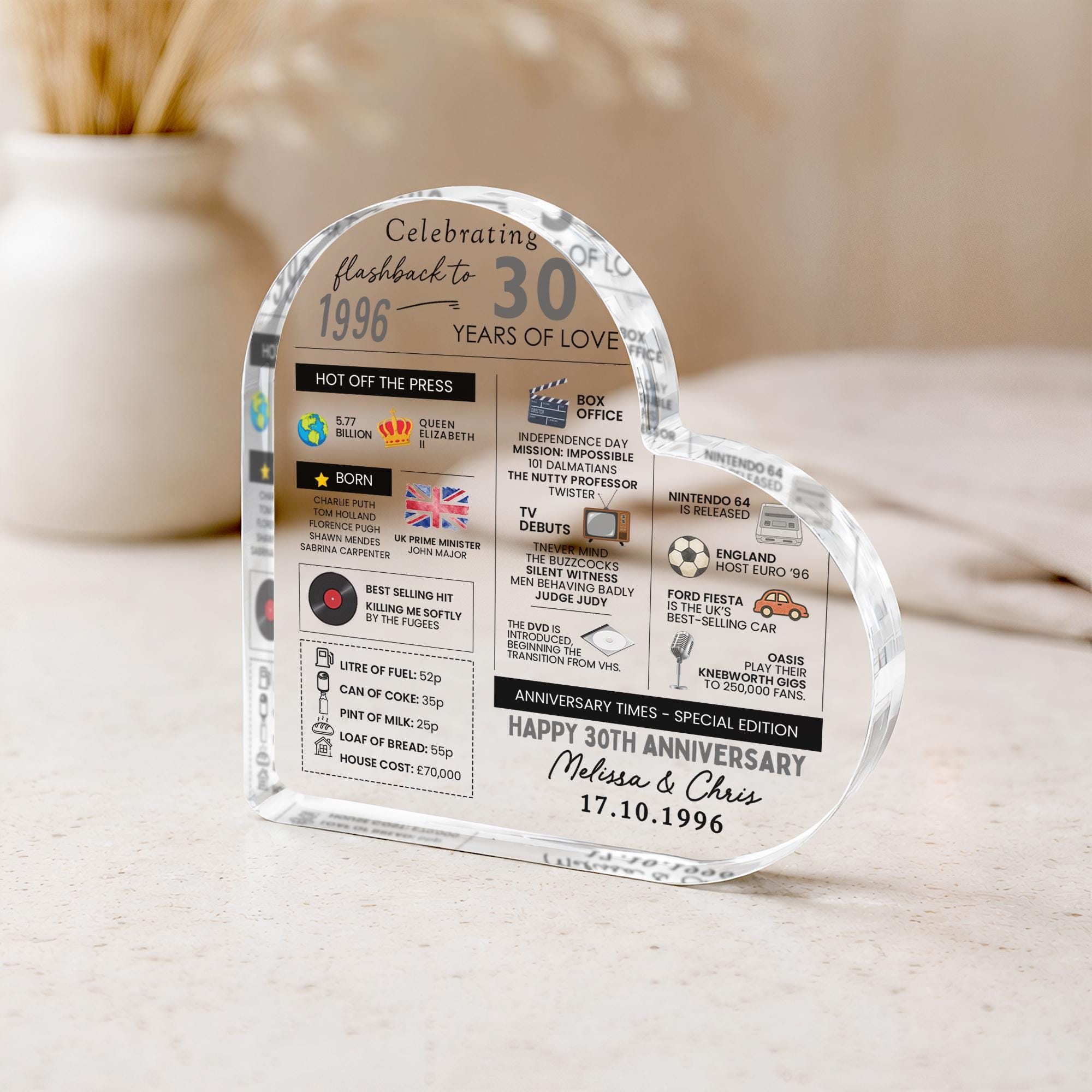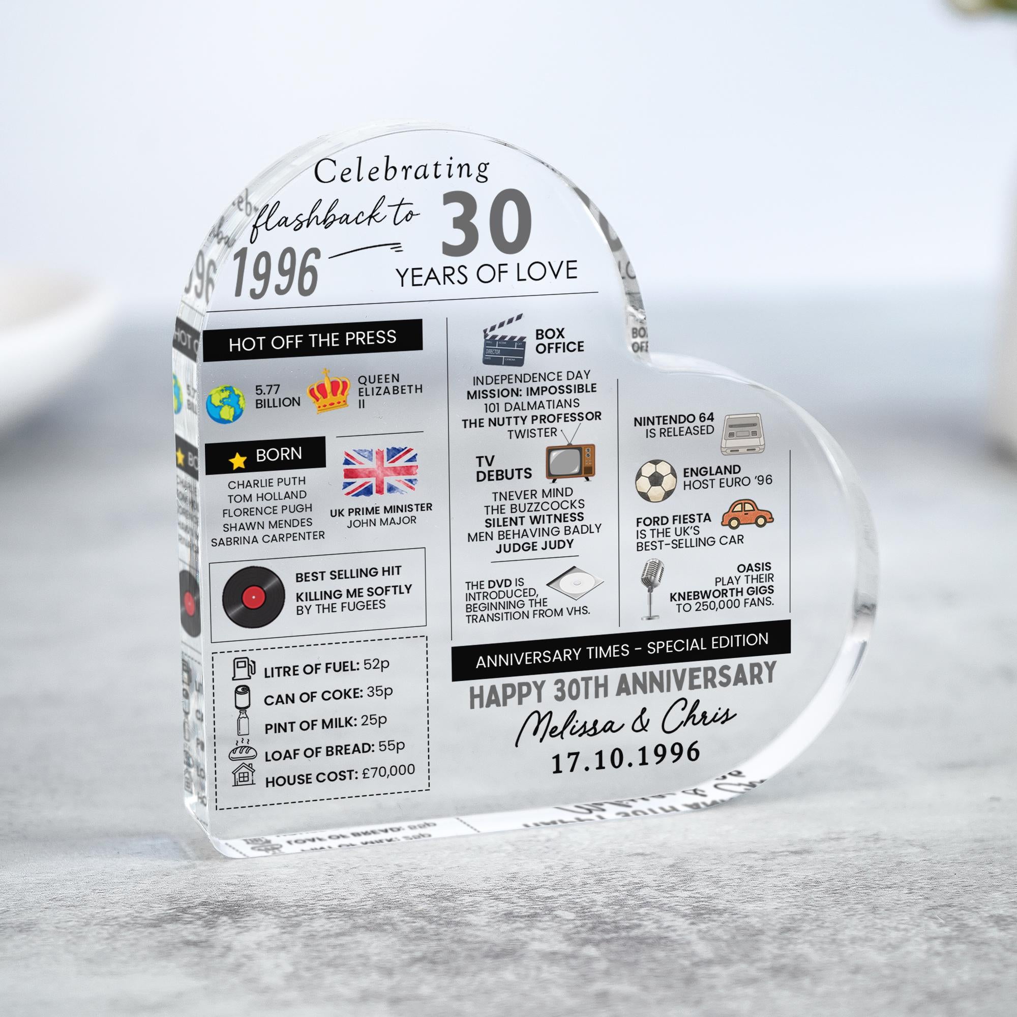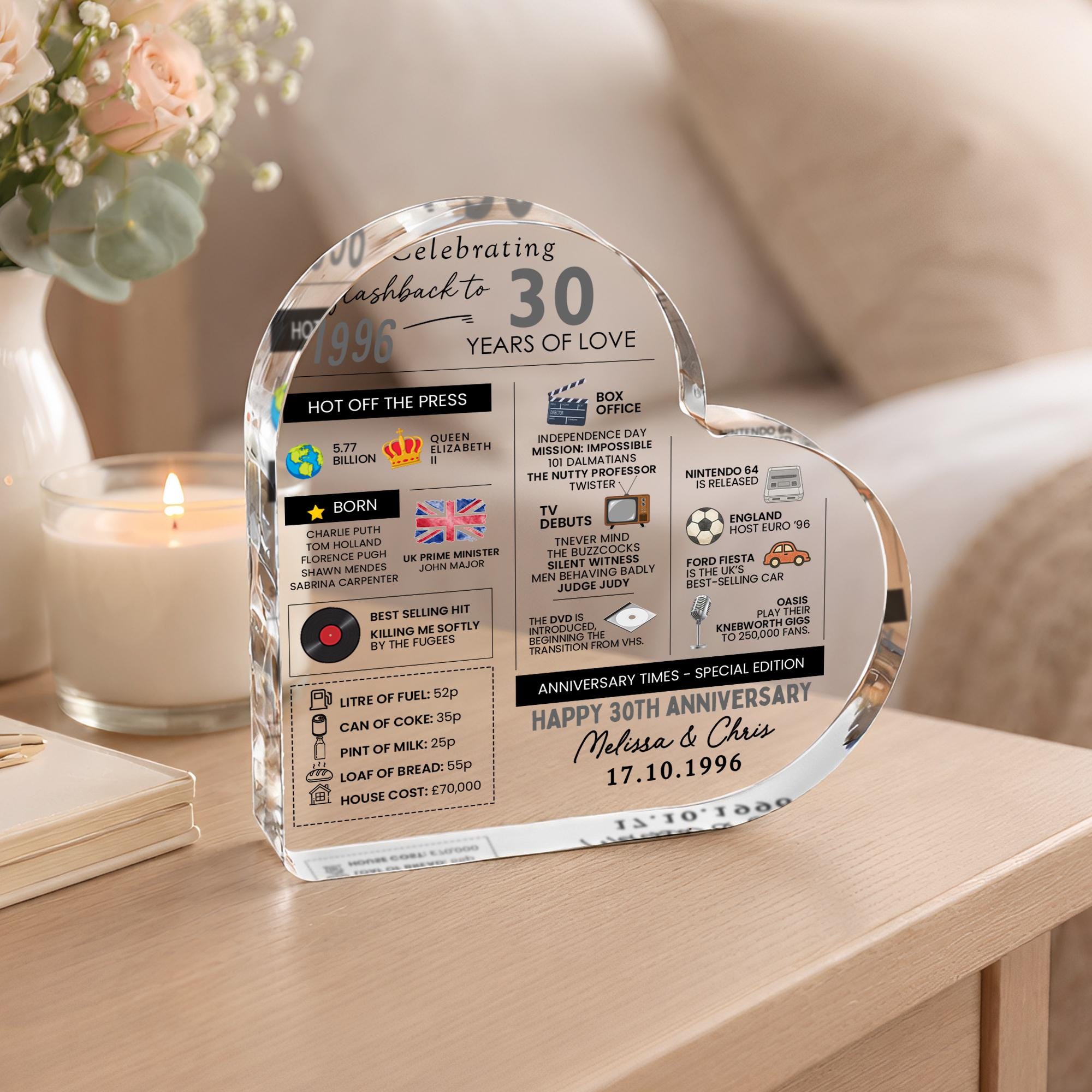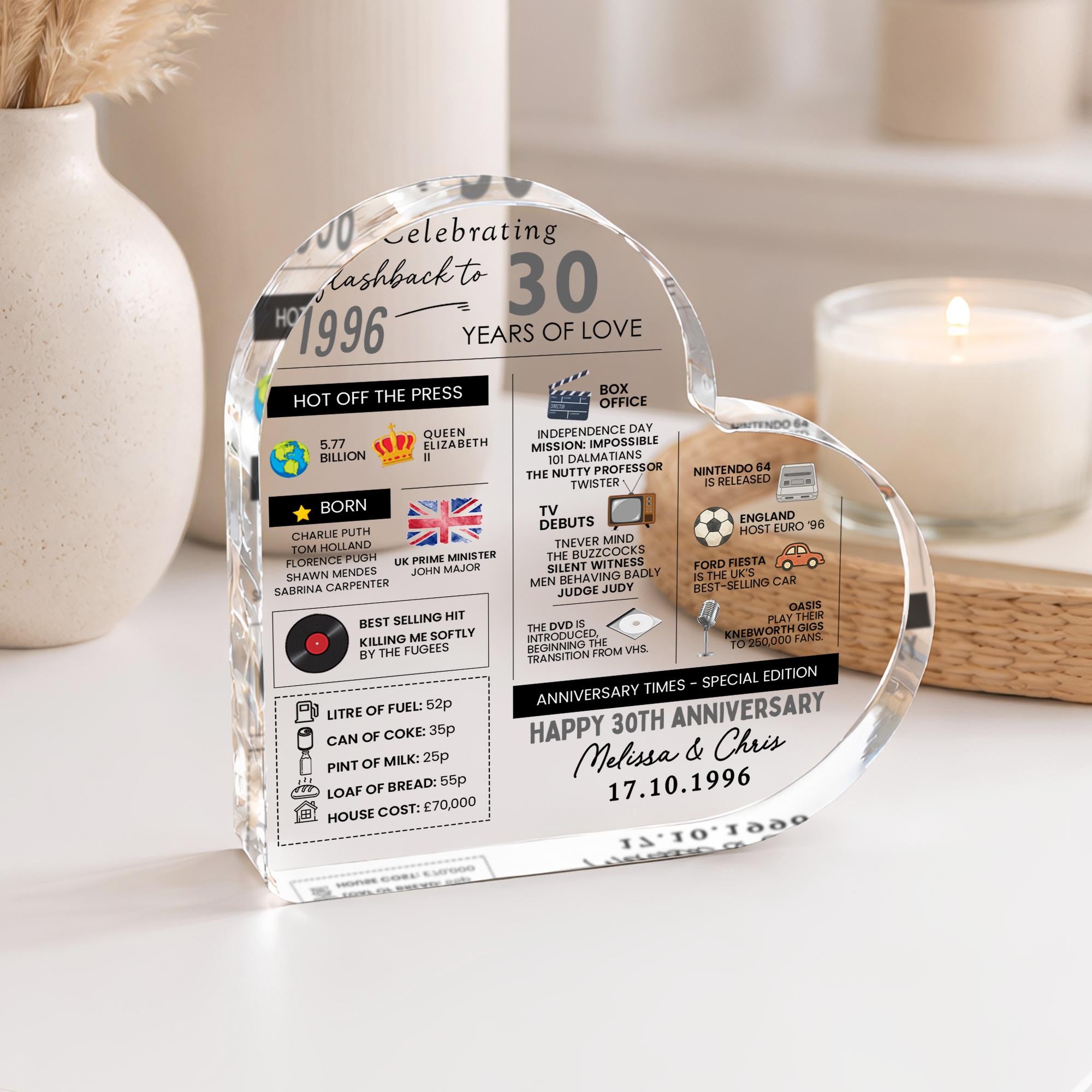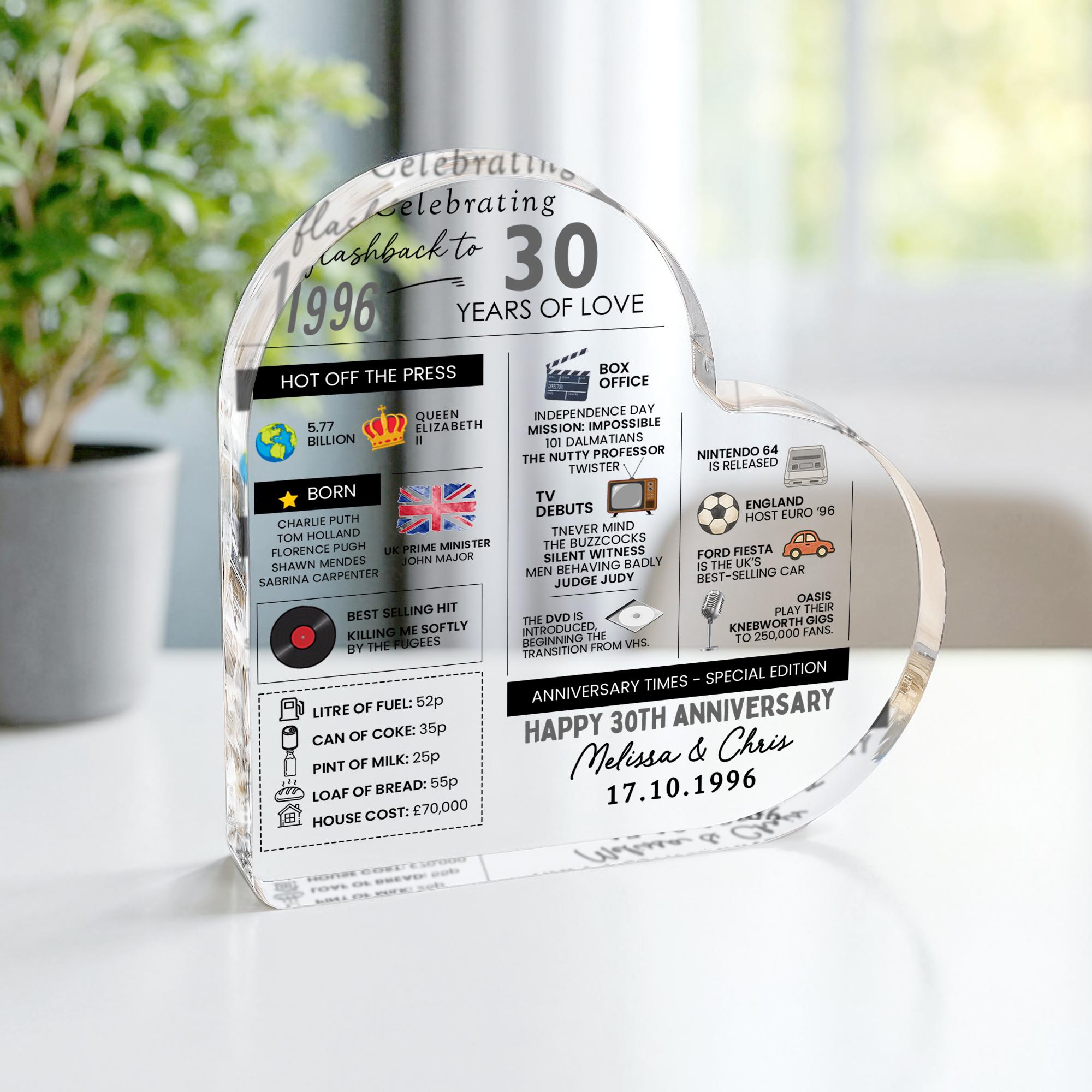 Personalised Marriage Facts 30th Anniversary Married in 1996 Heart Keepsake Plaque