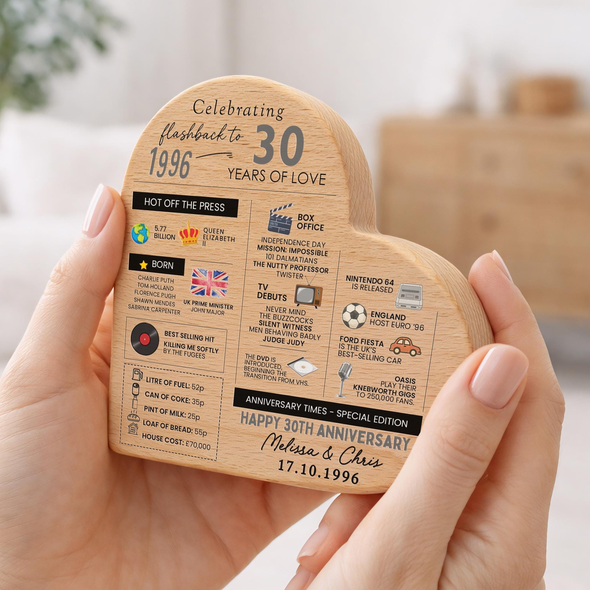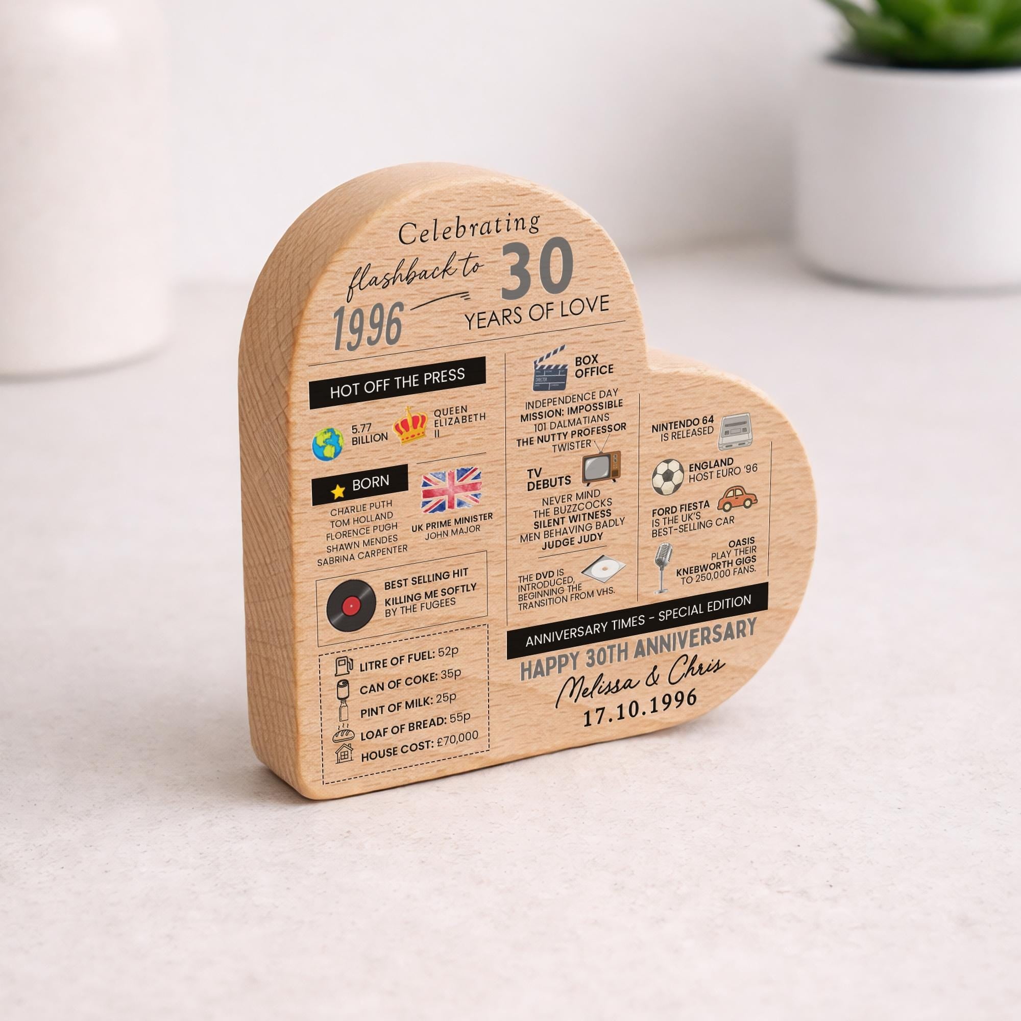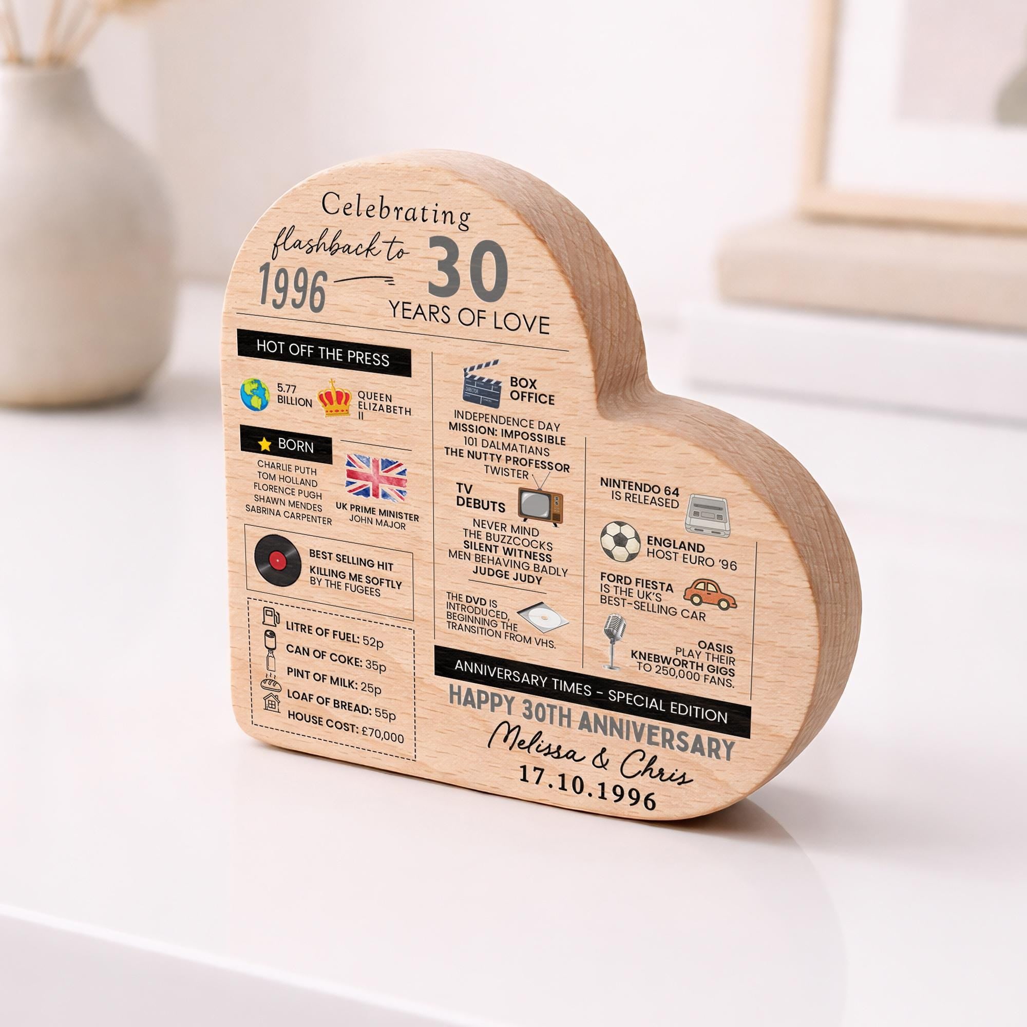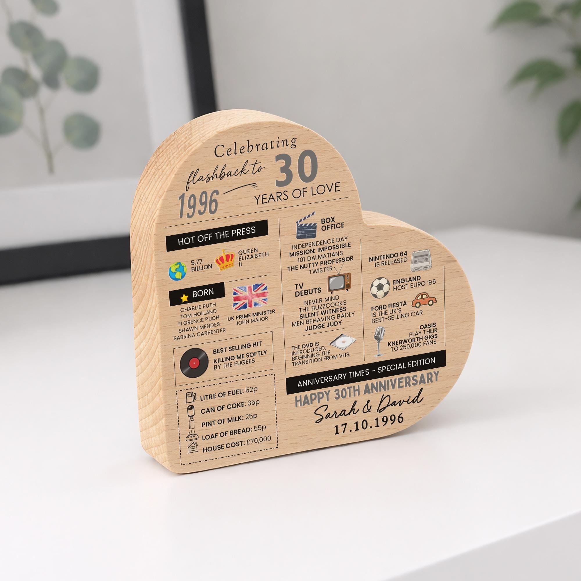 Personalised 30th Anniversary Wedding Facts Married in 1996 Beech Wood Heart Block