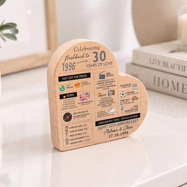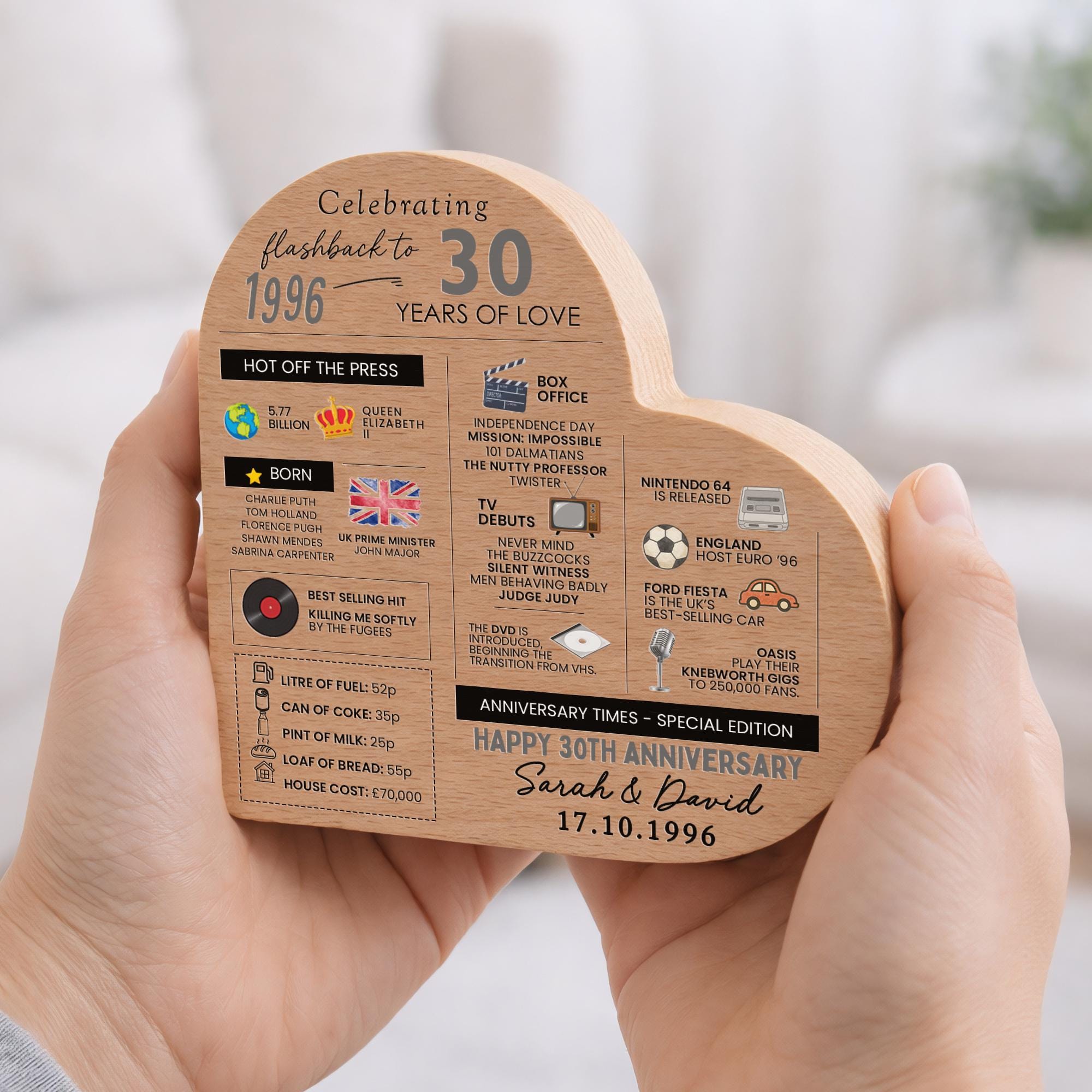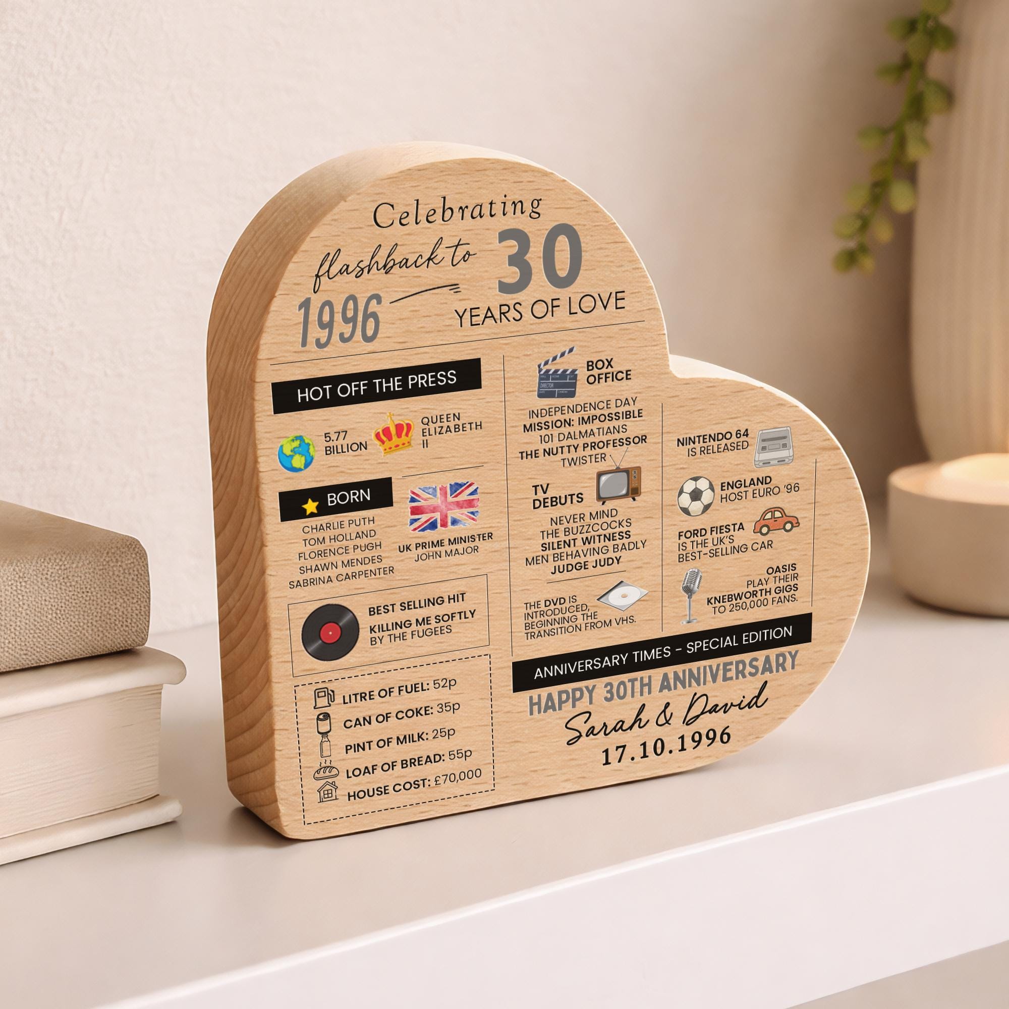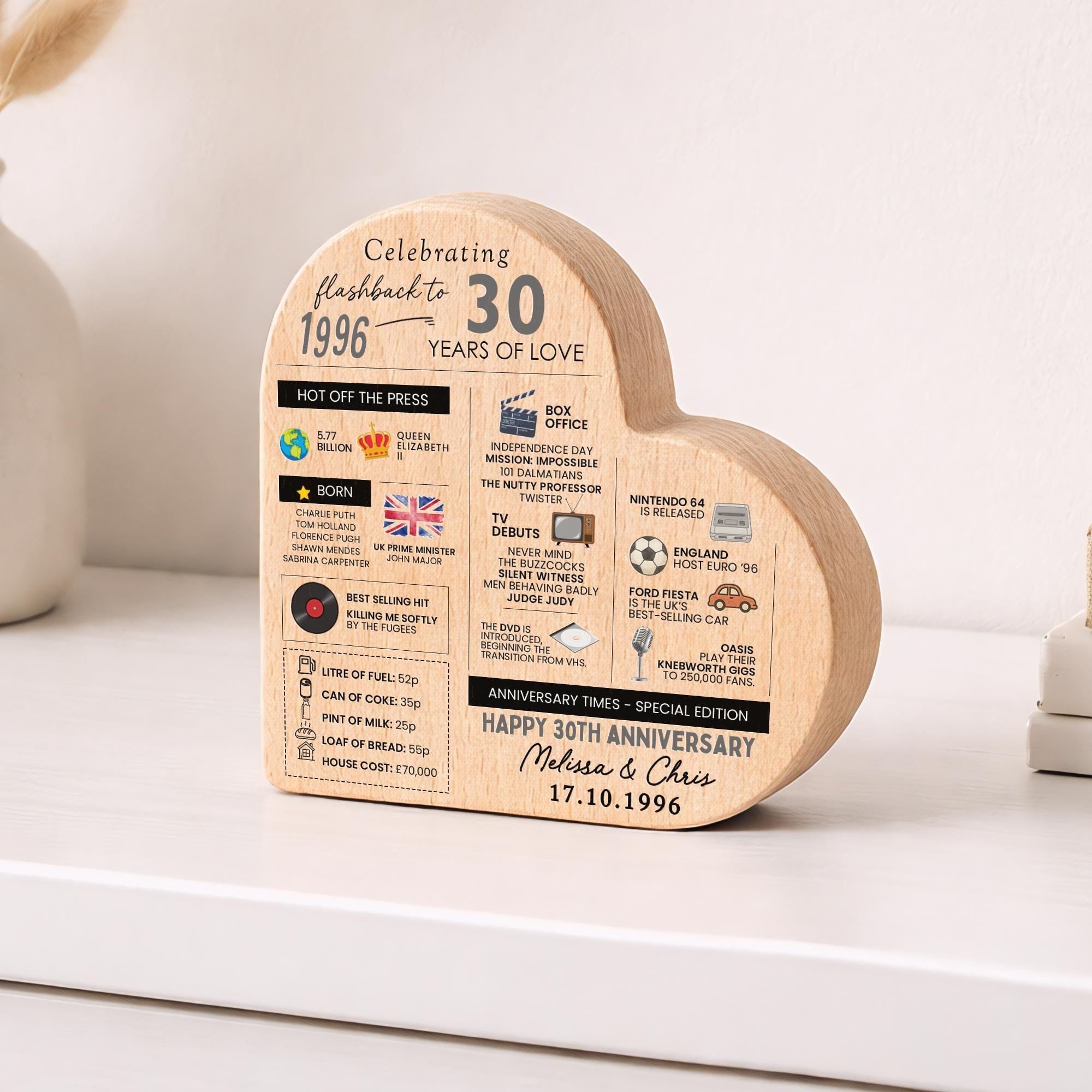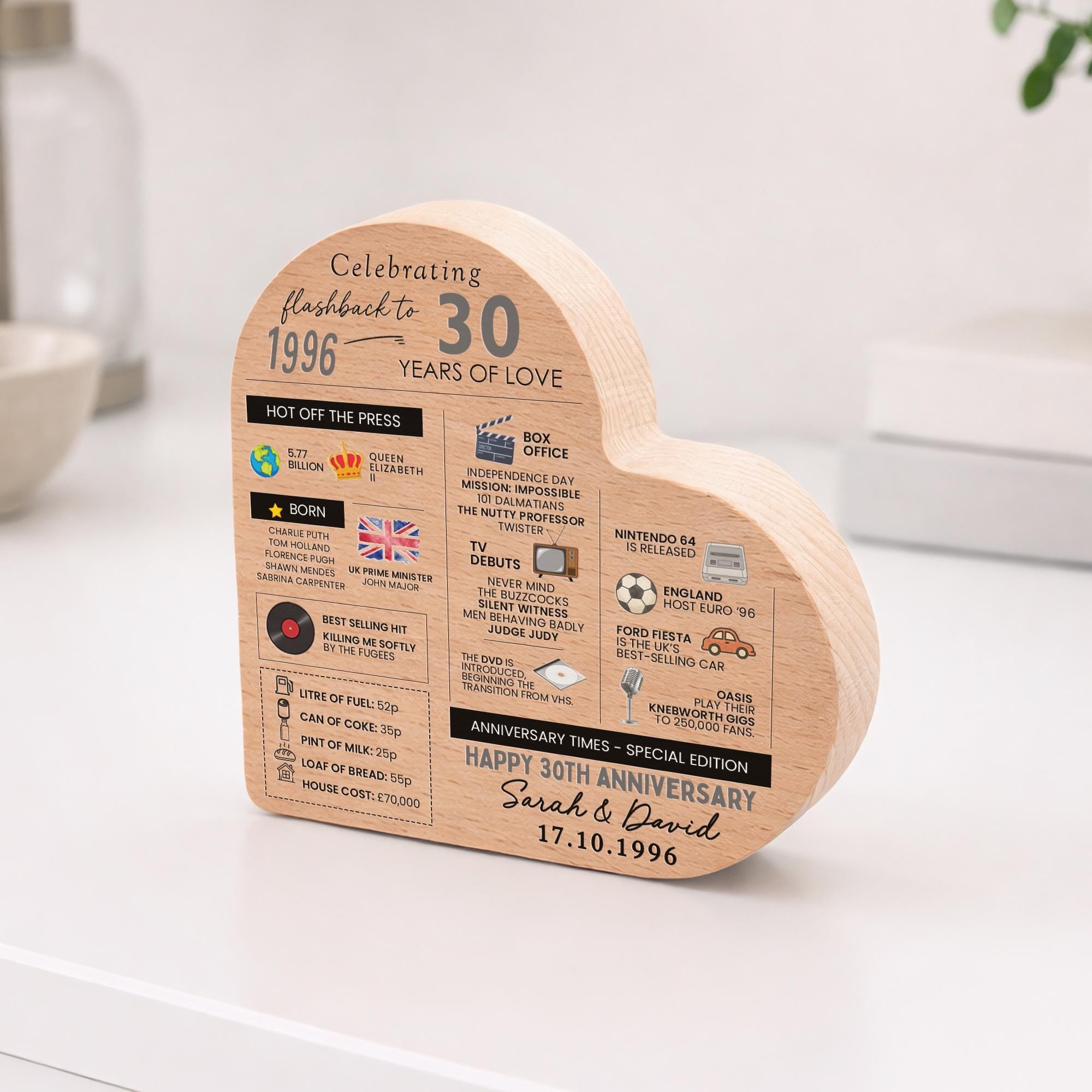 Personalised 30th Anniversary Wedding Facts Married in 1996 Beech Wood Heart Block