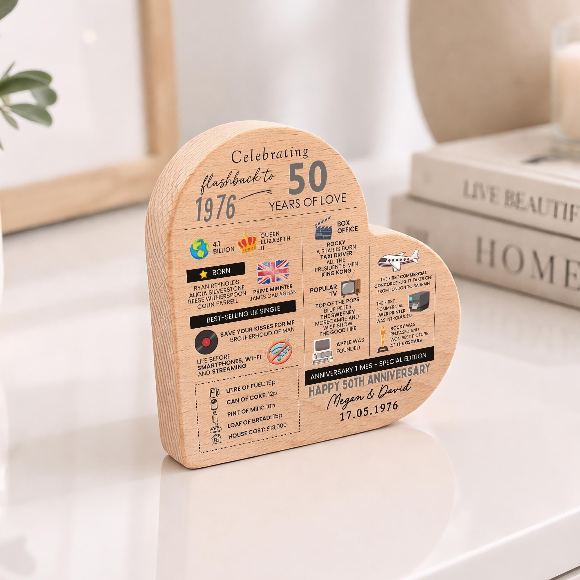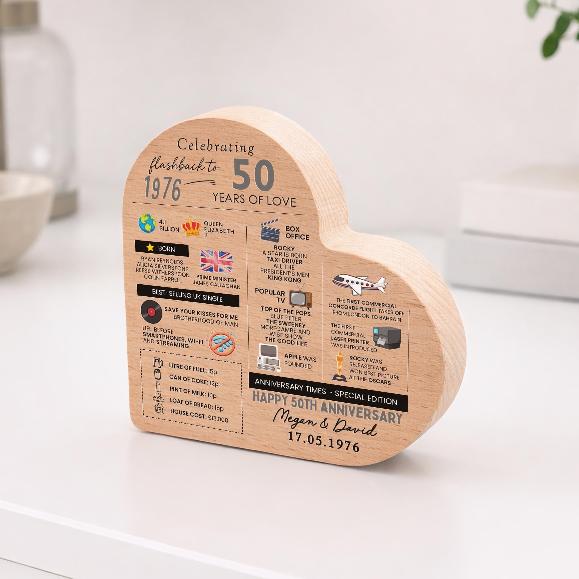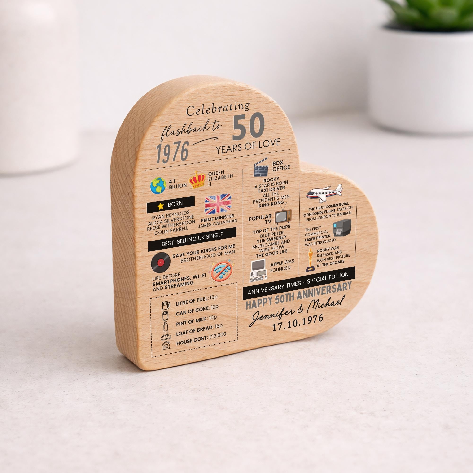 Personalised 50th Anniversary Wedding Facts Married in 1976 Beech Wood Heart Block