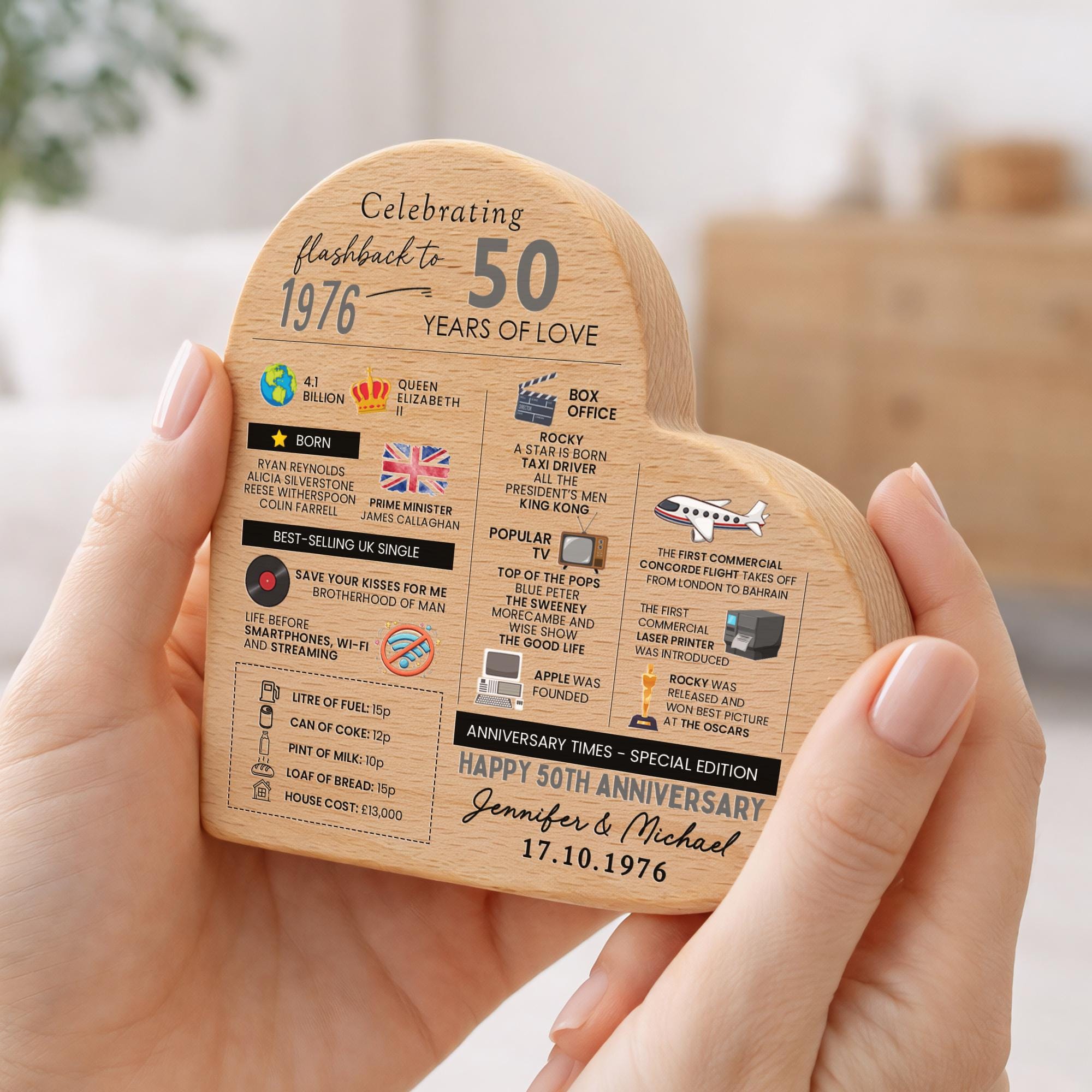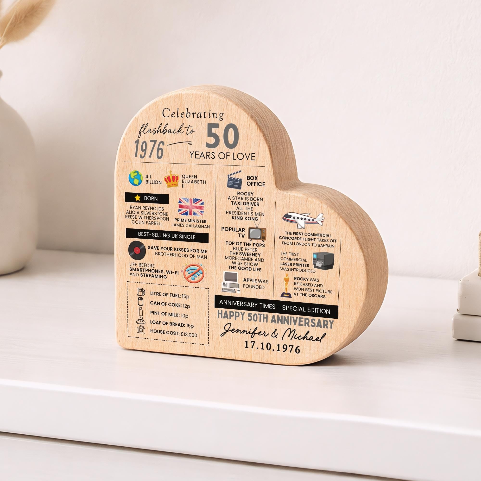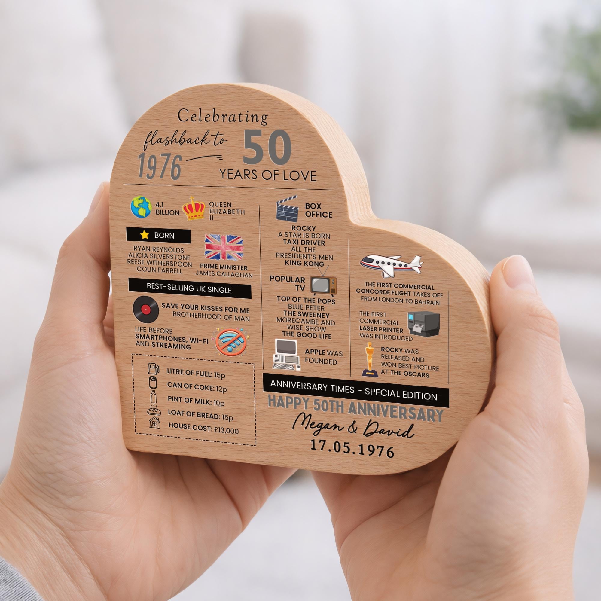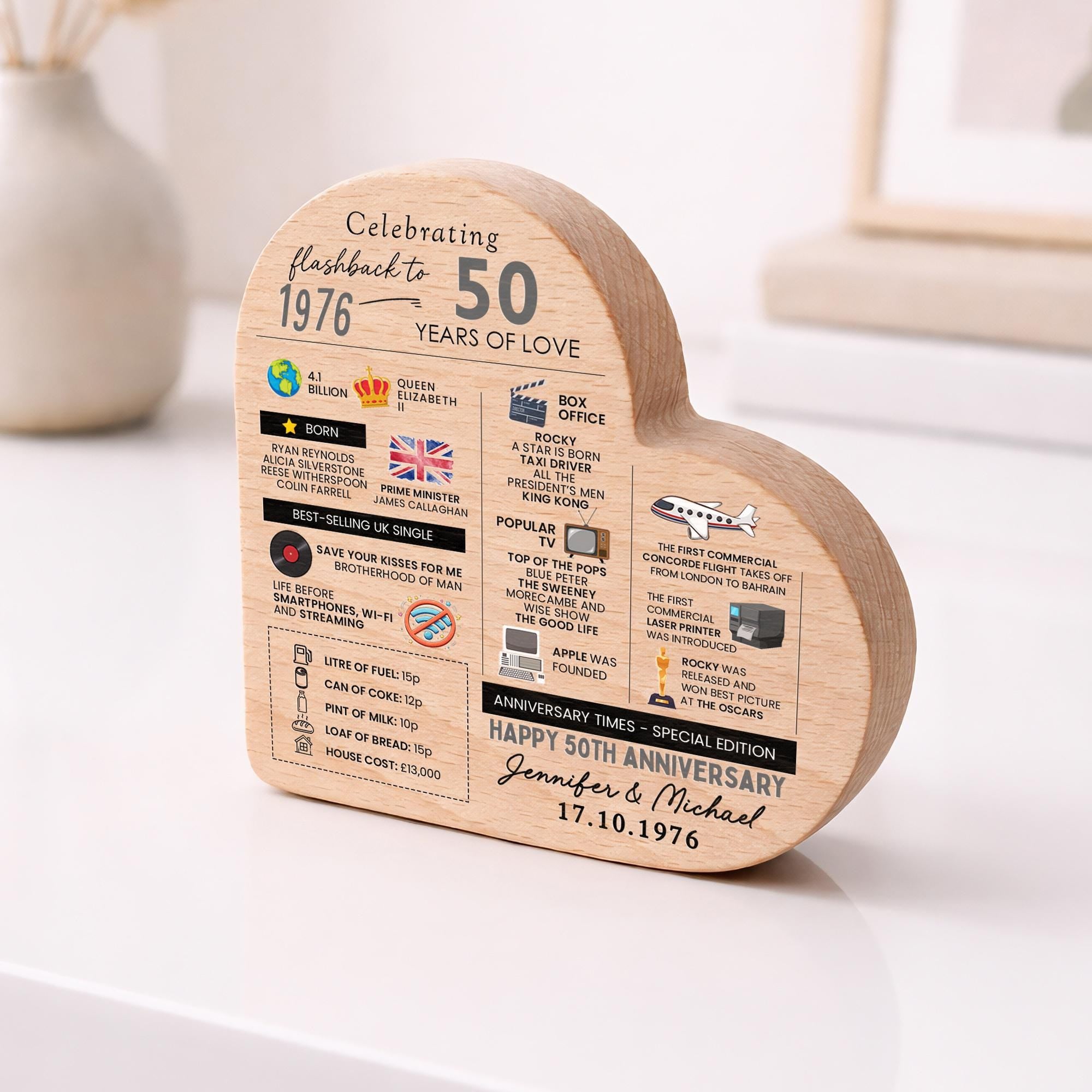 Personalised 50th Anniversary Wedding Facts Married in 1976 Beech Wood Heart Block