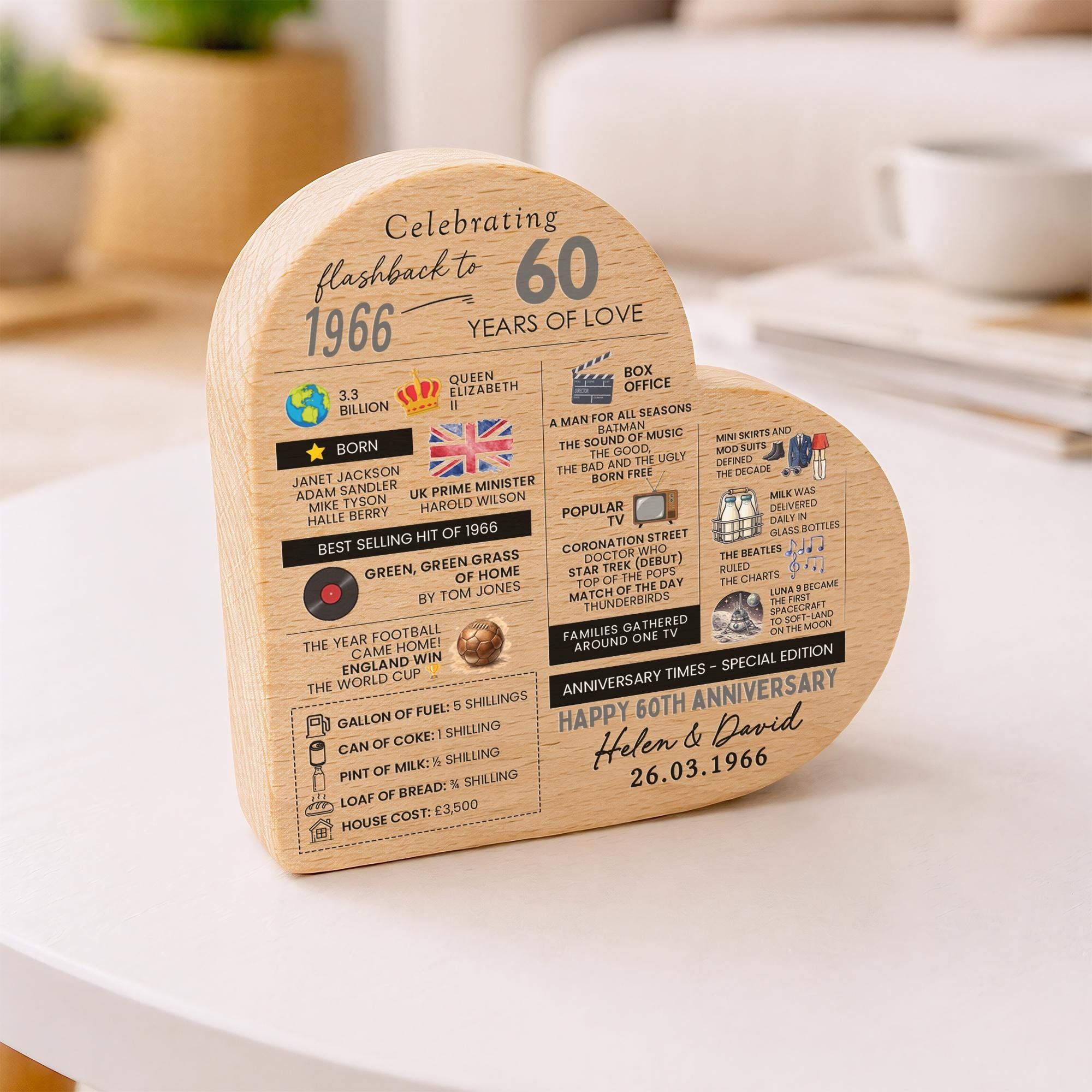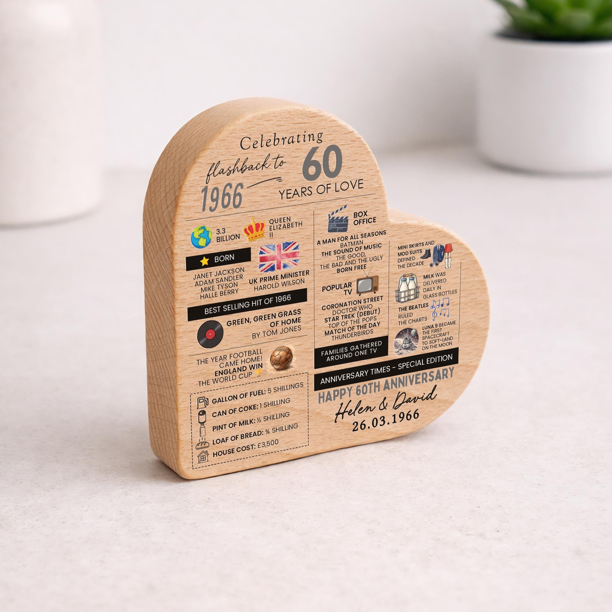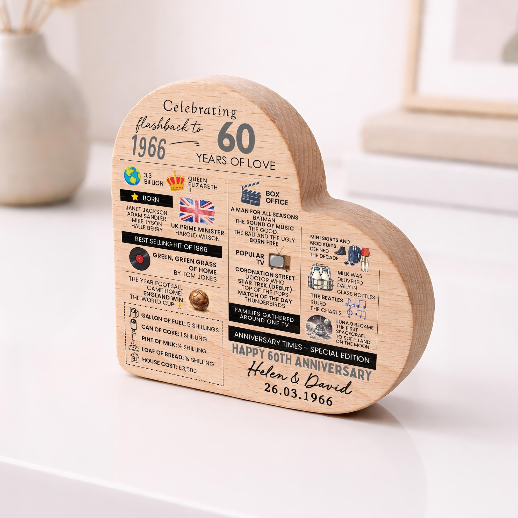 Personalised 60th Anniversary Wedding Facts Married in 1966 Beech Wood Heart Block