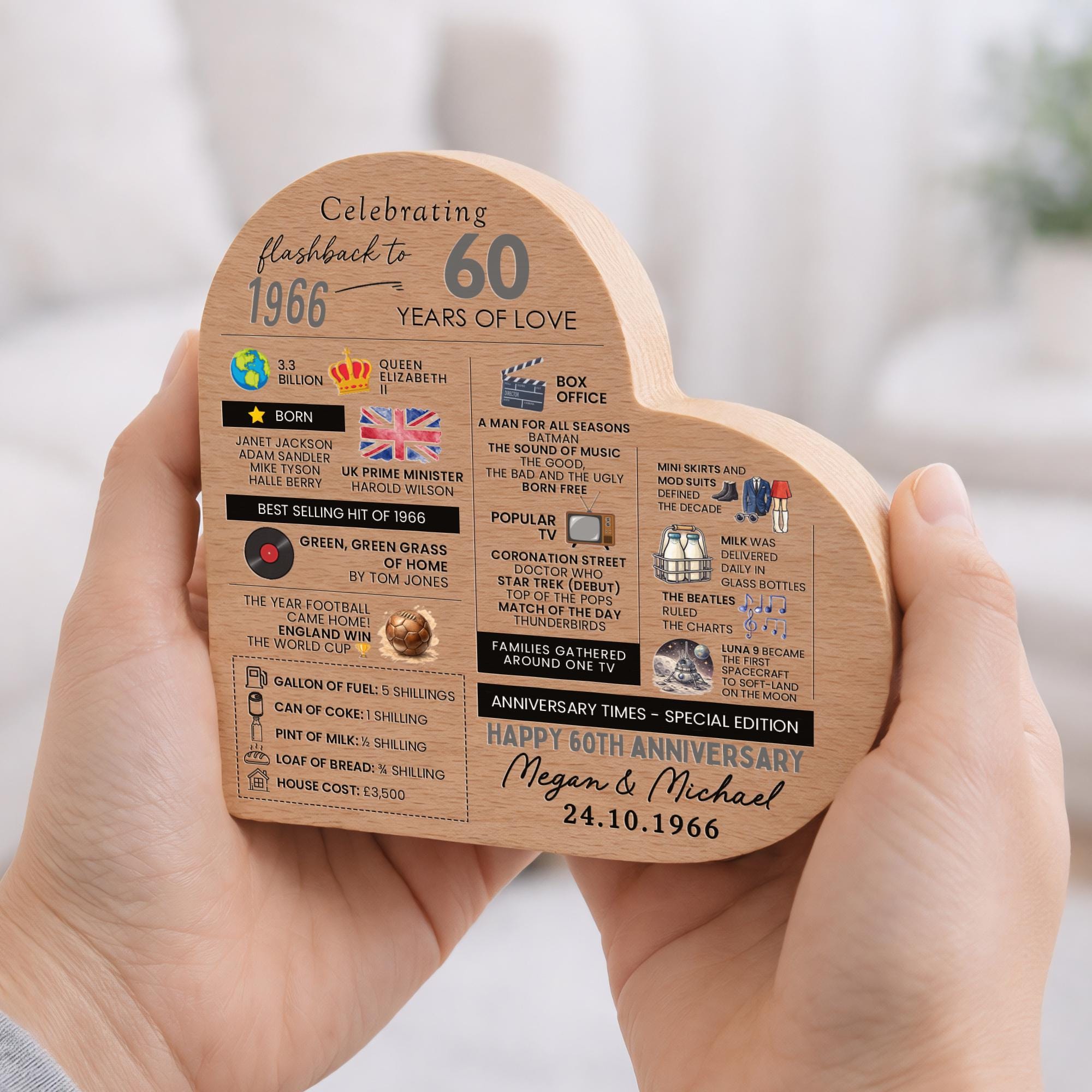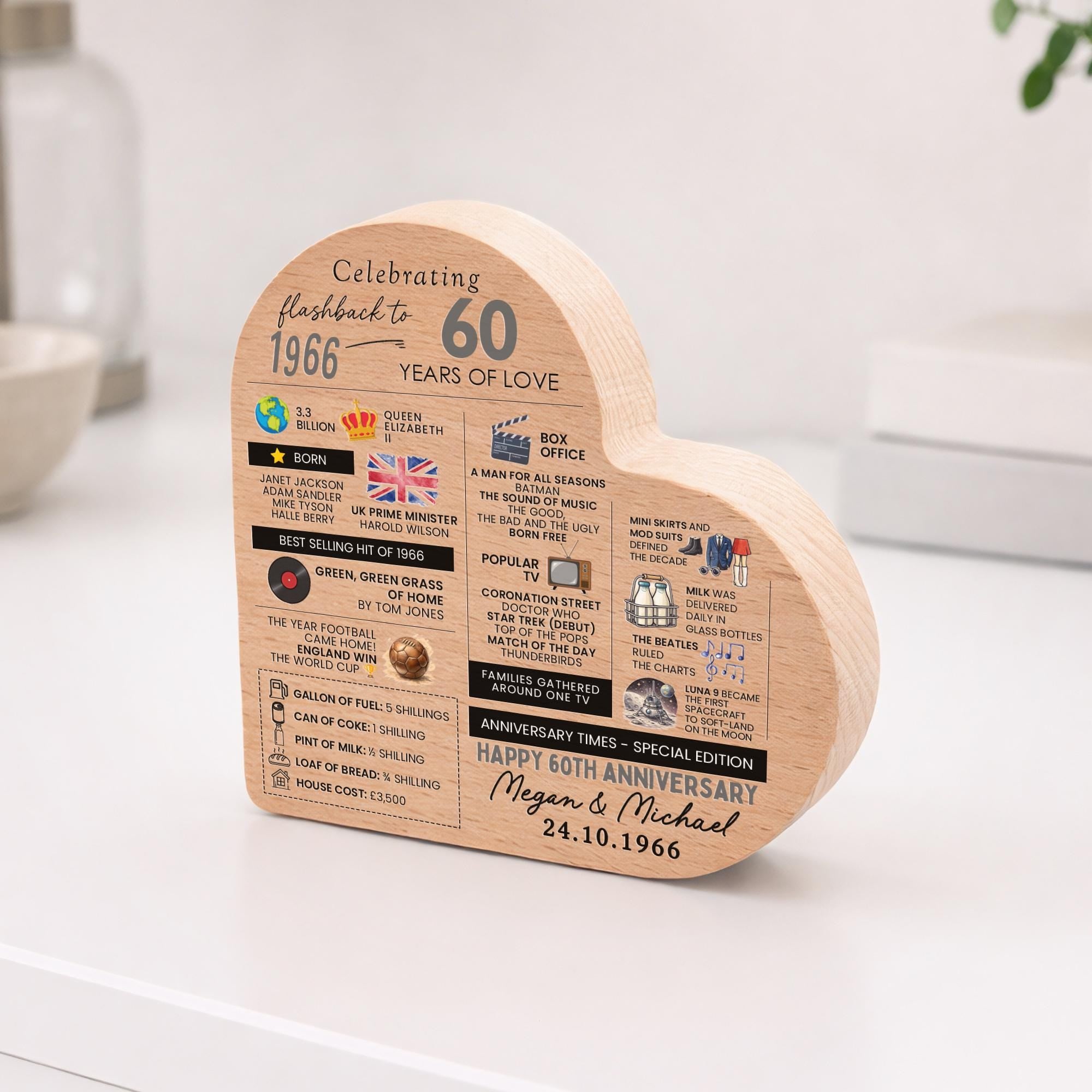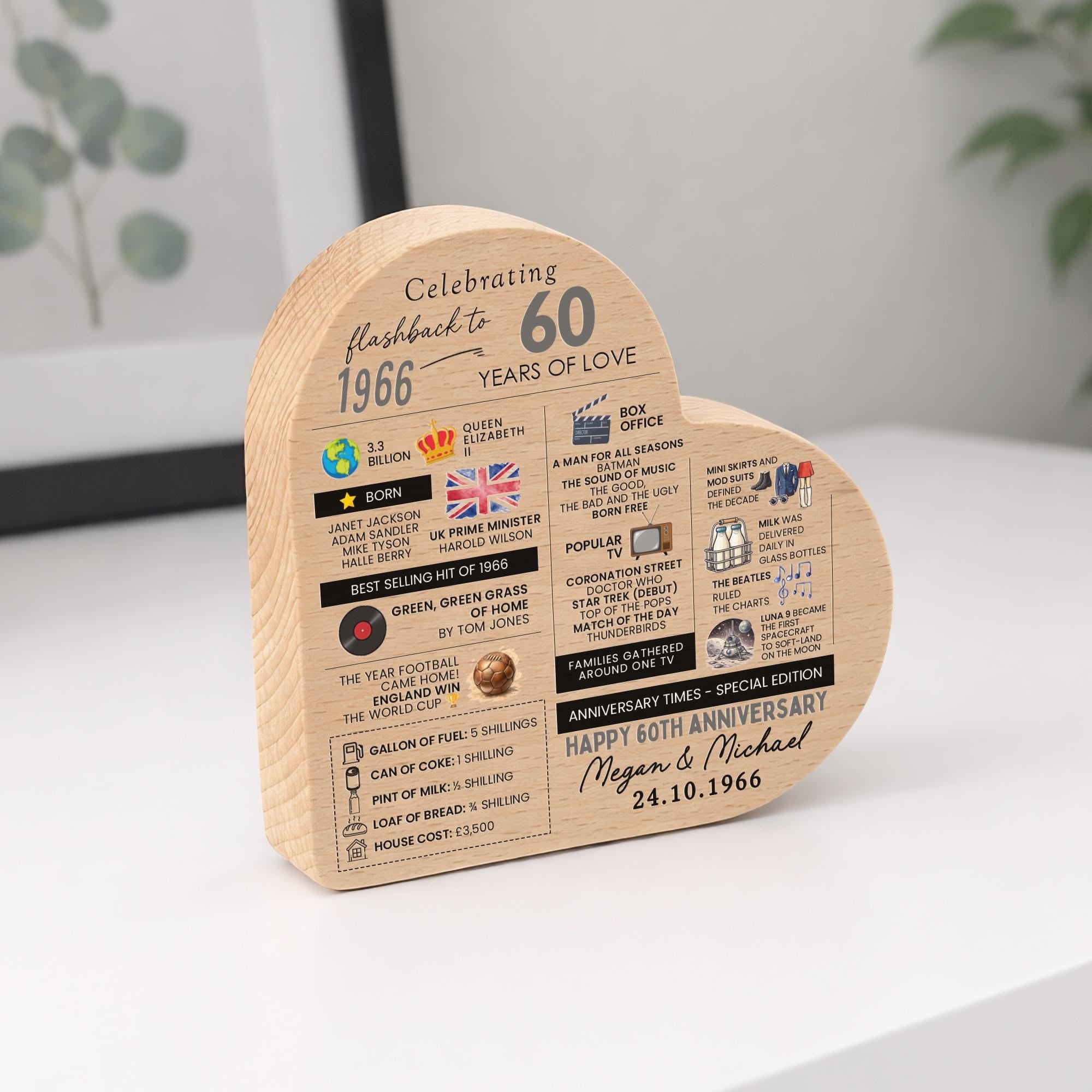 Personalised 60th Anniversary Wedding Facts Married in 1966 Beech Wood Heart Block