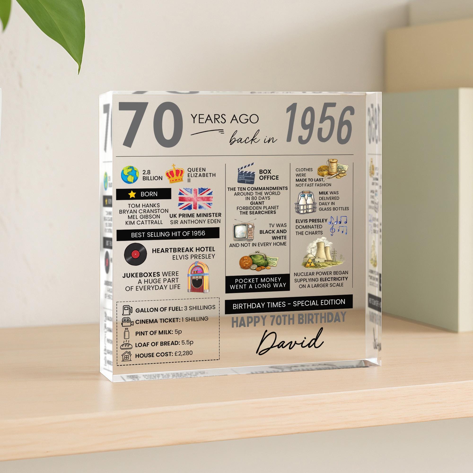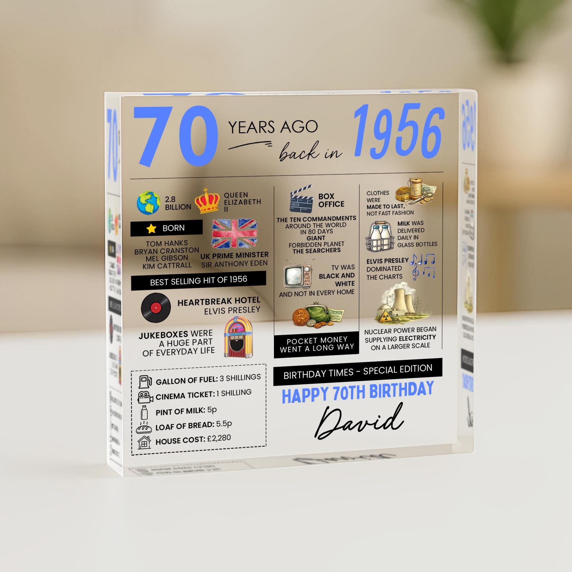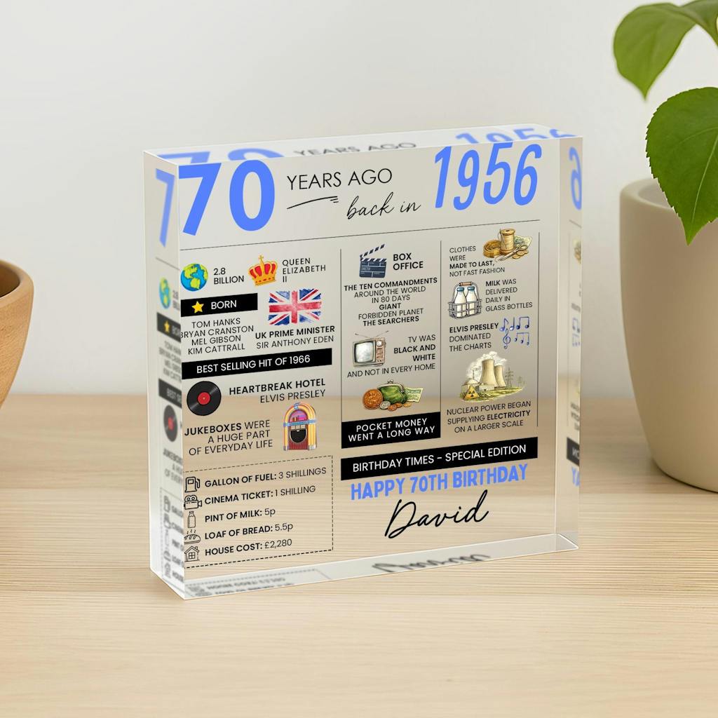 Personalised 70th Birthday Fun Facts Acrylic Plaque Born in 1956 Gift for Grandad Nan Grandma