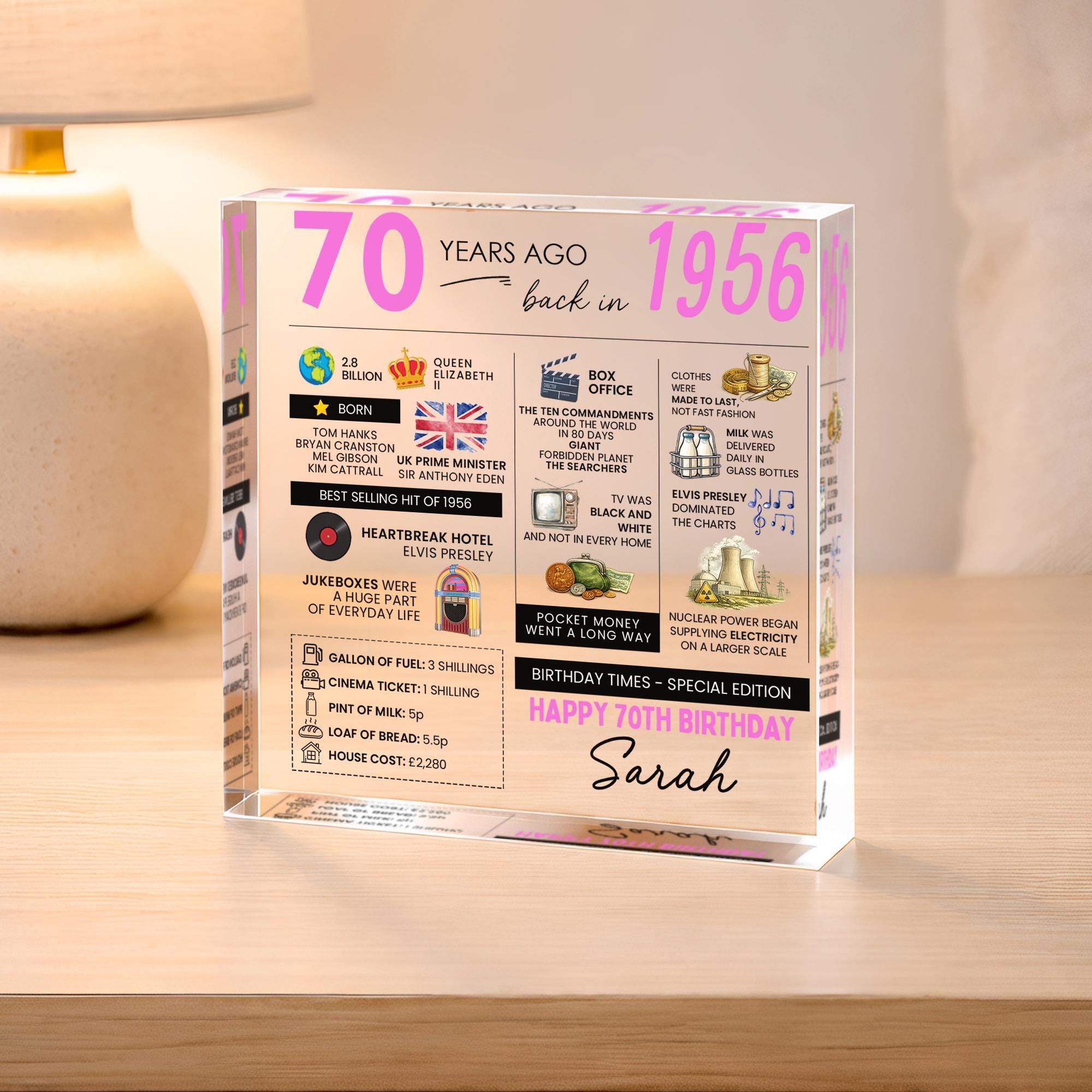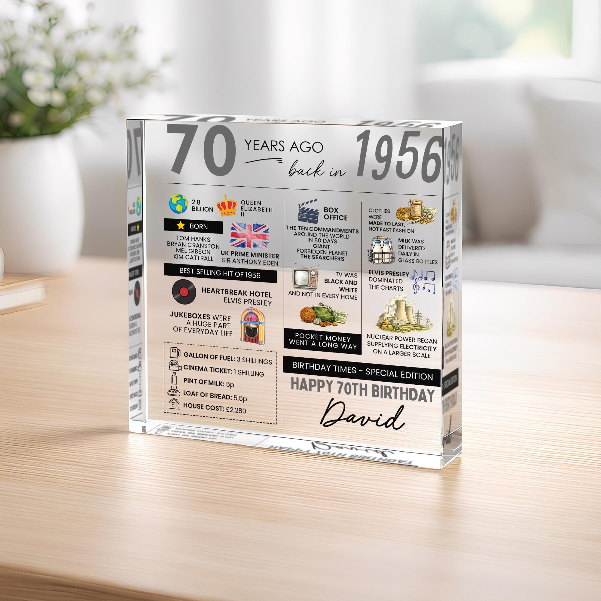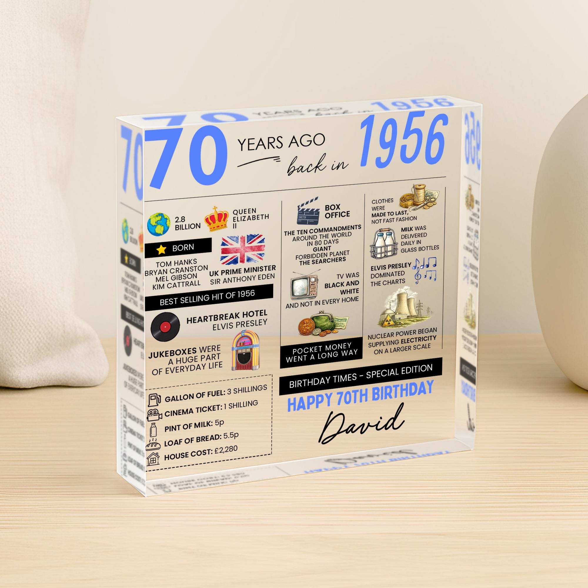 Personalised 70th Birthday Fun Facts Acrylic Plaque Born in 1956 Gift for Grandad Nan Grandma