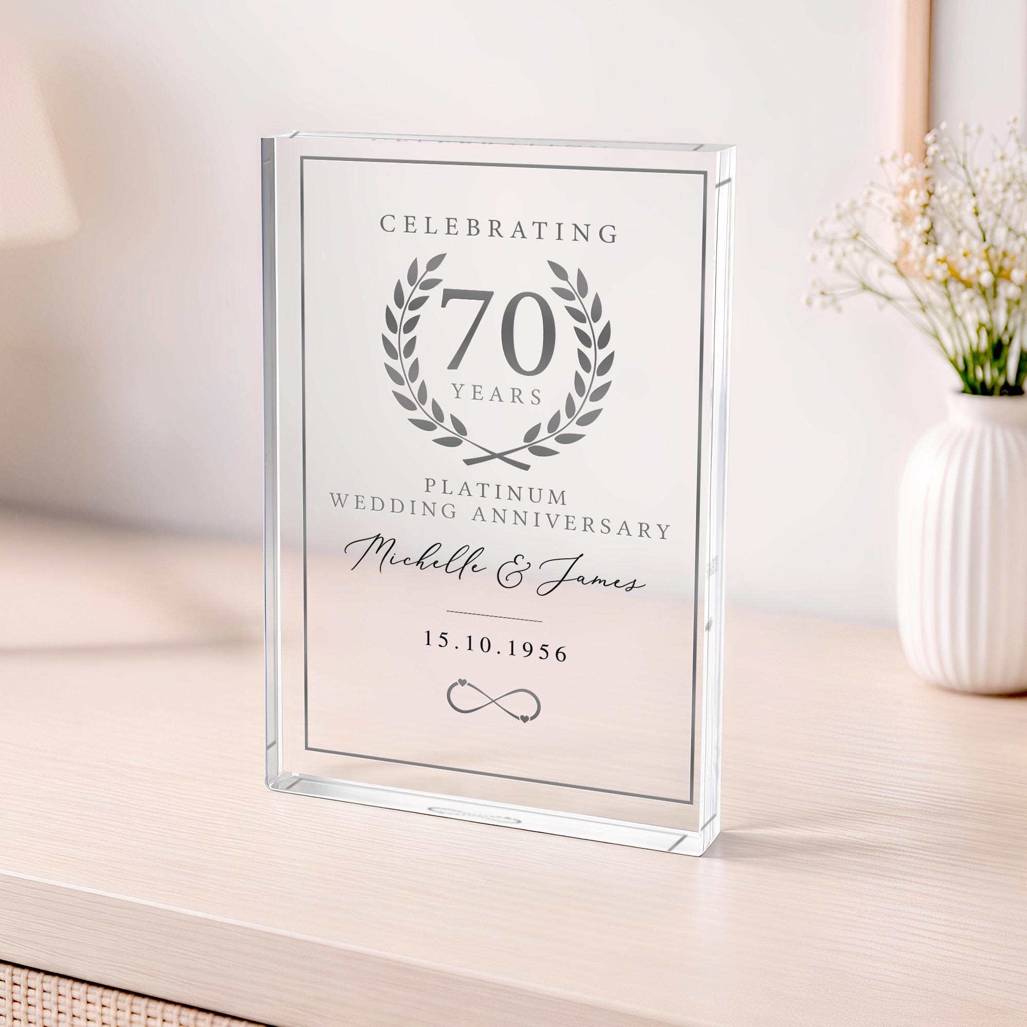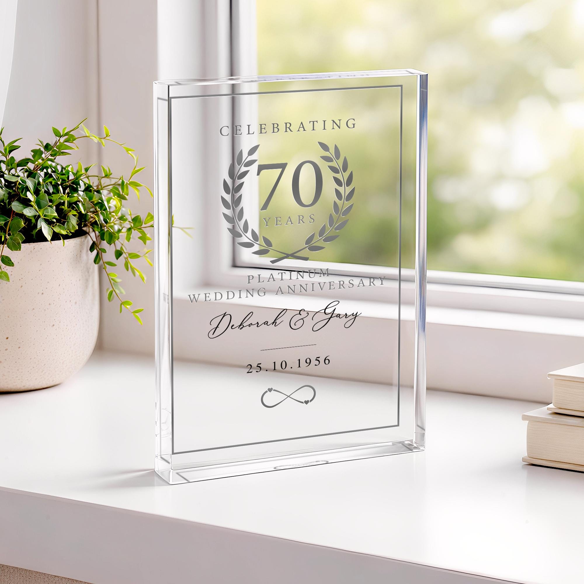 Personalised 70th Platinum Wedding Anniversary Gift Plaque Polished Clear Acrylic