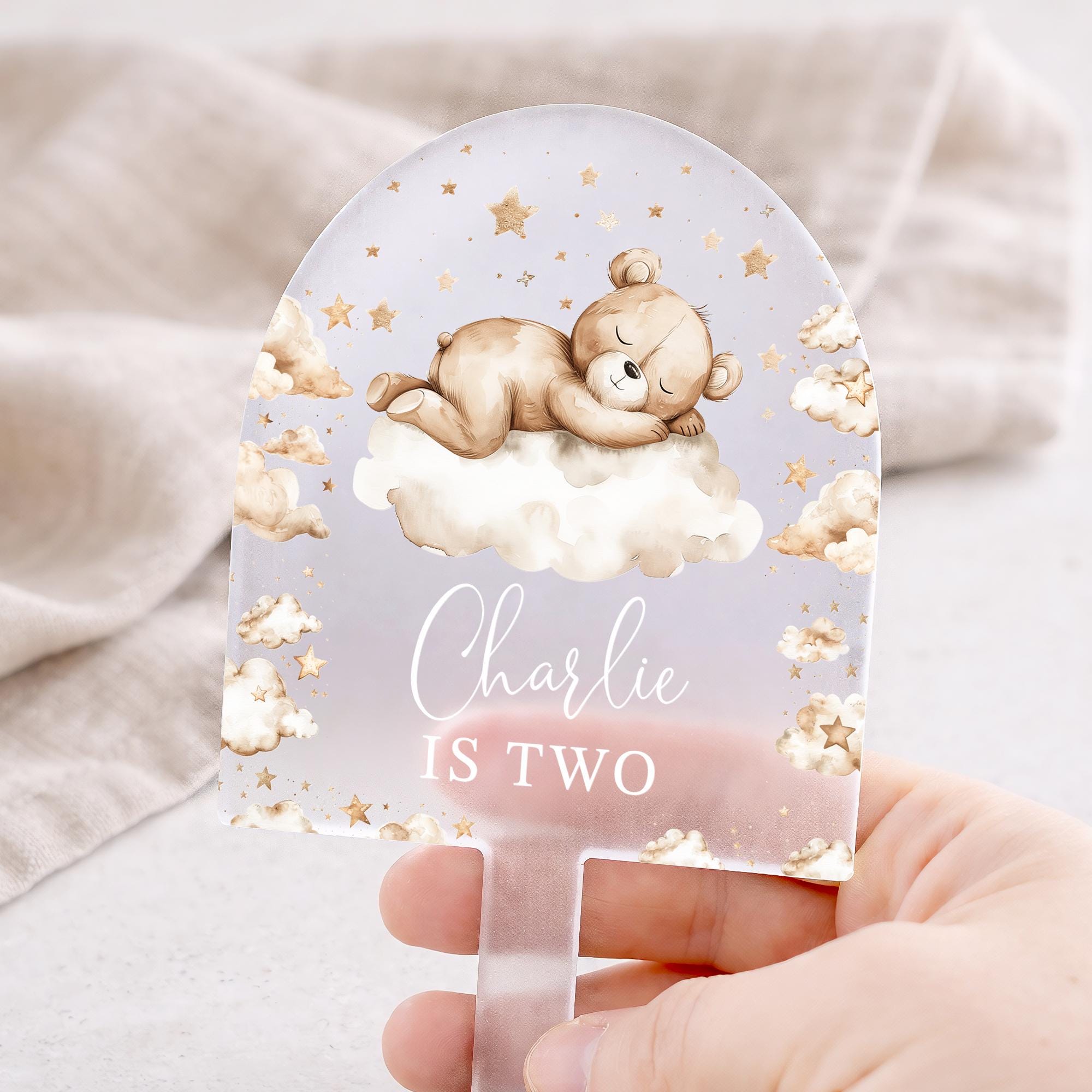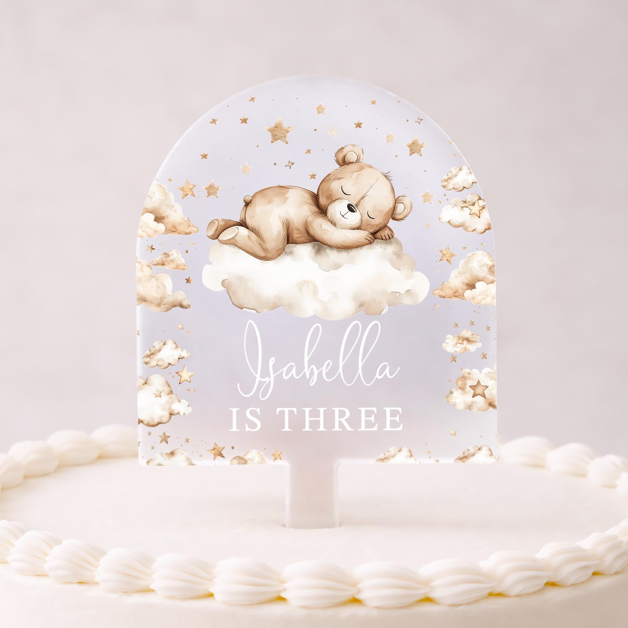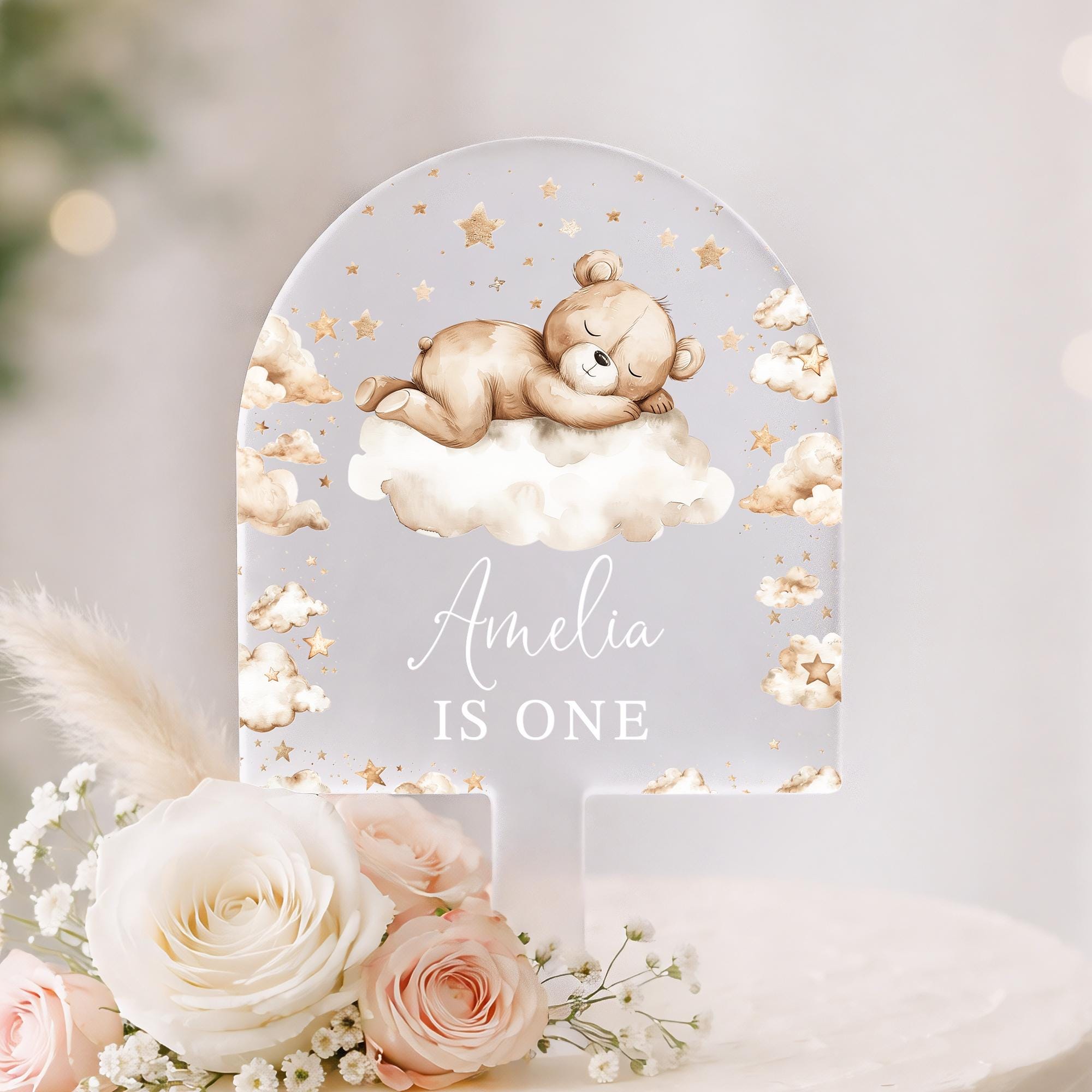 Personalised Baby Bear Birthday Cake Topper Beige Theme 1st 2nd 3rd 4th 5th