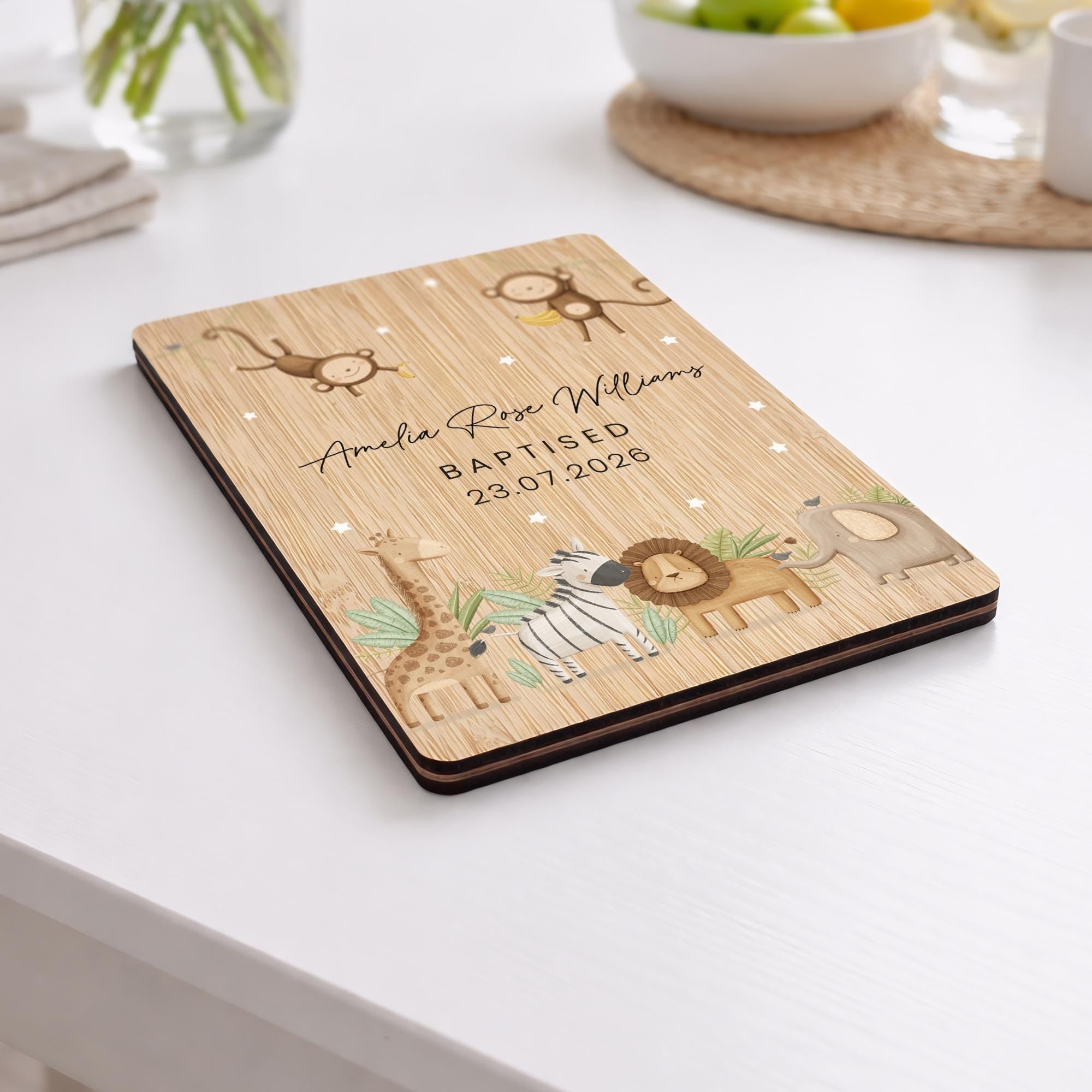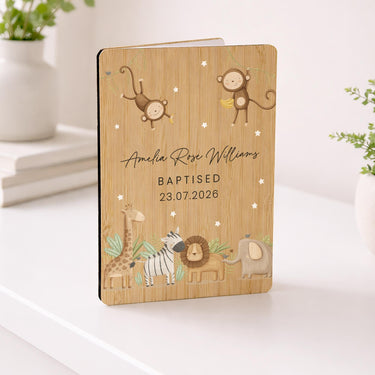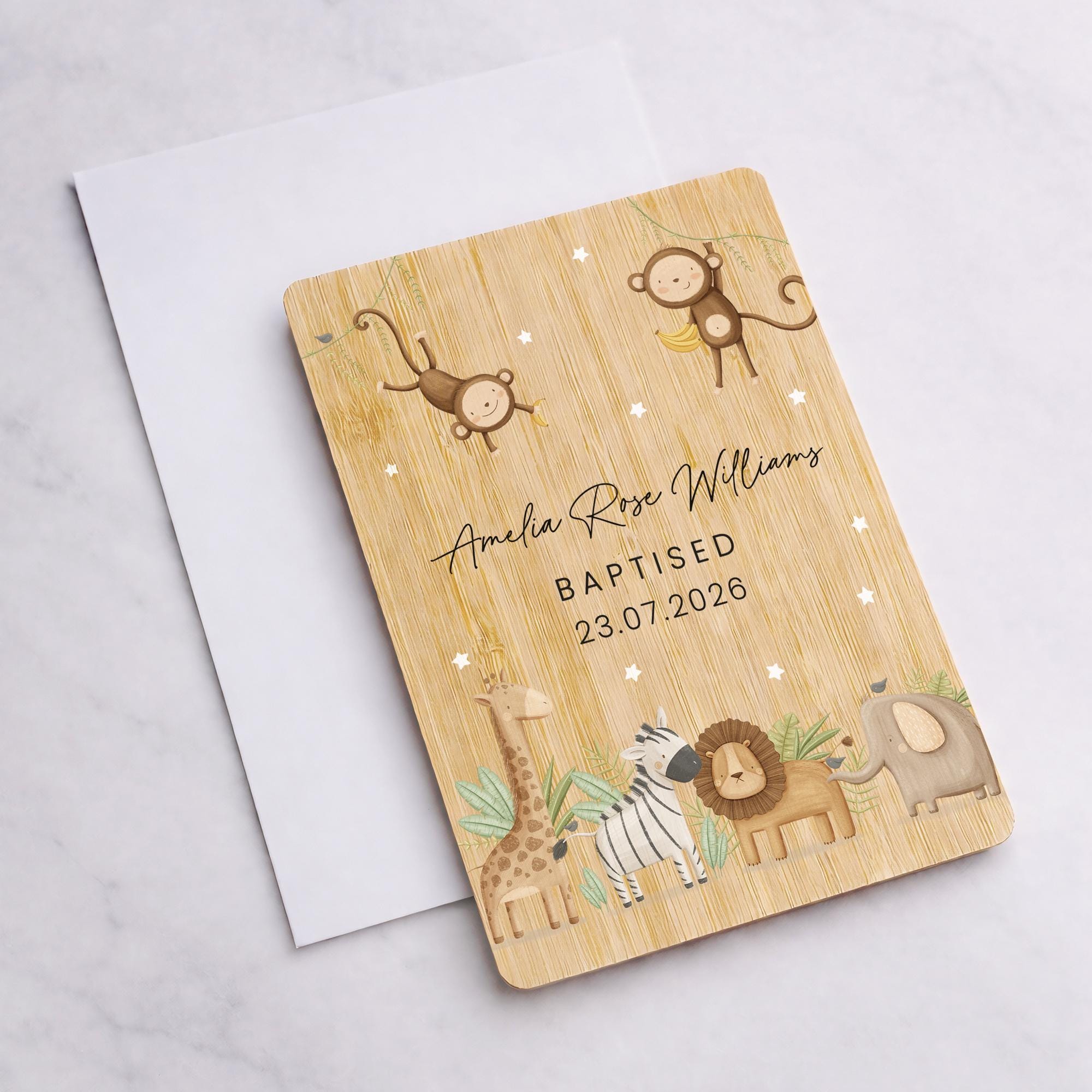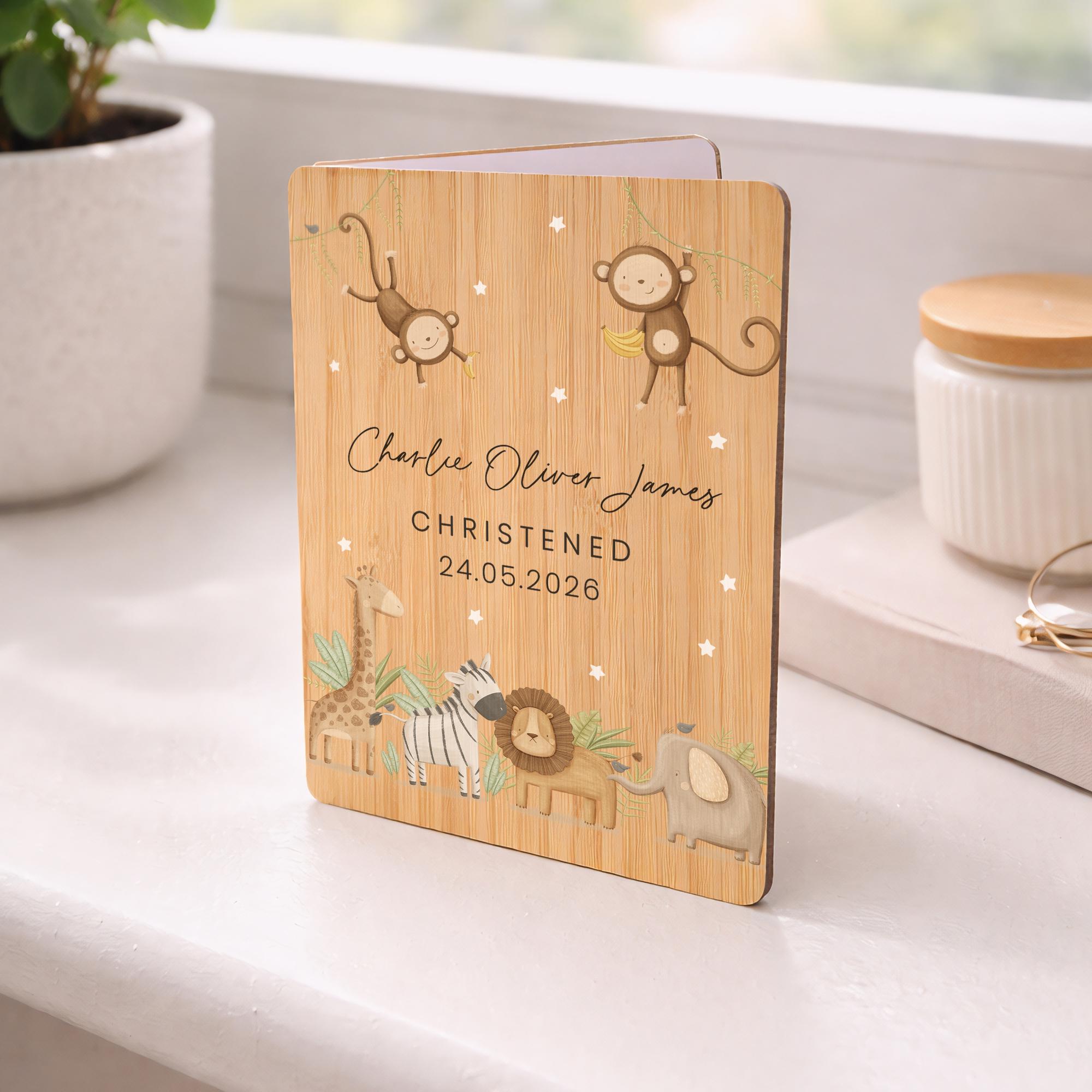 Personalised Safari Animals Christening Wooden Keepsake Card
