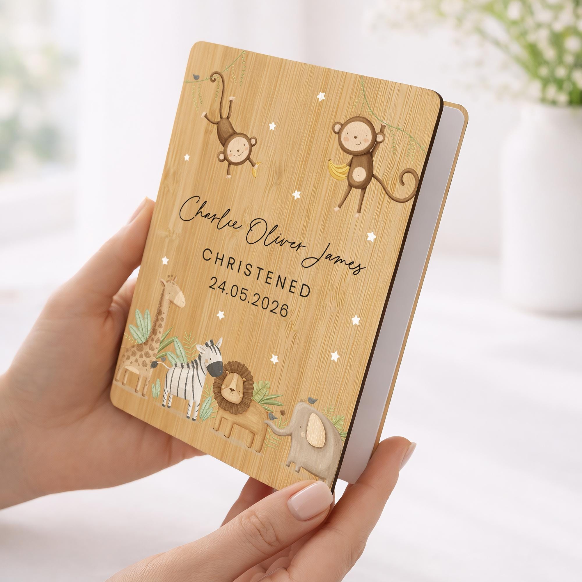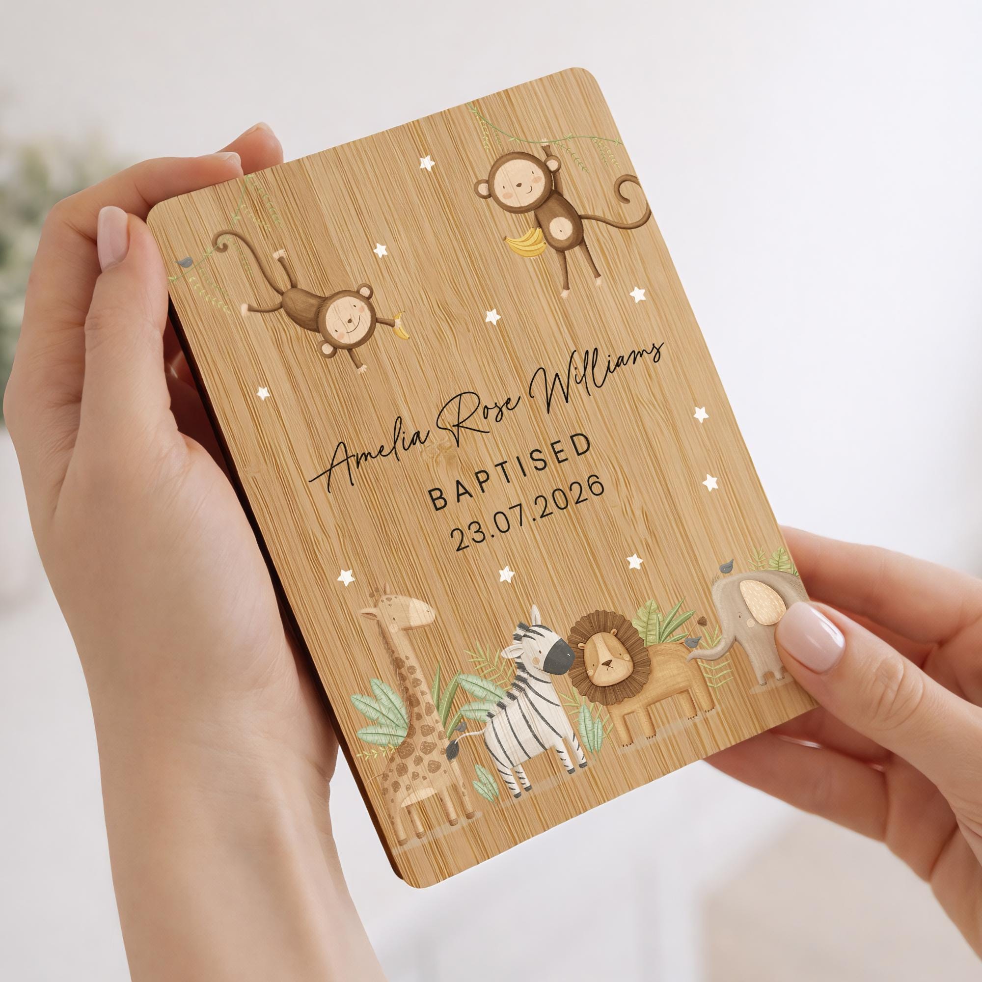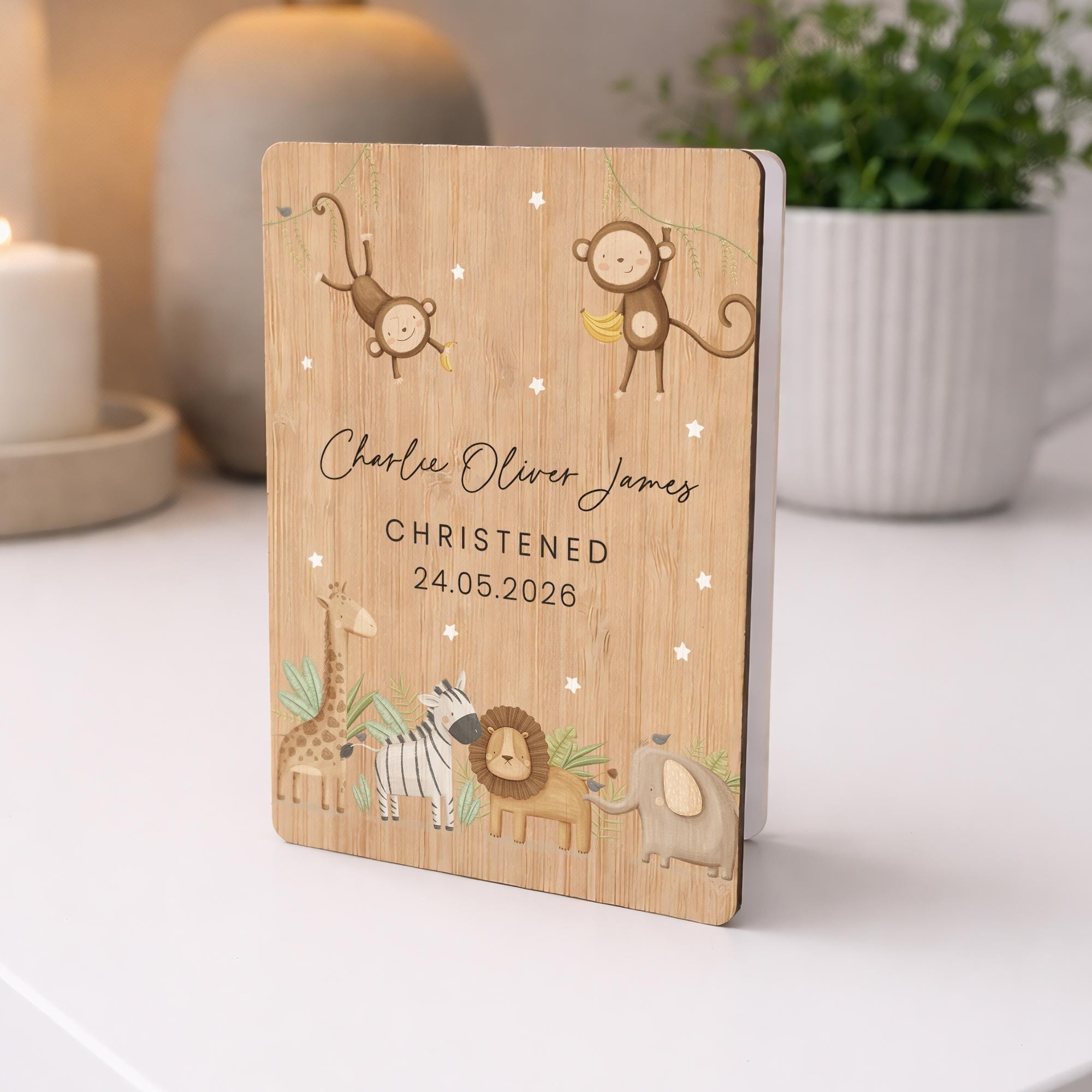 Personalised Safari Animals Christening Wooden Keepsake Card