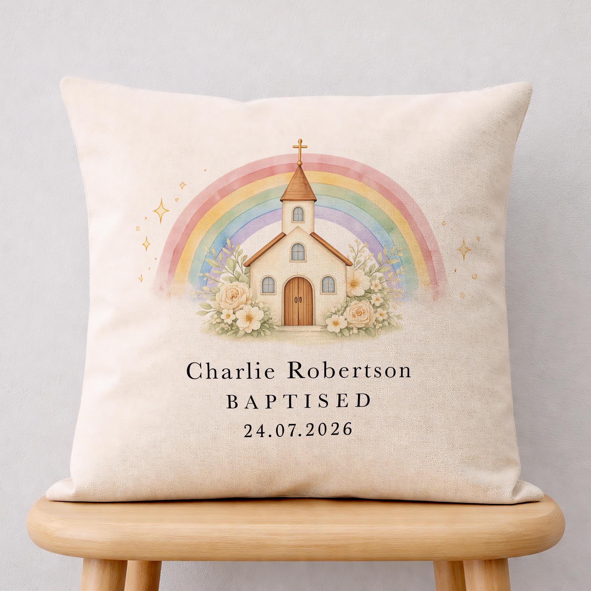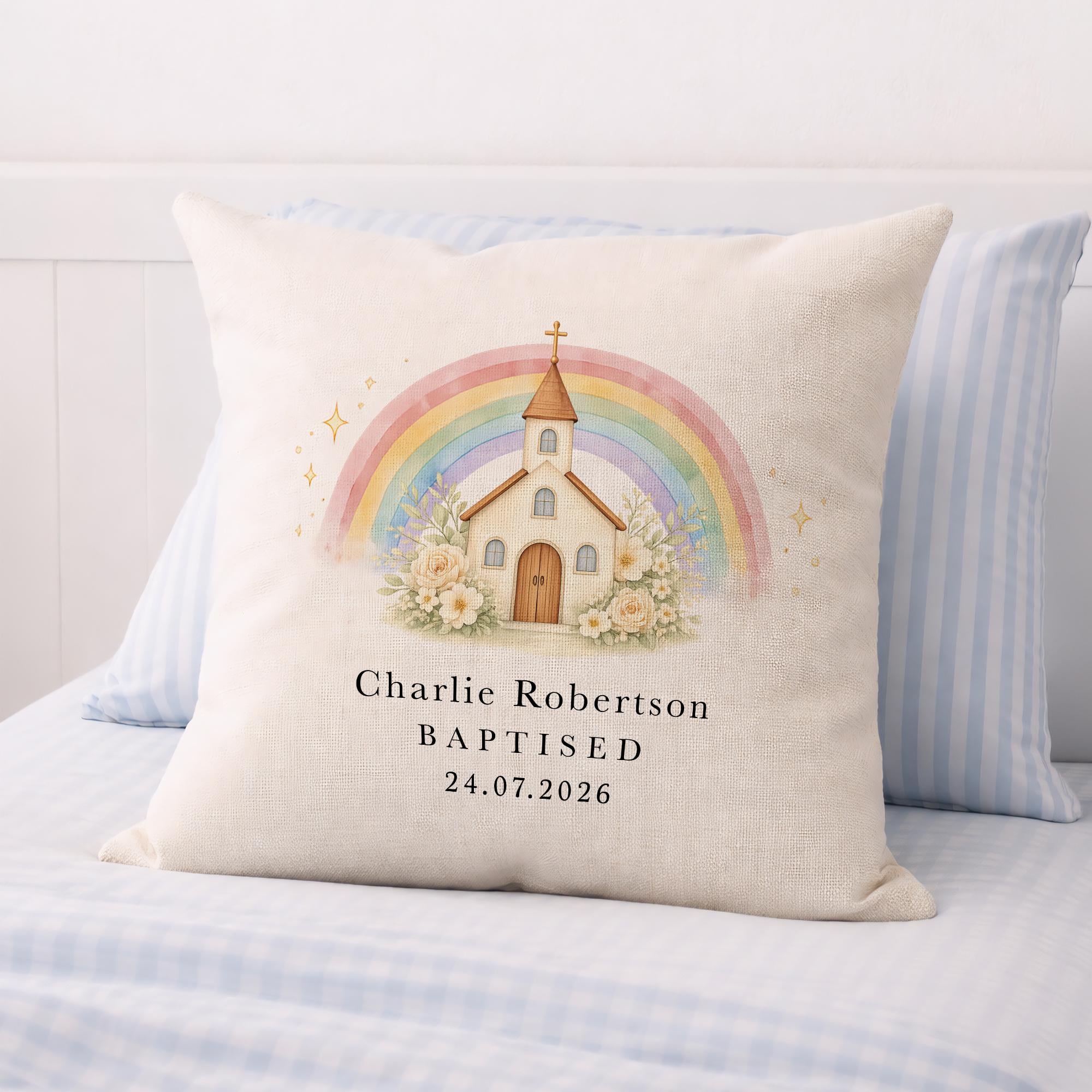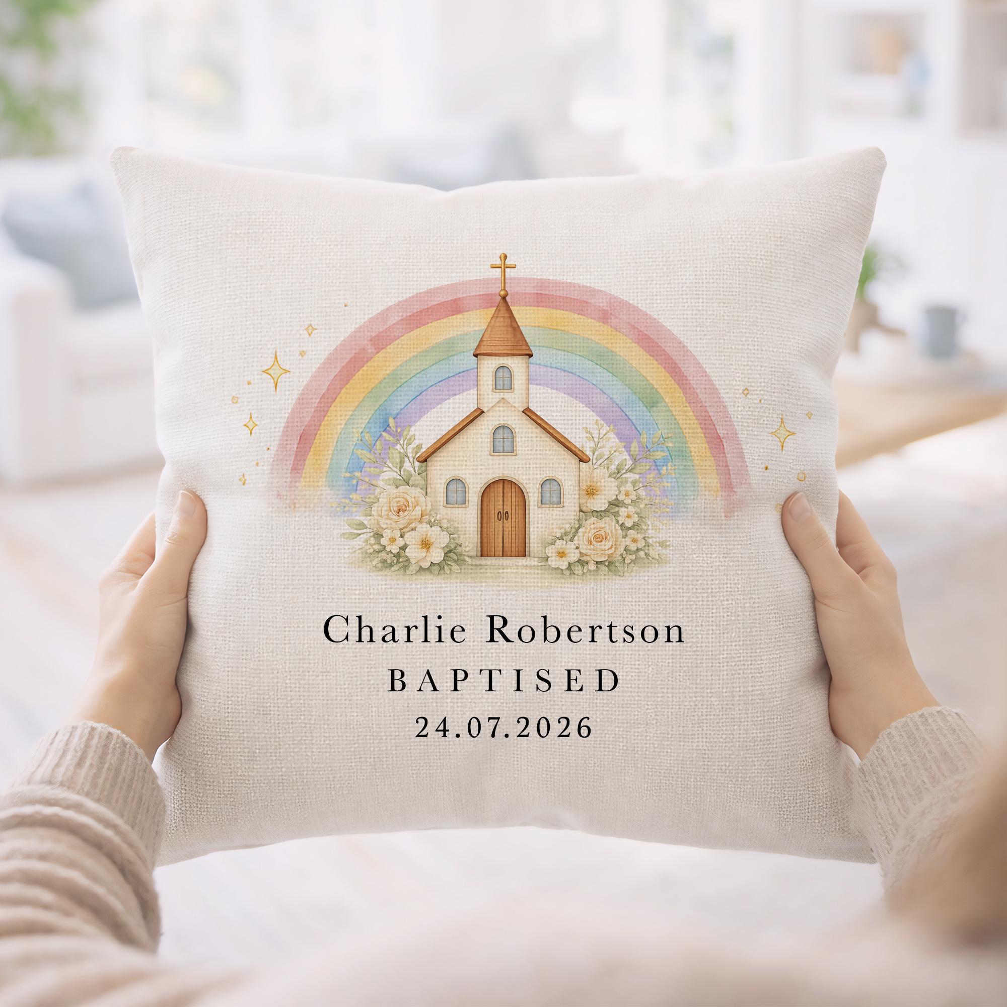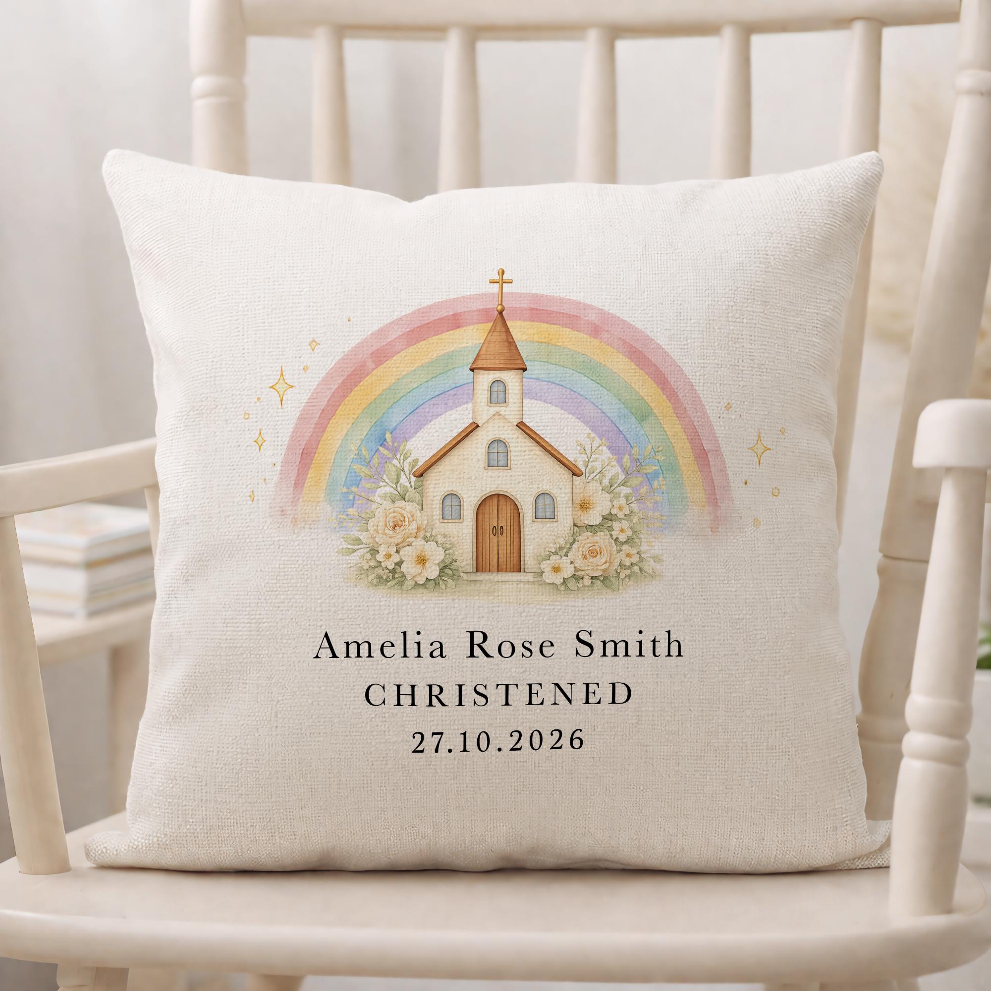 Personalised Christening Baptism Cushion Pillow Church & Rainbow Design