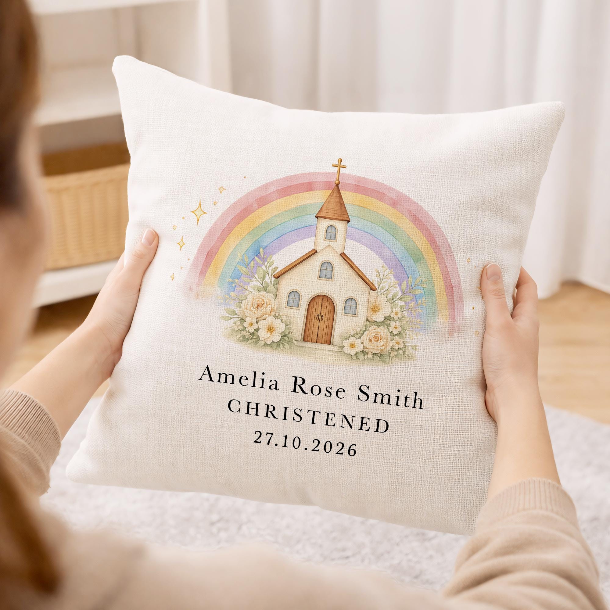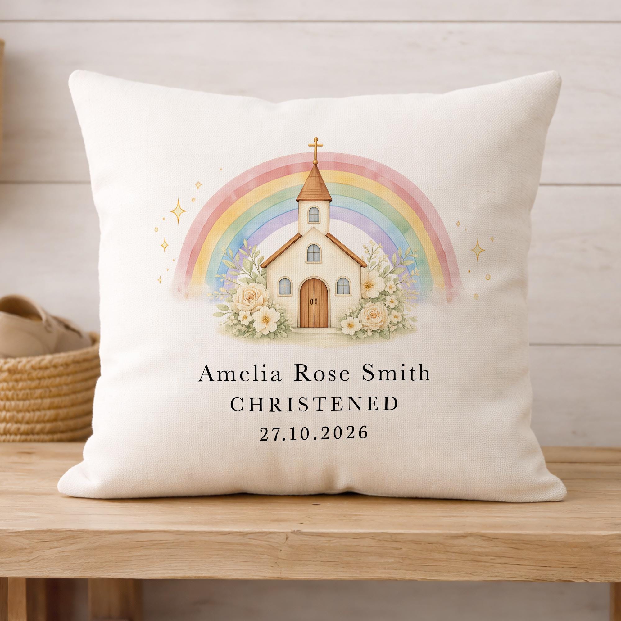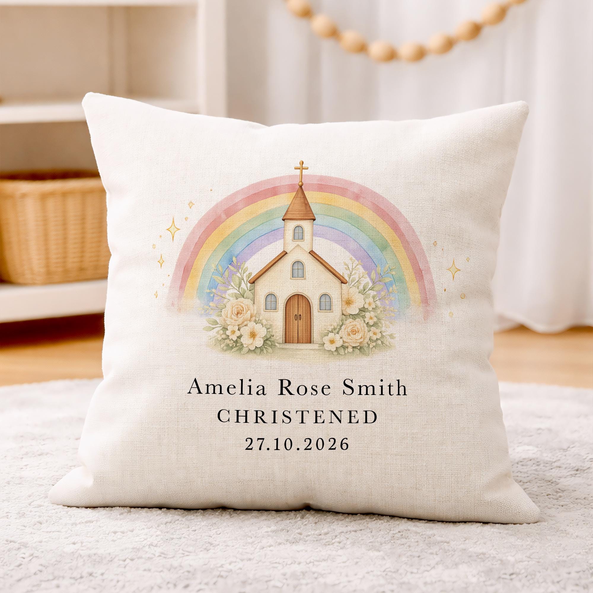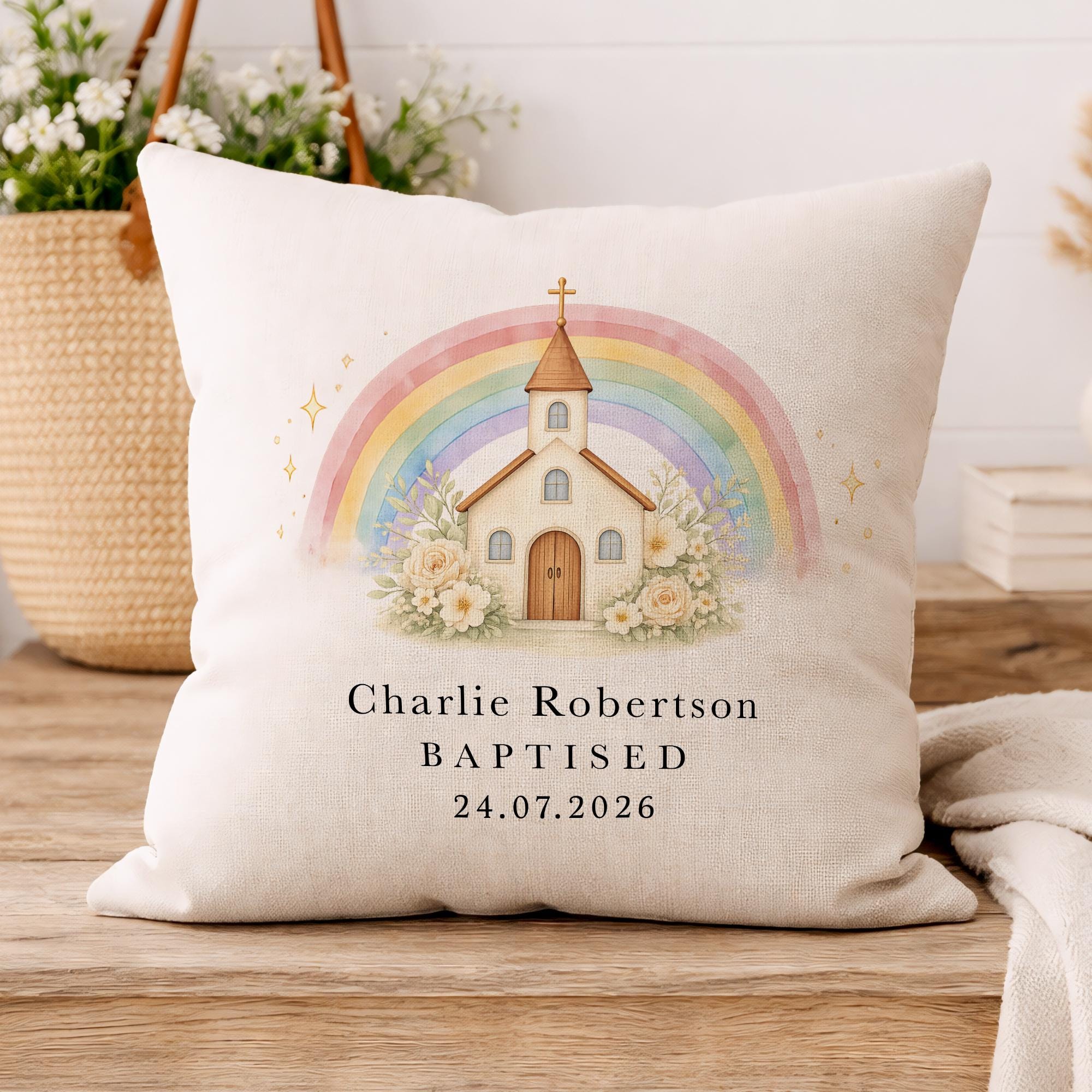 Personalised Christening Baptism Cushion Pillow Church & Rainbow Design