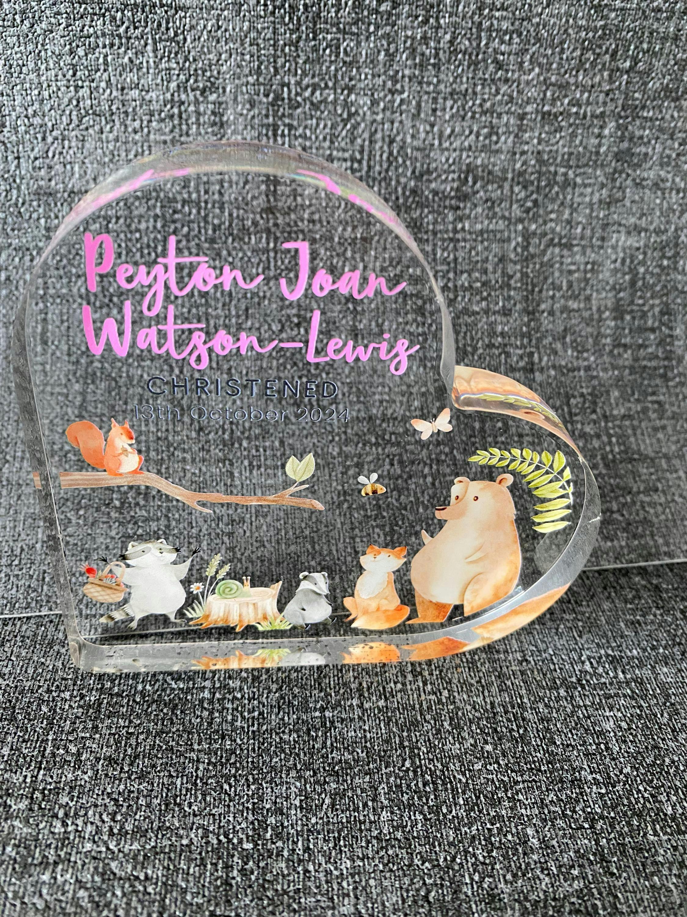 Personalised Christening Woodland Forest Animals Heart Plaque Gift