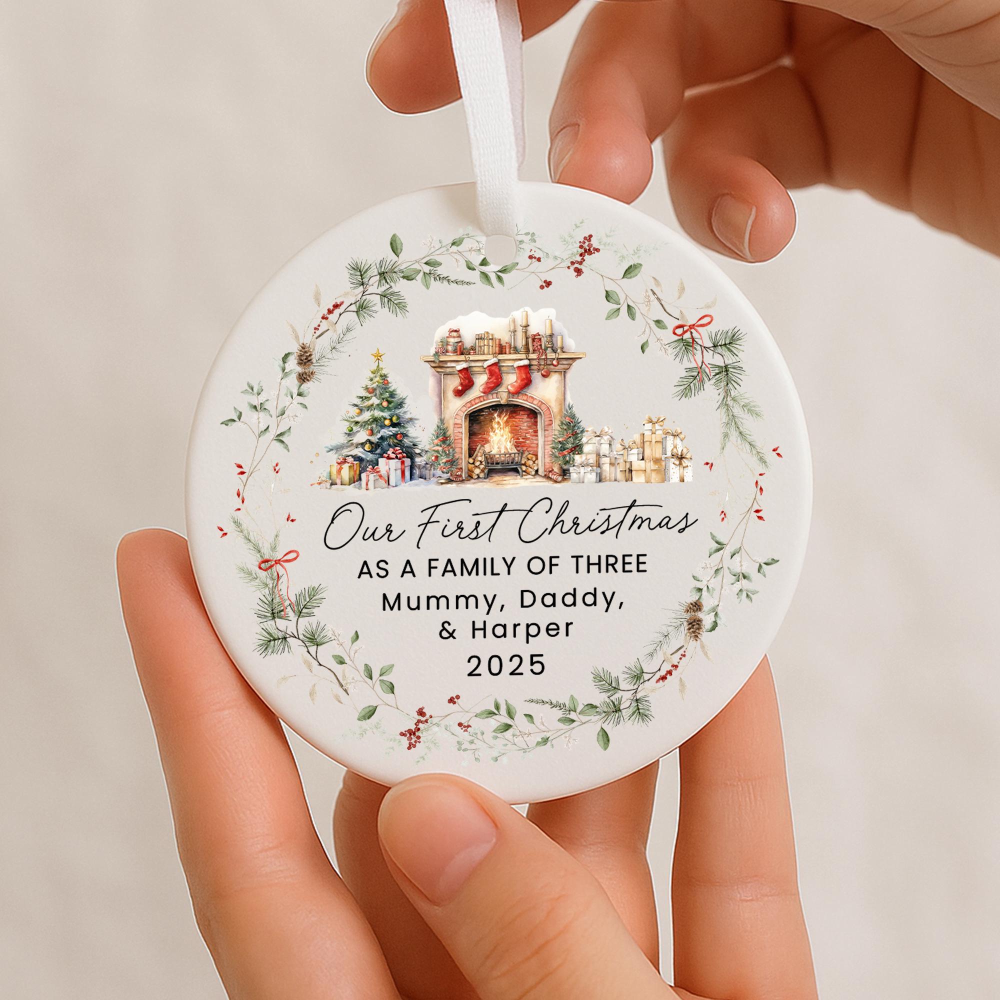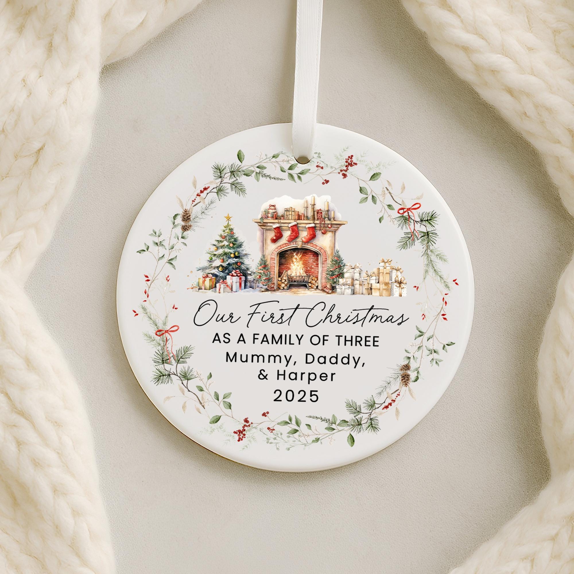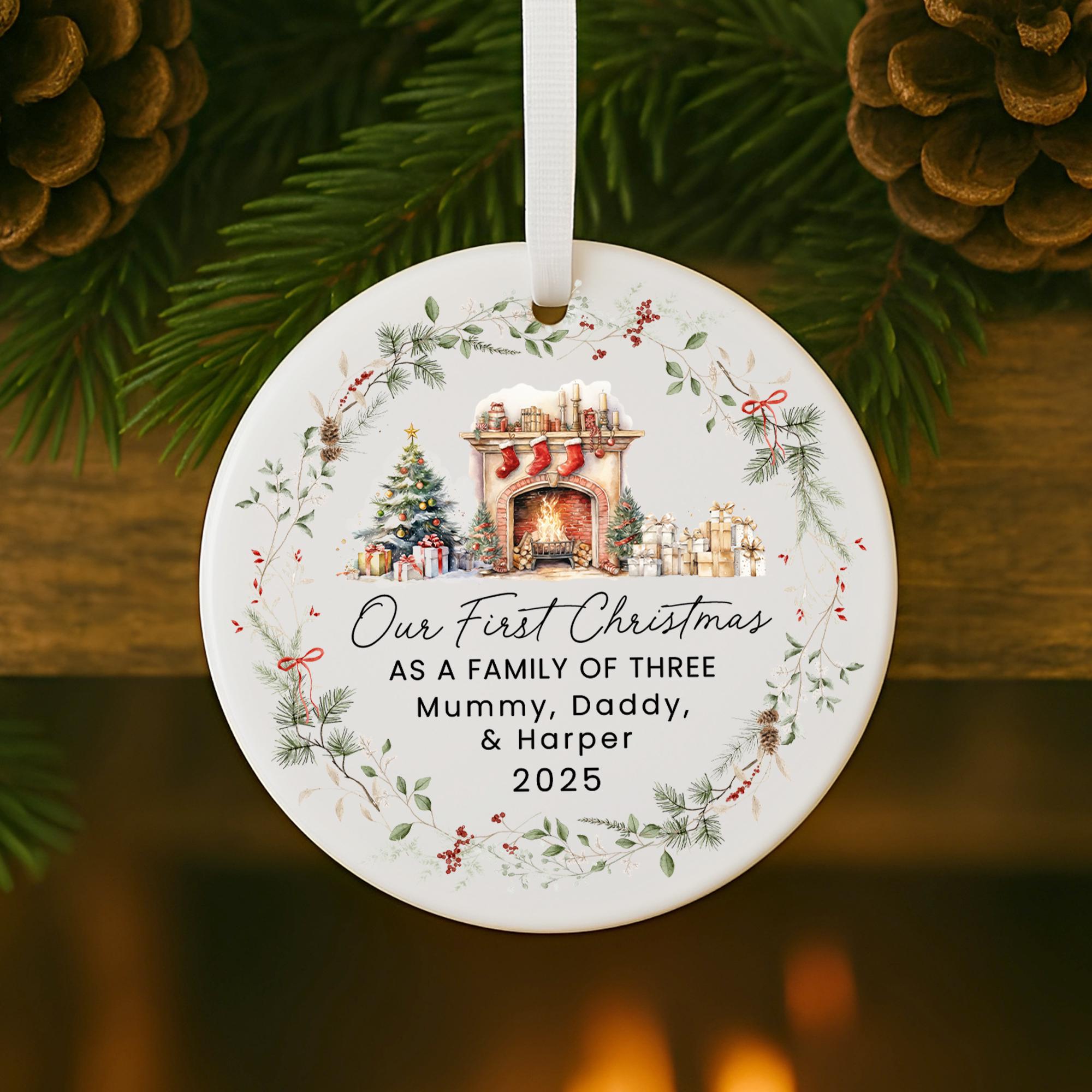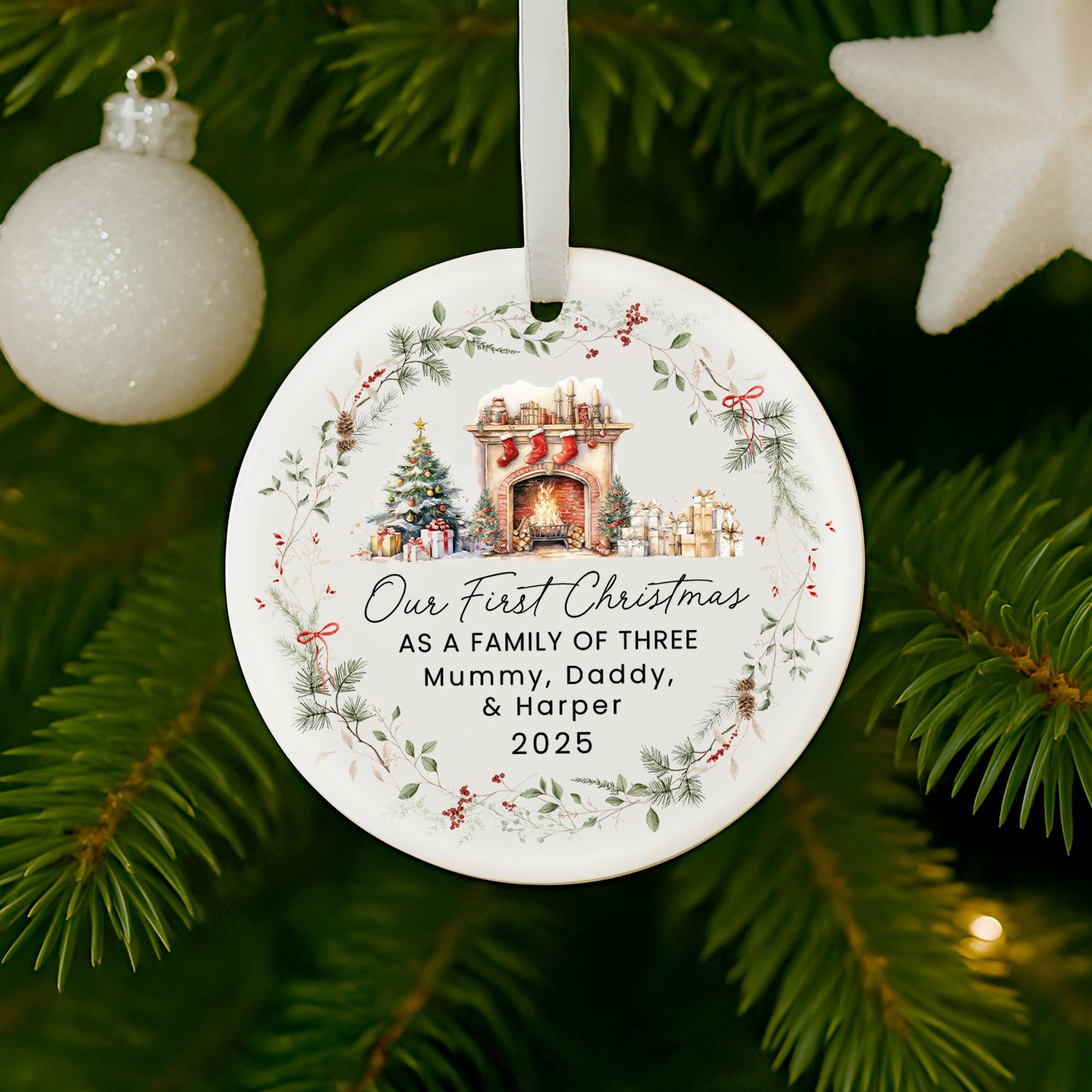 Personalised Cosy Home First Christmas as Family of 3 Bauble Ceramic Tree Ornament