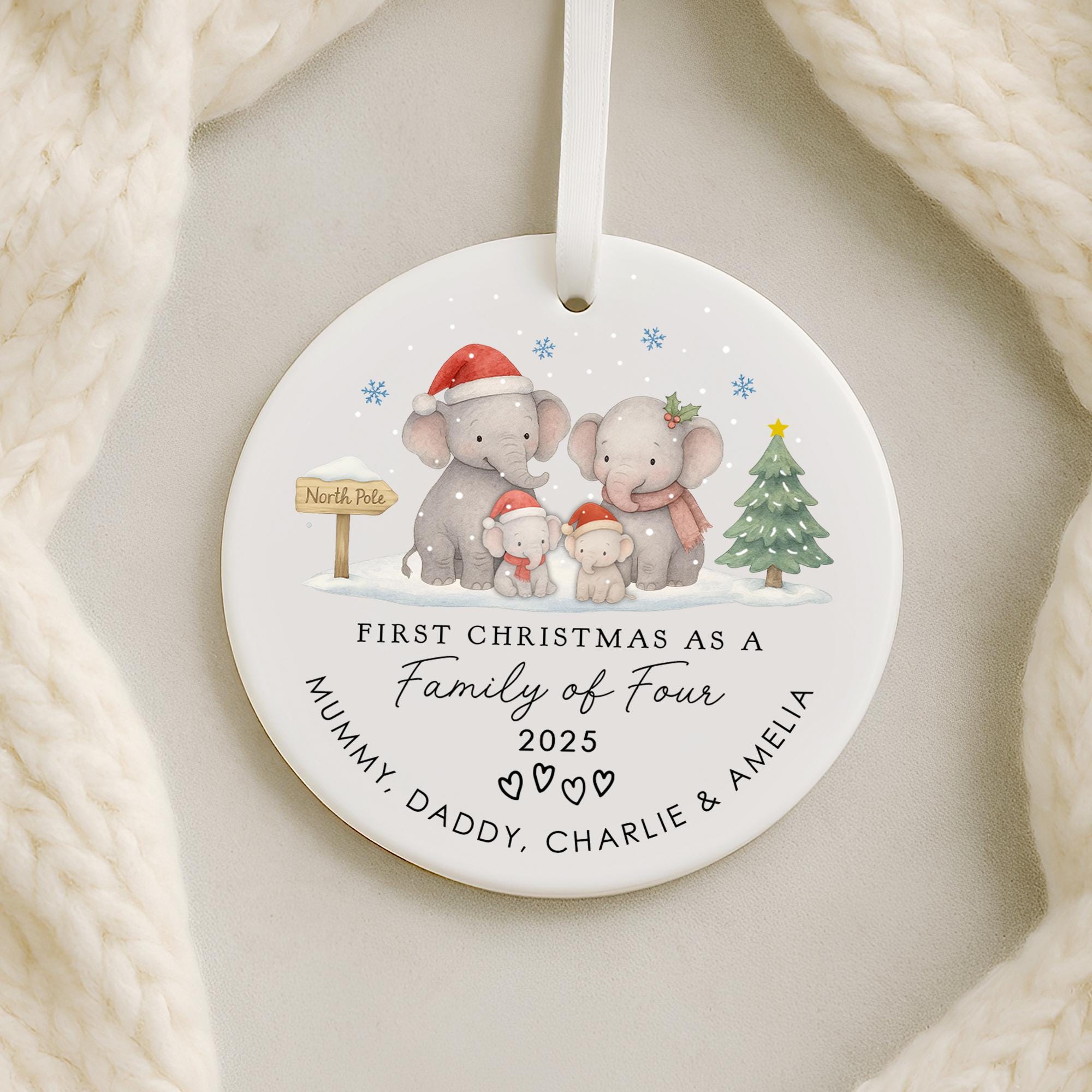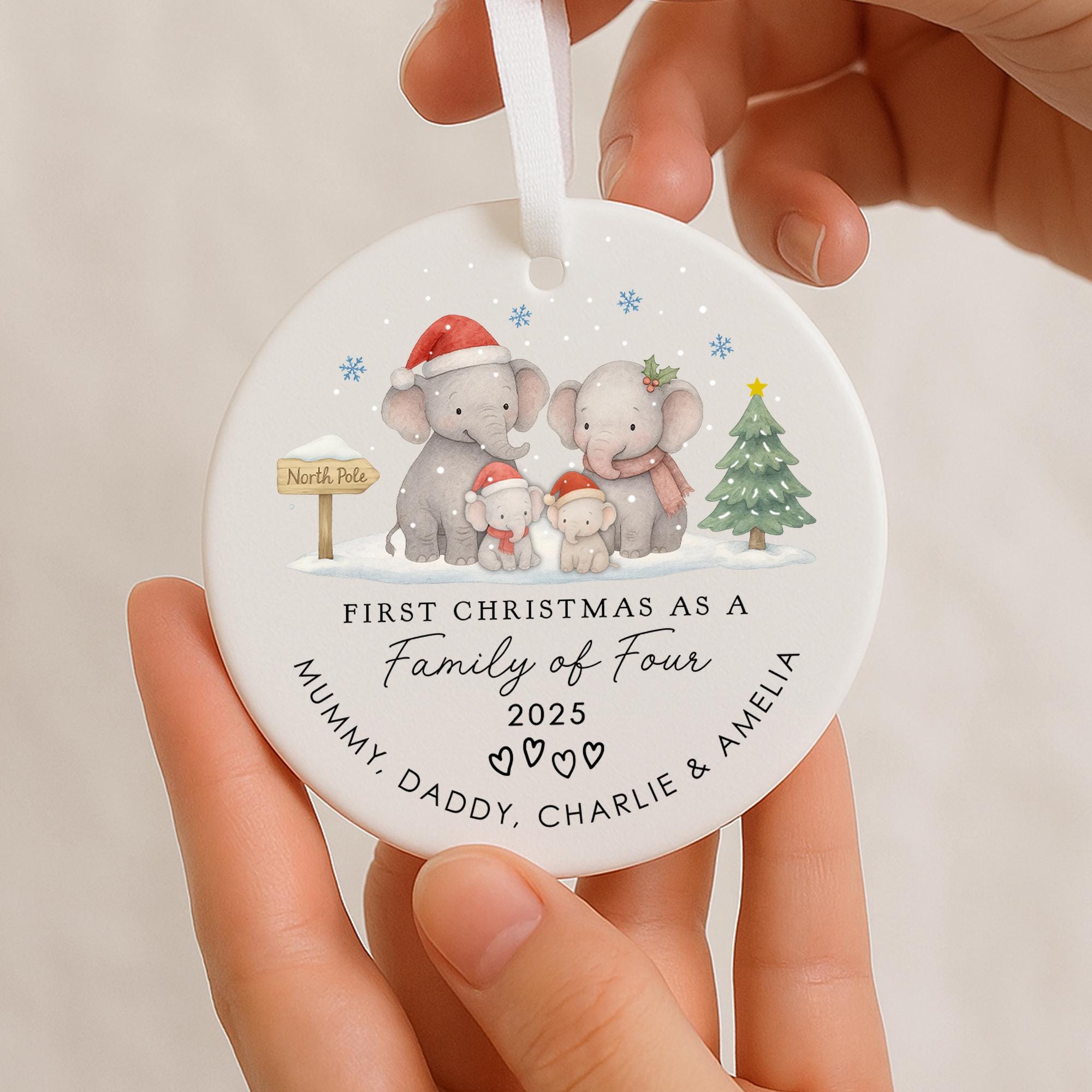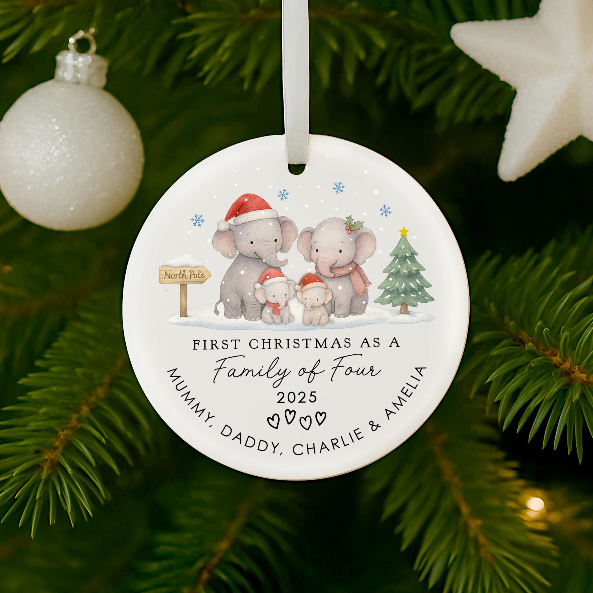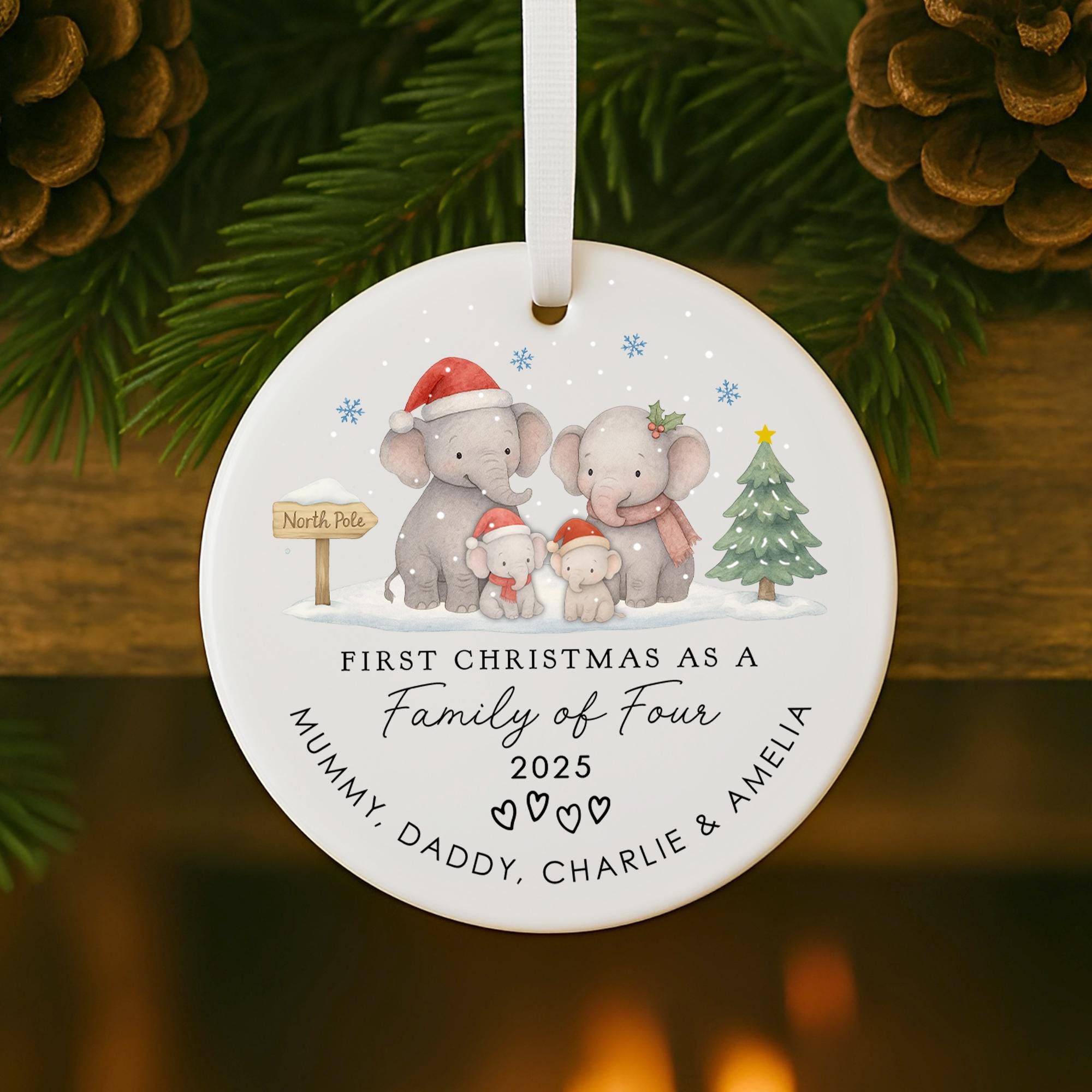 Personalised Elephant Family First Christmas as Family of 4 Bauble Ornament Keepsake Decoration