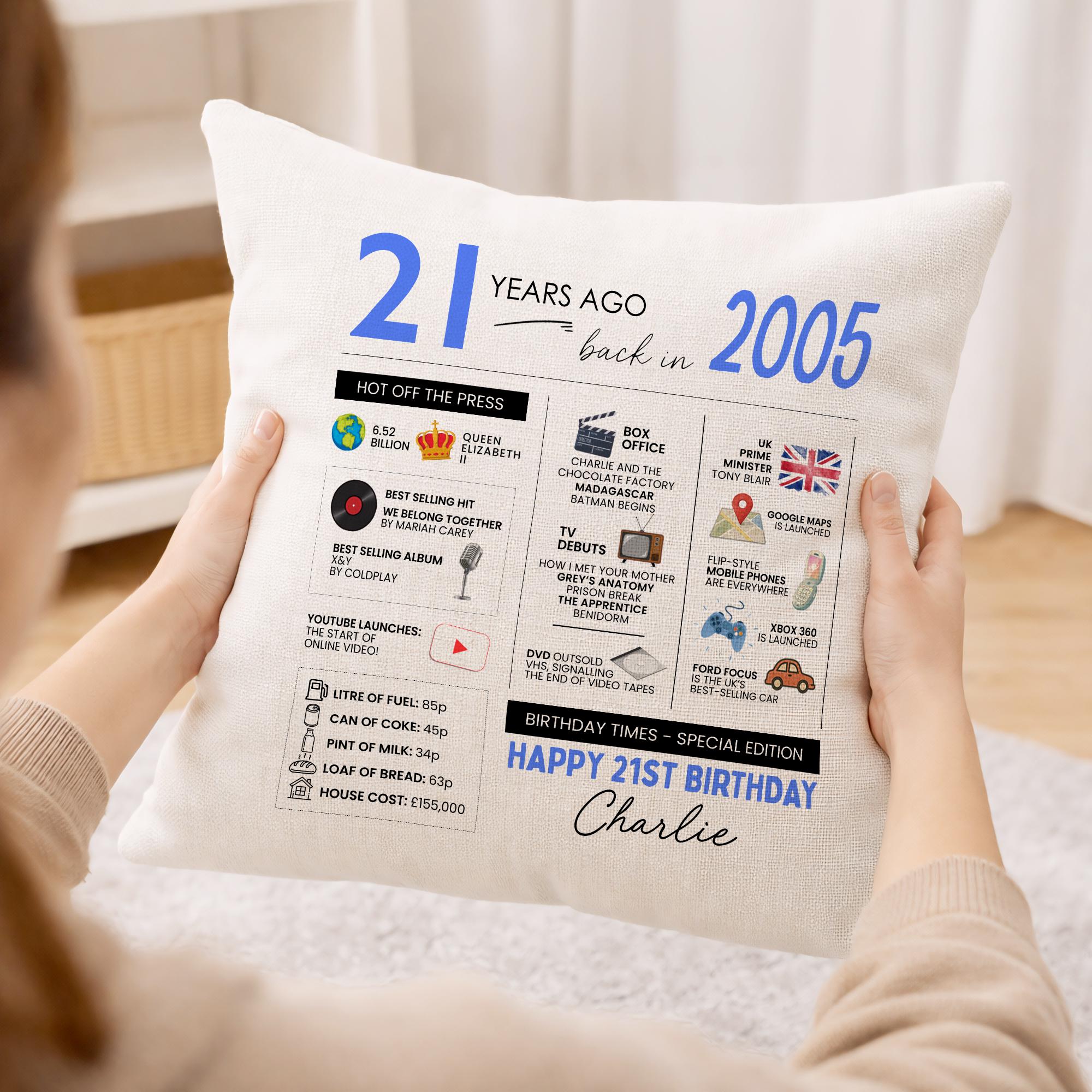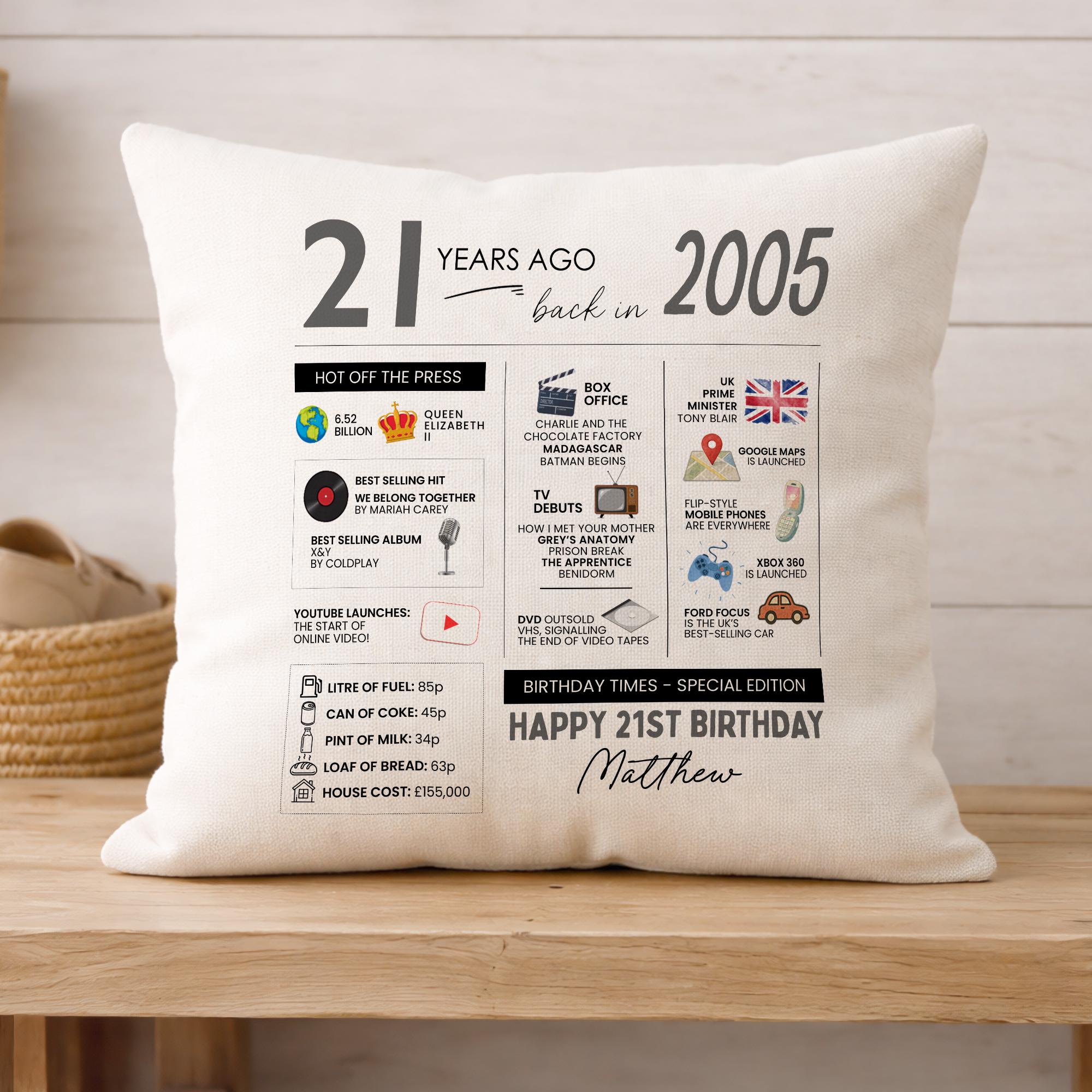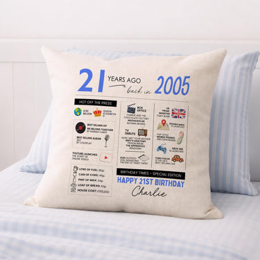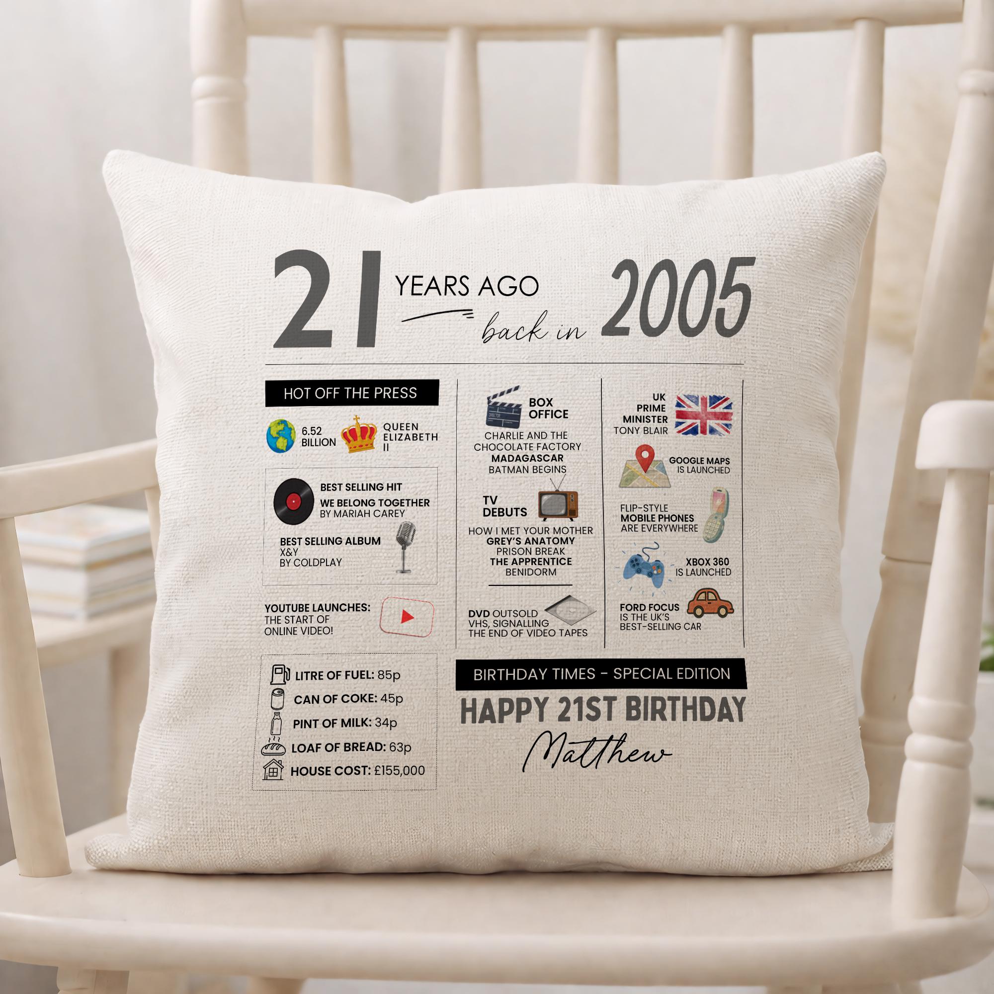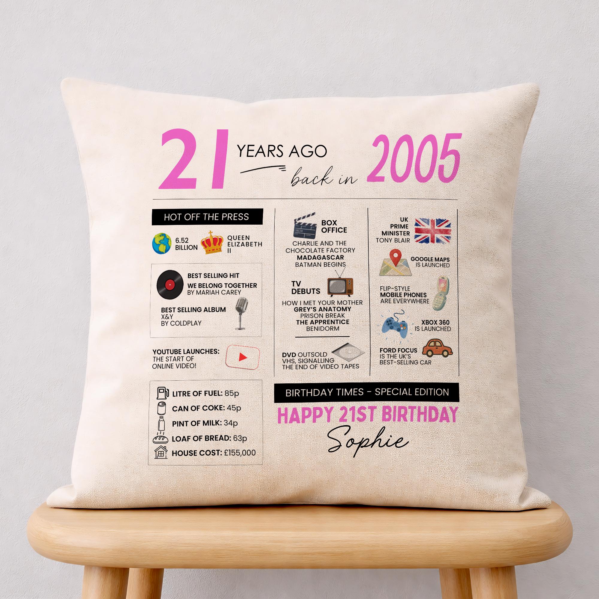Personalised Fun Facts 21st Birthday Cushion Born in 2005 Gift