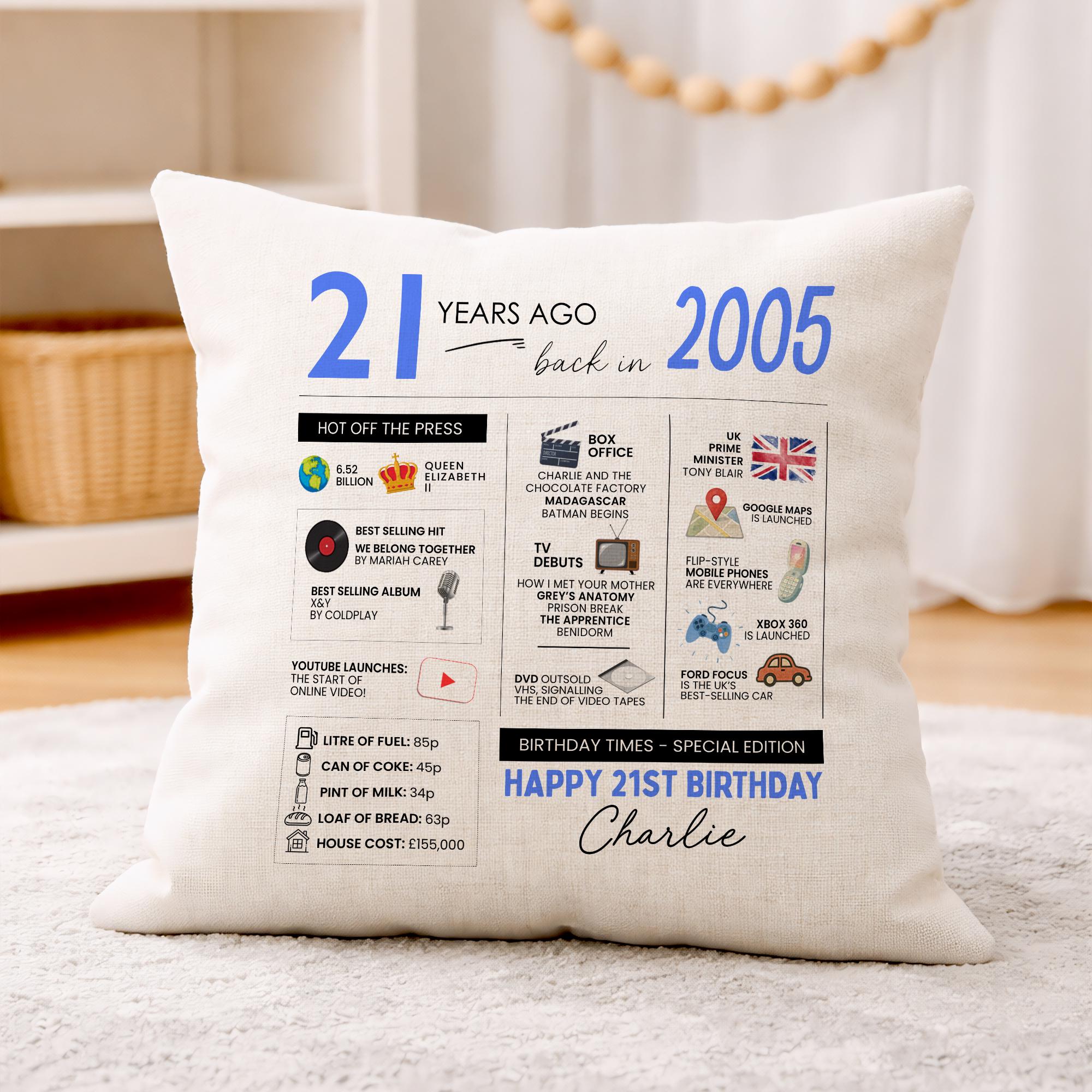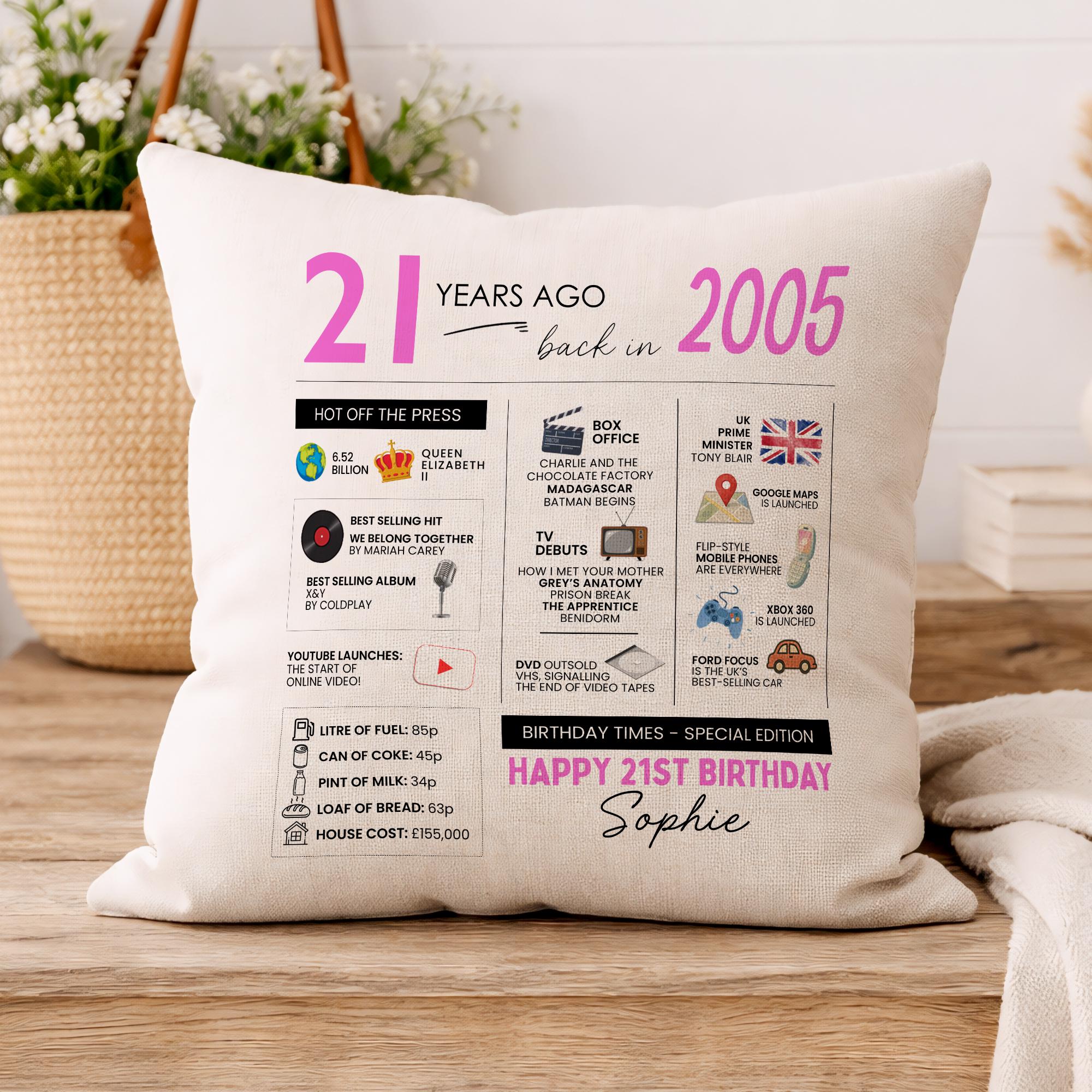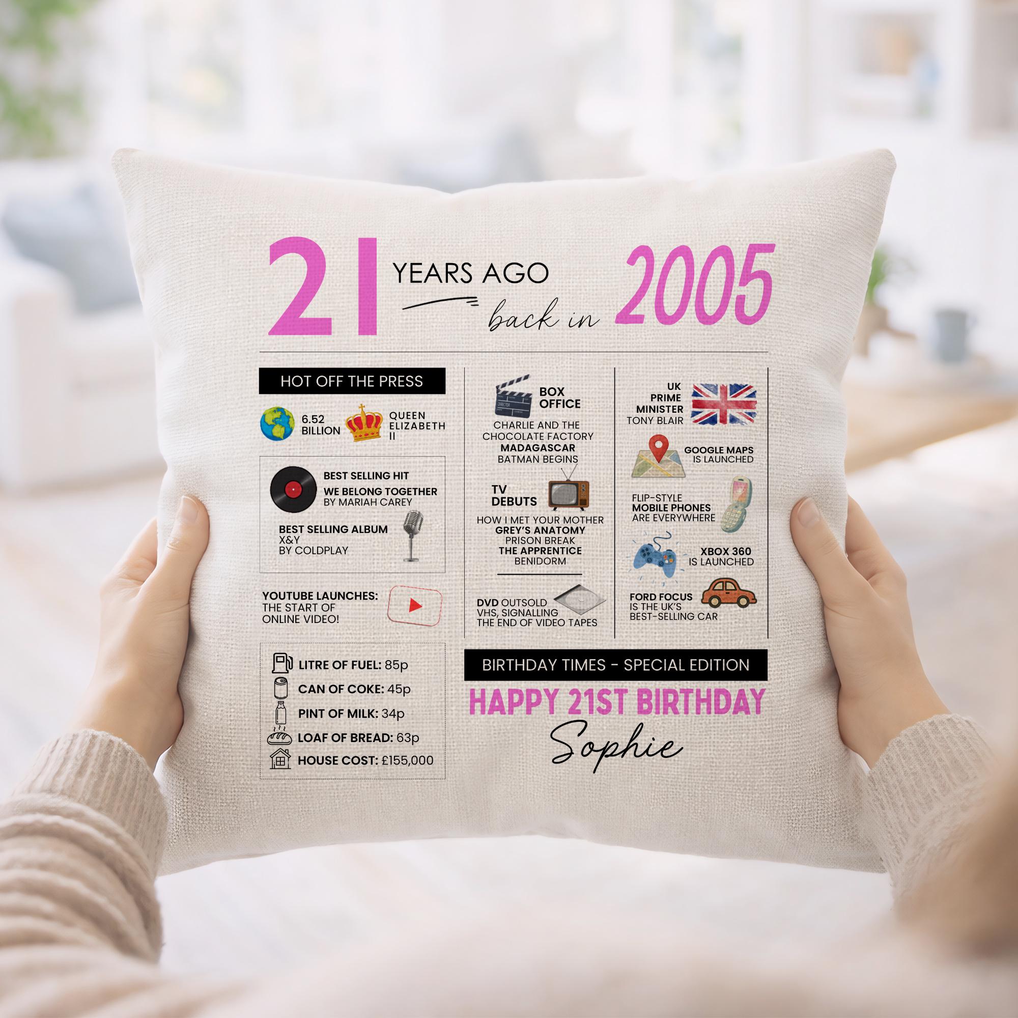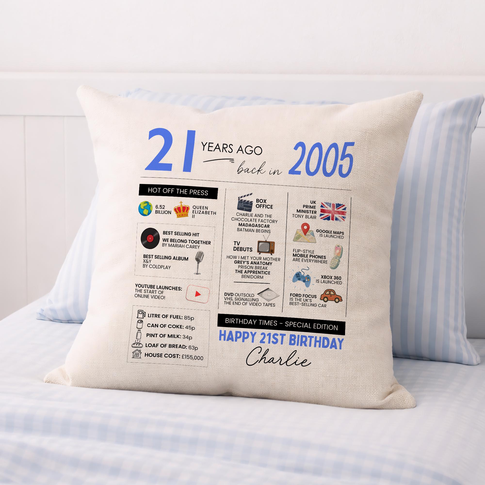 Personalised Fun Facts 21st Birthday Cushion Born in 2005 Gift