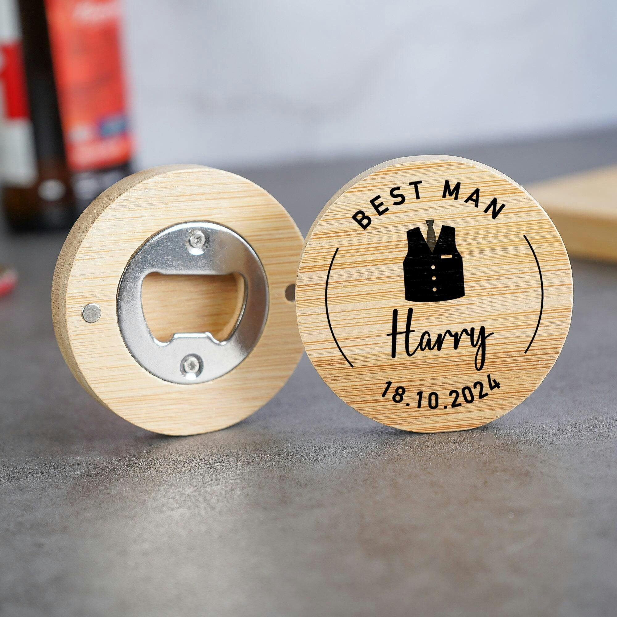 A beautiful personalised sturdy natural wood finished with a stainless steel top bottle opener on the other side perfect for the wedding party.