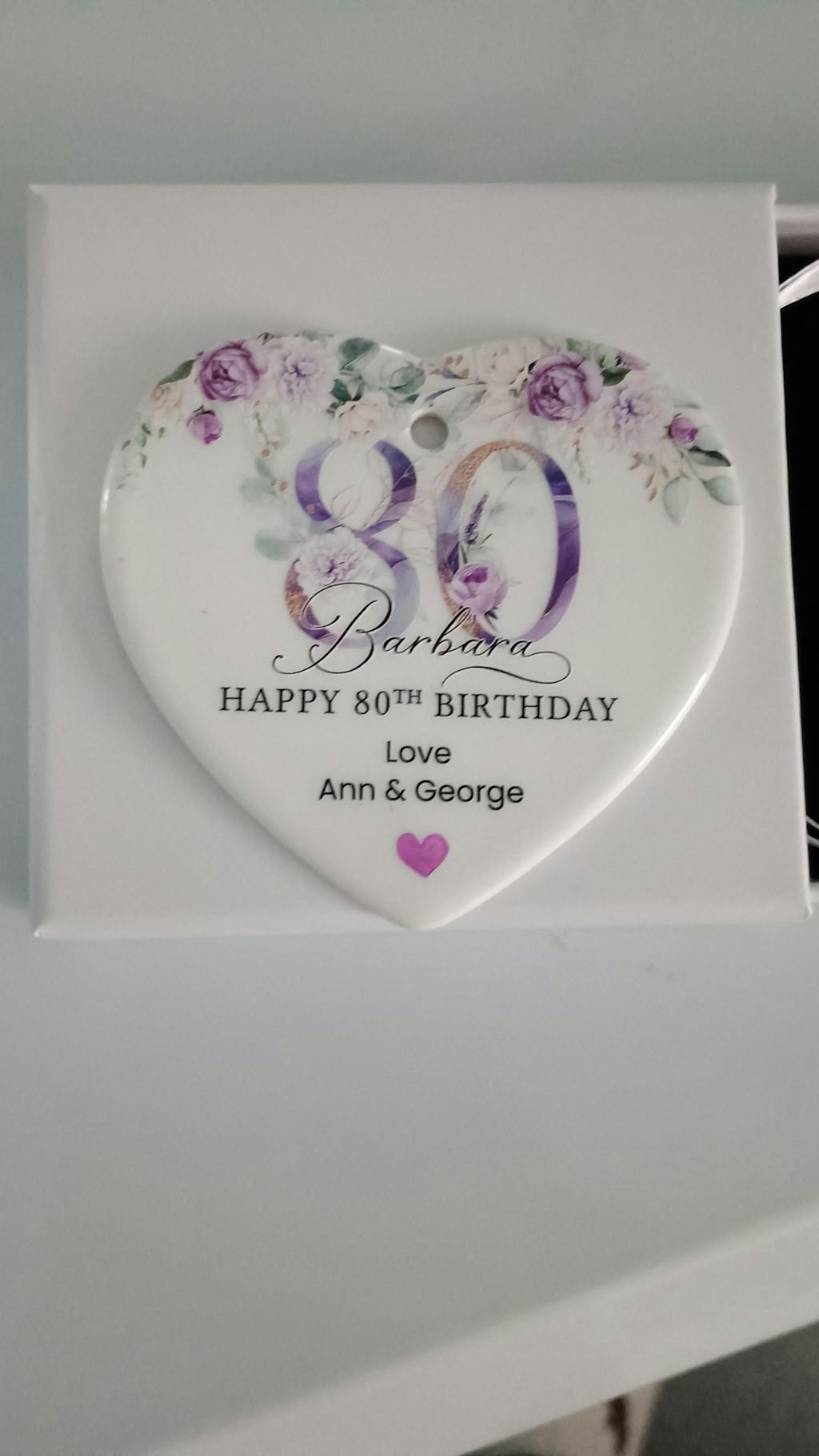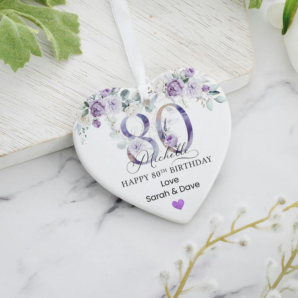 Personalised Purple Floral Happy 80th Birthday Heart Ceramic Keepsake