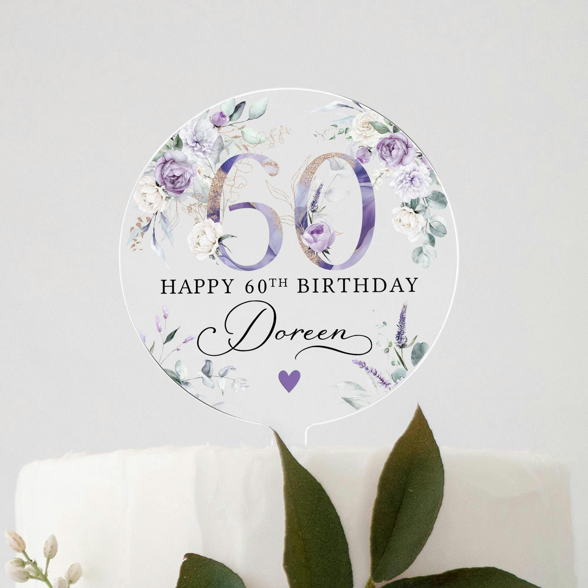 Personalised Purple Floral Happy Birthday Cake Topper - 18th 21st 30th 40th 50th 60th 70th Birthday