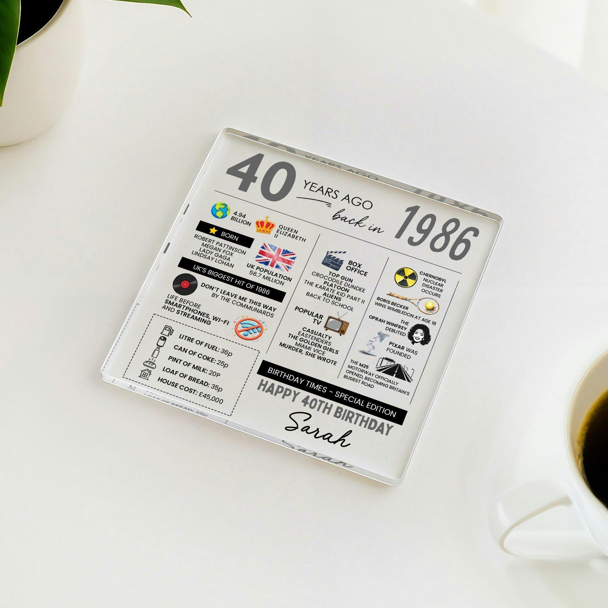 Personalised 40th Birthday Coaster 1986 Fun Facts Gift